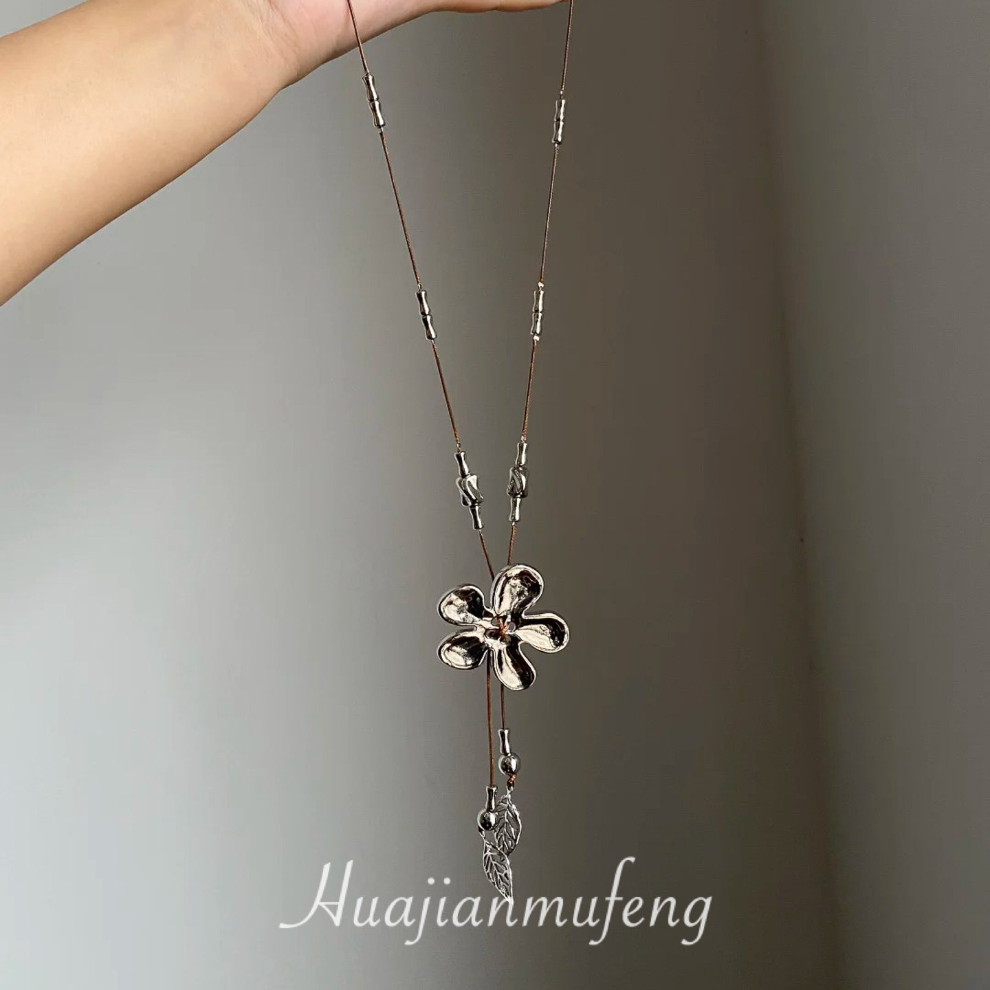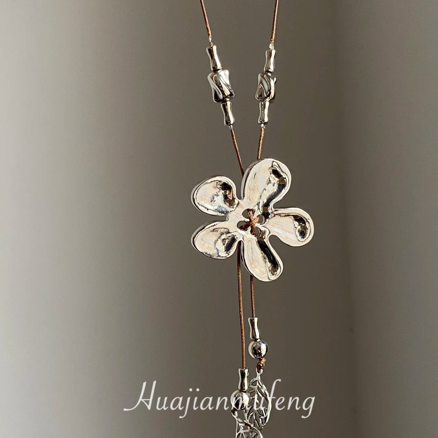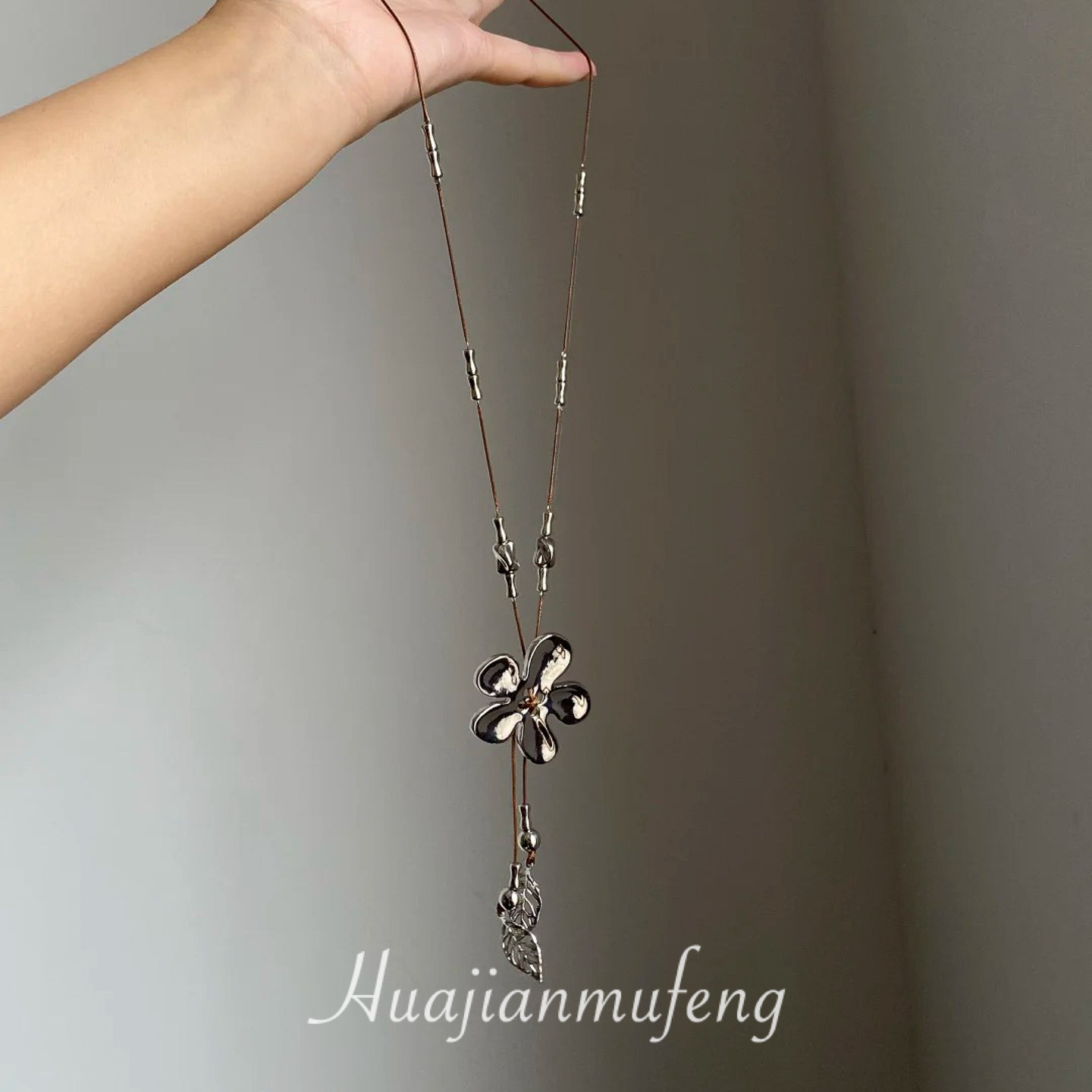 工業風~復古做舊編繩銀色花朵流蘇項鍊小衆設計毛衣鏈甜酷風配飾