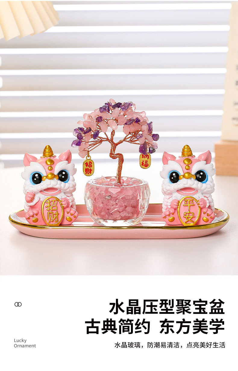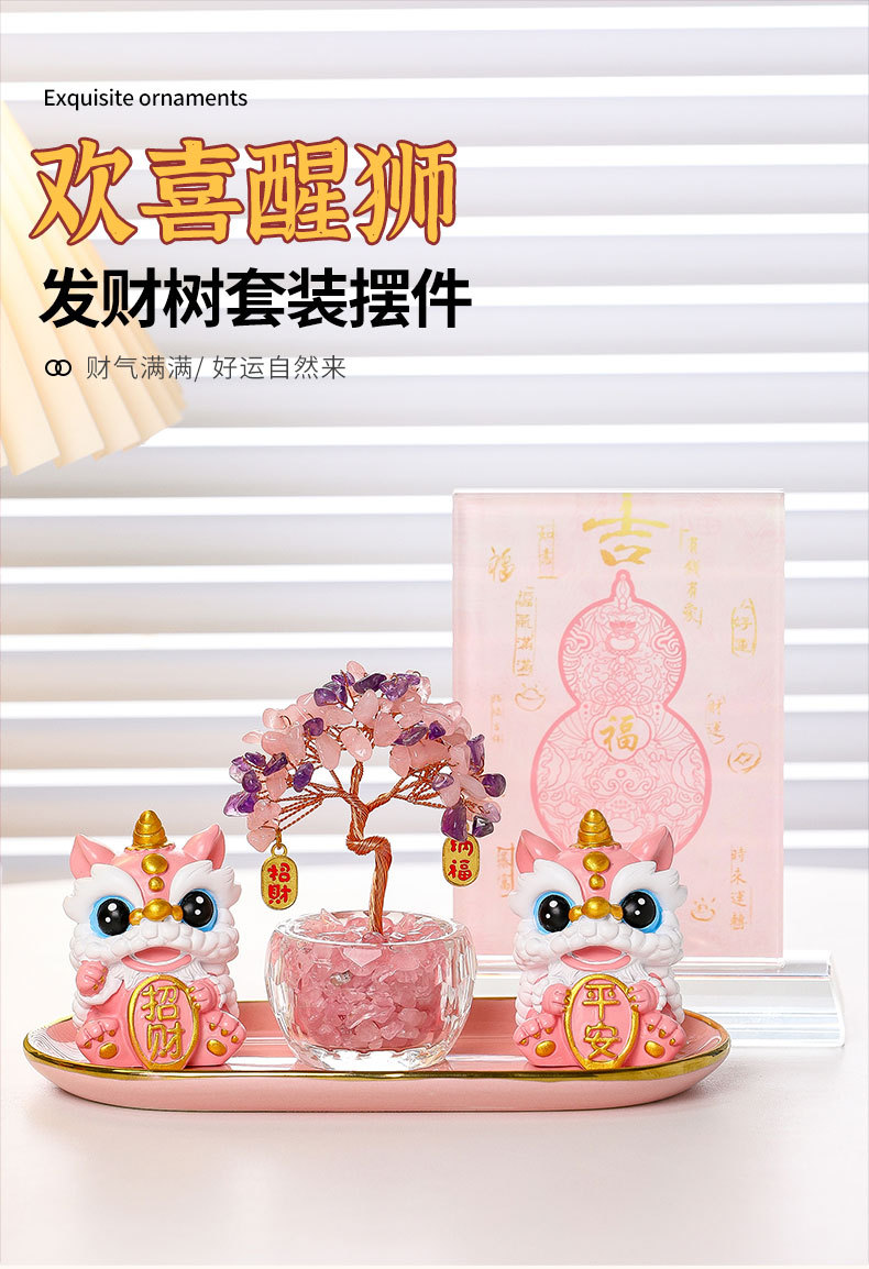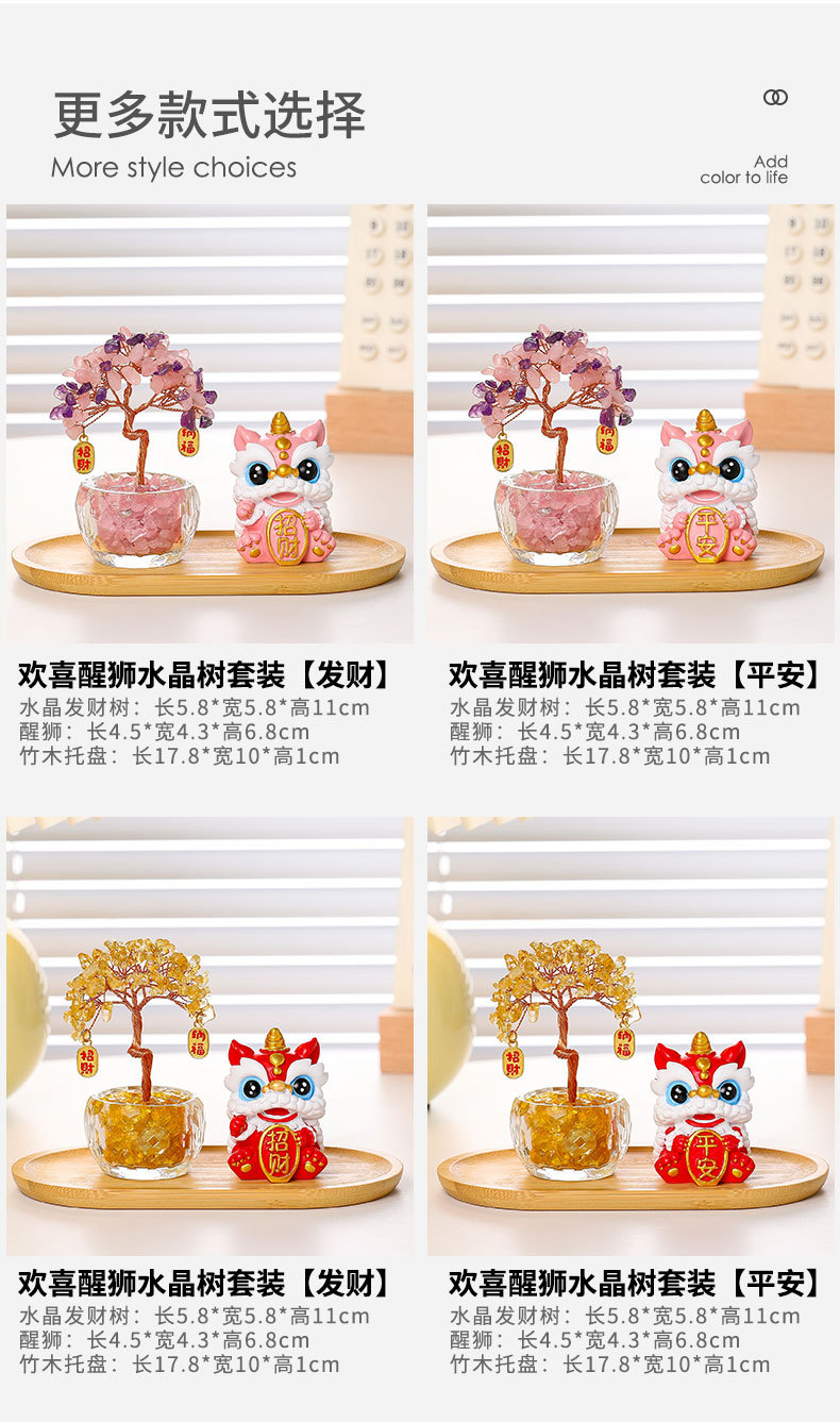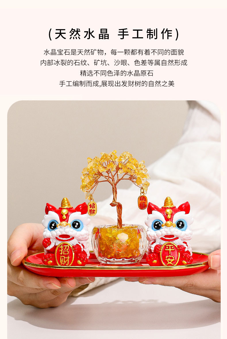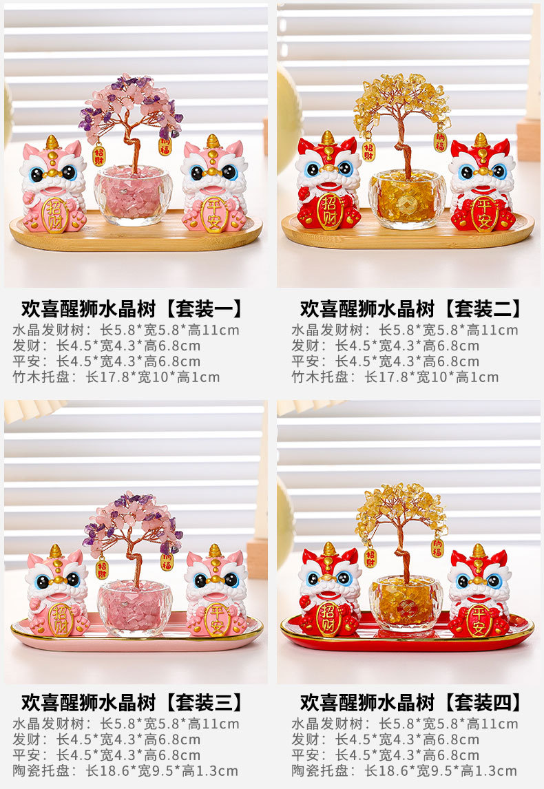 卡通歡喜醒獅水晶發財樹家居客廳辦公室裝飾擺件創意喬遷新居禮品