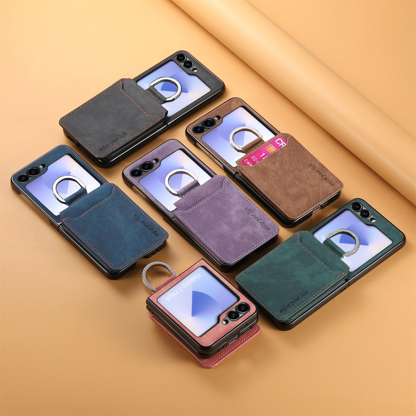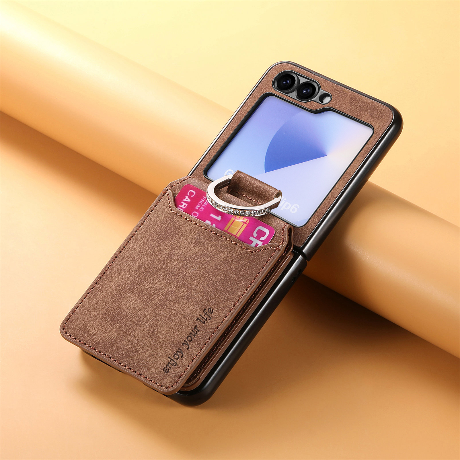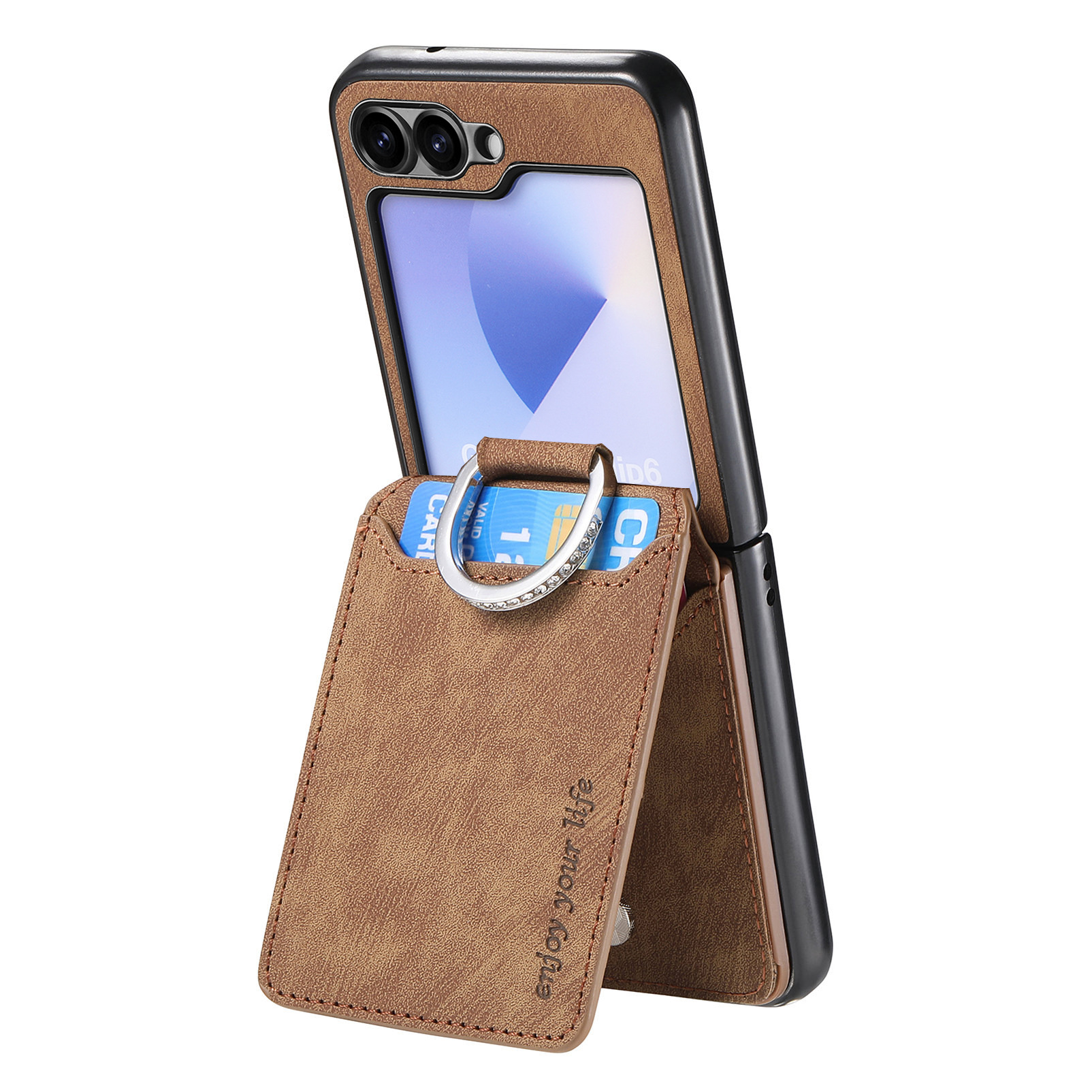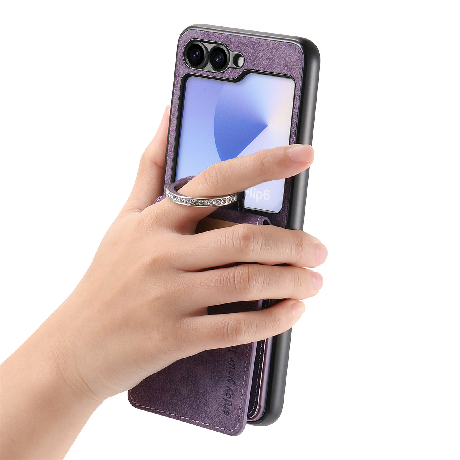 適用三星ZFlip7商務復古摺疊螢幕手機殼鑲鑽指環釦zflip7插卡皮套
