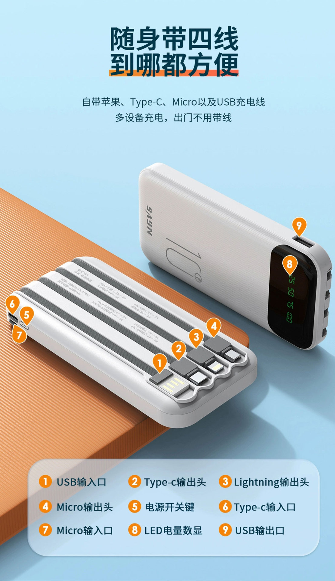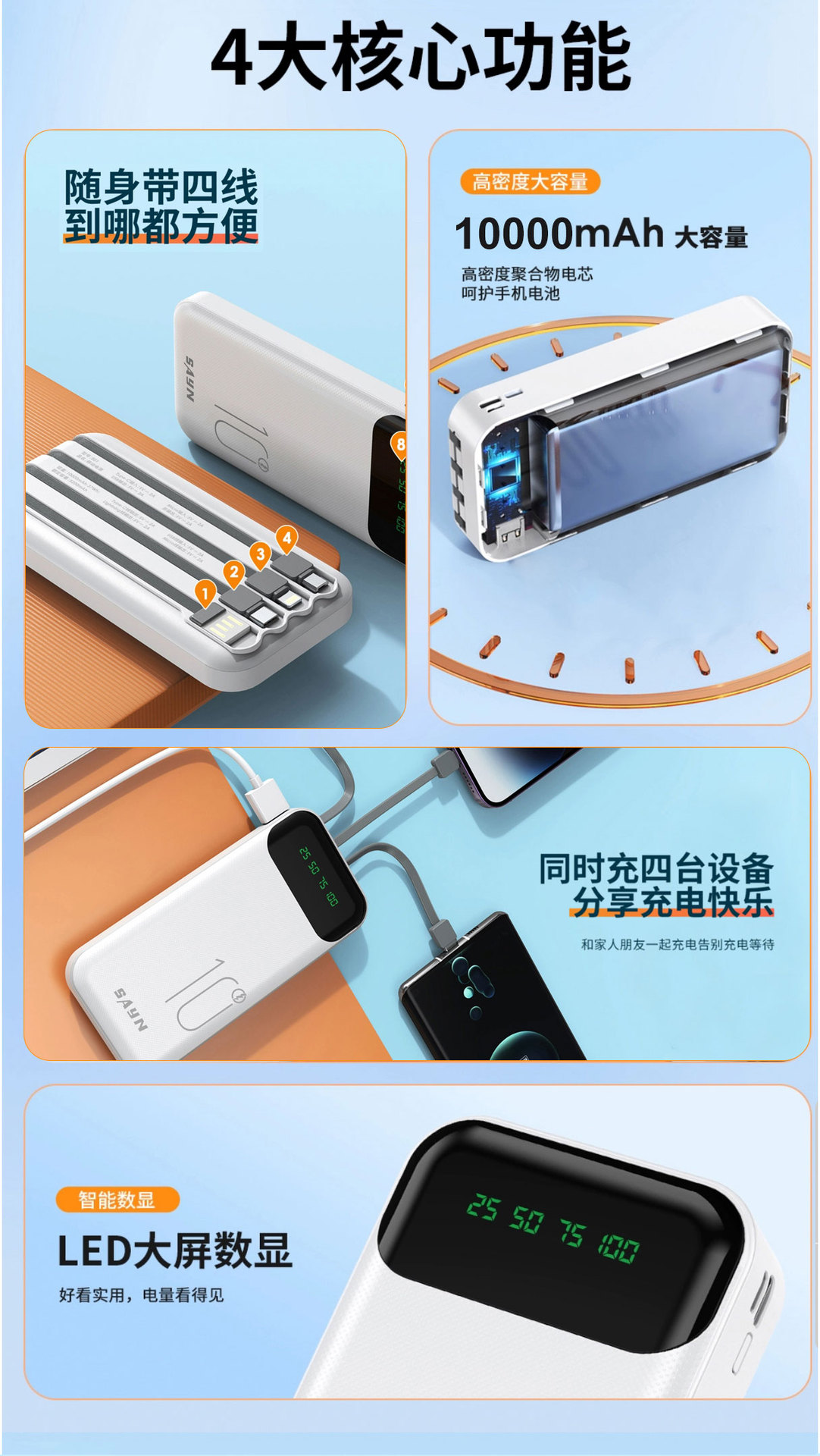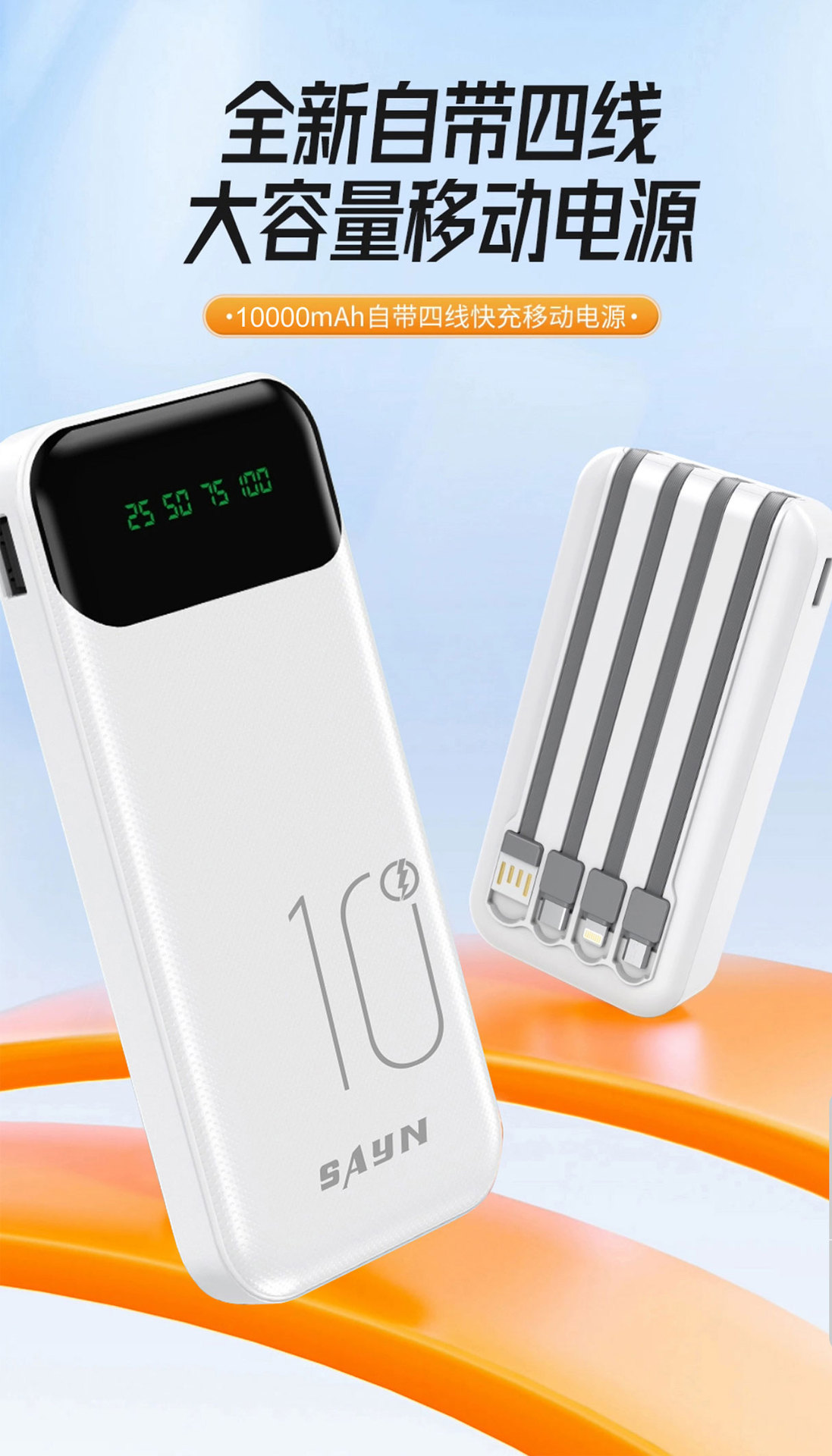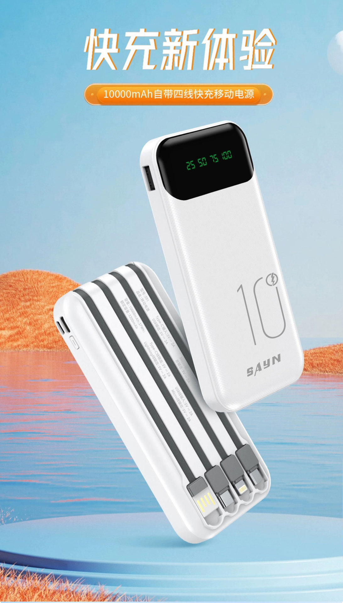 3C認證新品10000安培自帶4線 大容量數顯行動電源超級快充行動電源