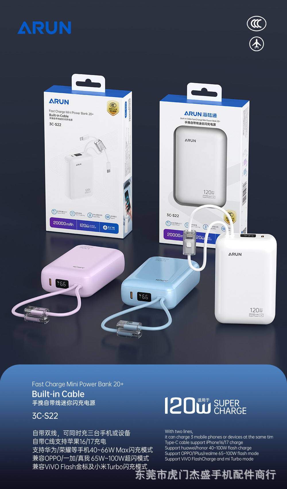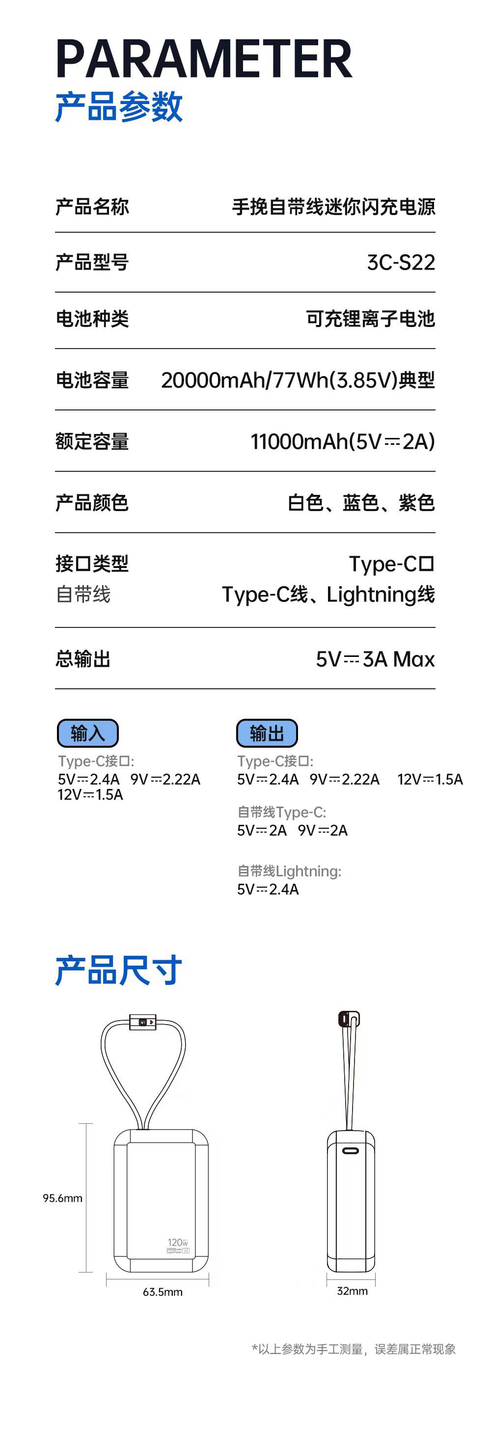 | 型號 | S22手挽自帶線迷你閃充電源 白色 |