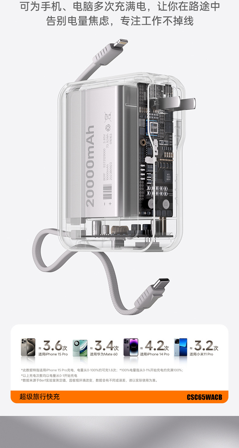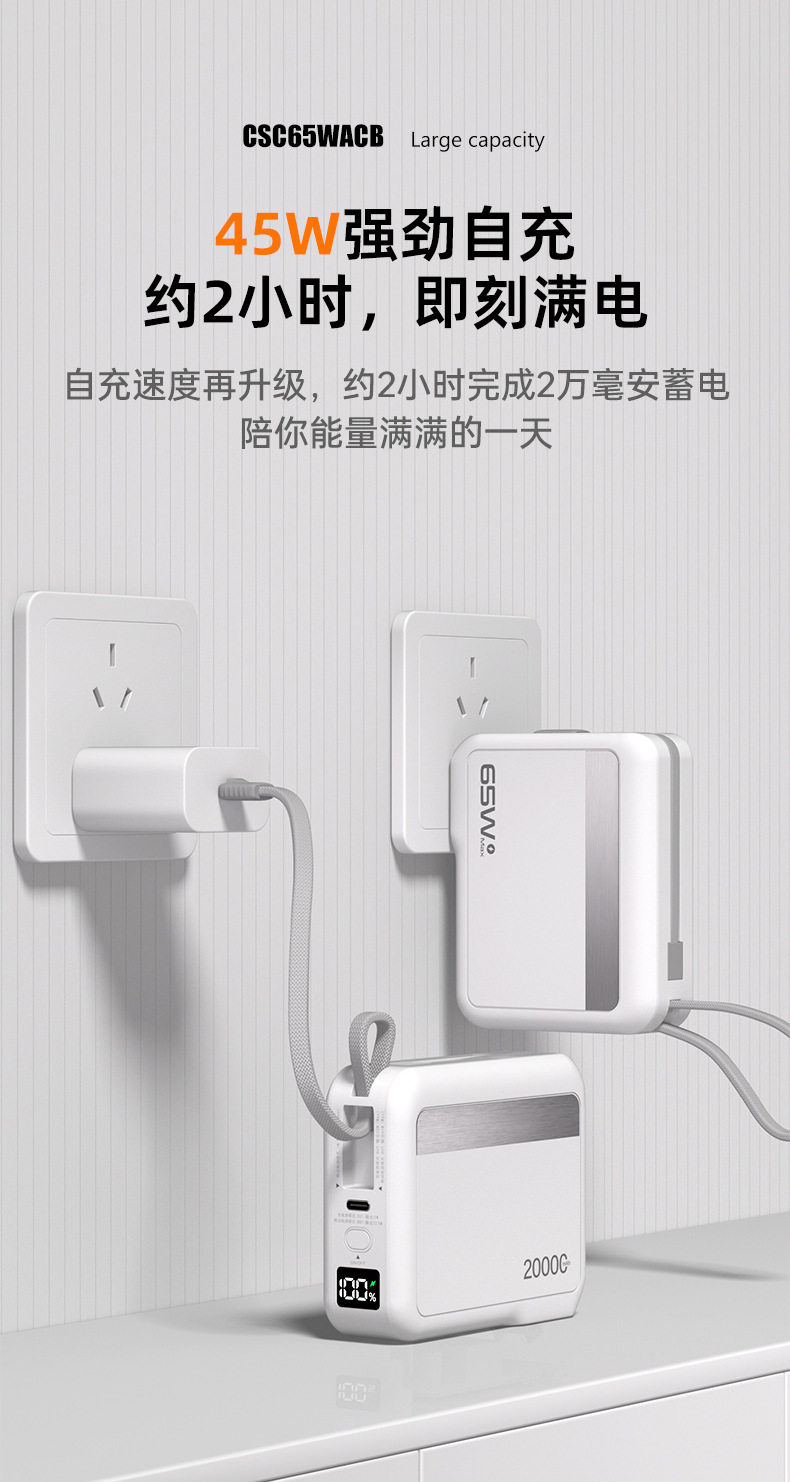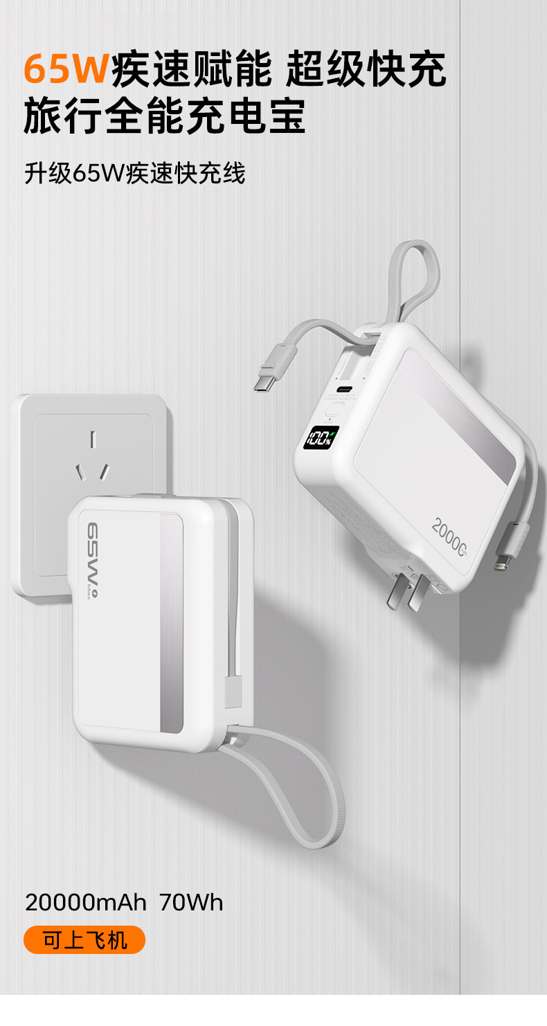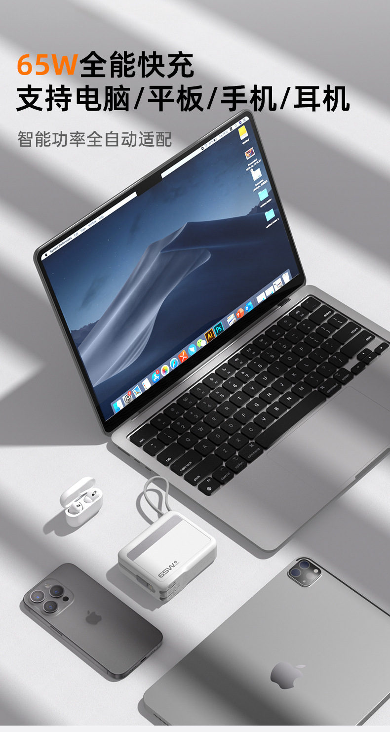 A65w超級快充戶外行動電源筆記型電腦行動電源自帶插頭數顯20000毫