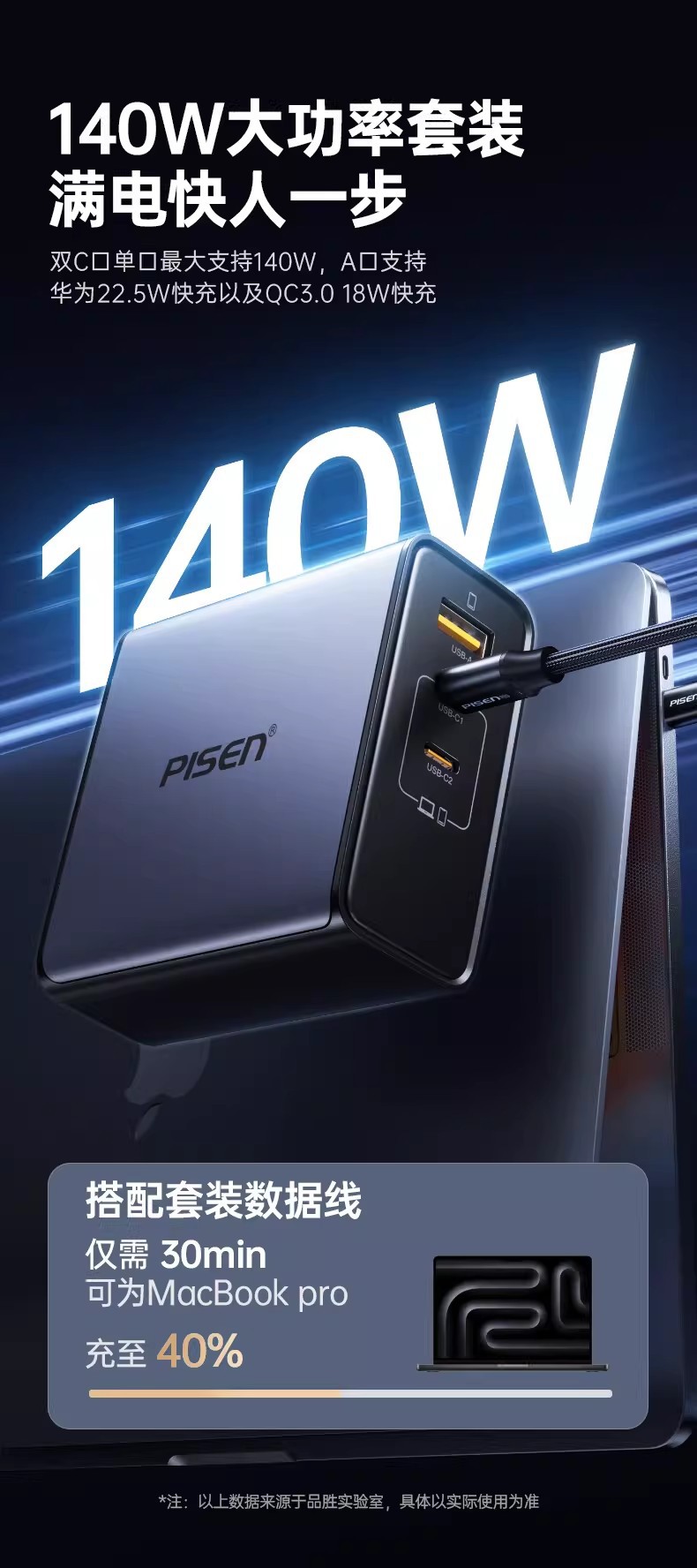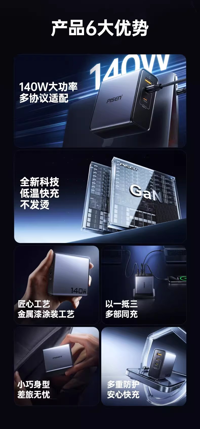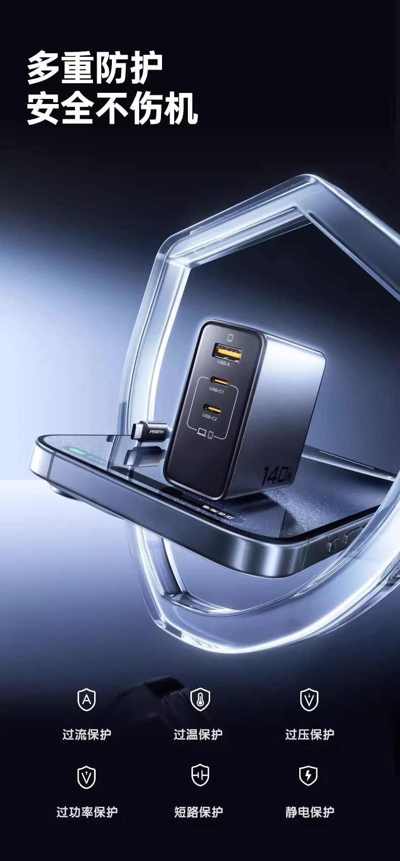 品勝GaN氮化鎵充電器140W快充套裝PDtypec四口沖手機平板大功率17