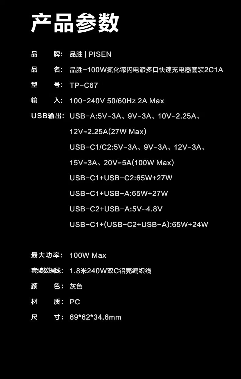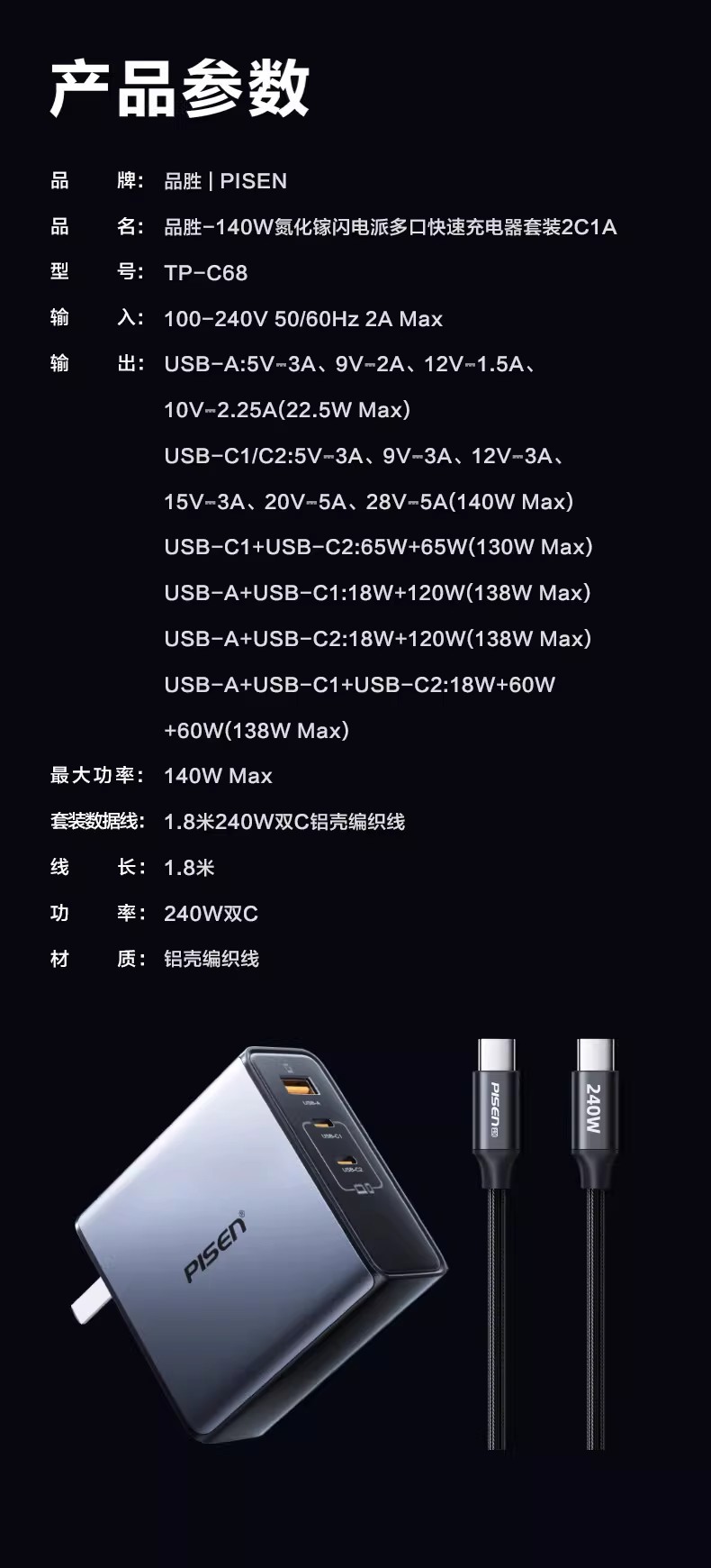 品勝 140W氮化鎵閃電湃多口快速充電器套裝2C1A(TP-C68