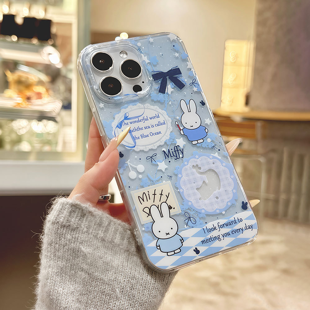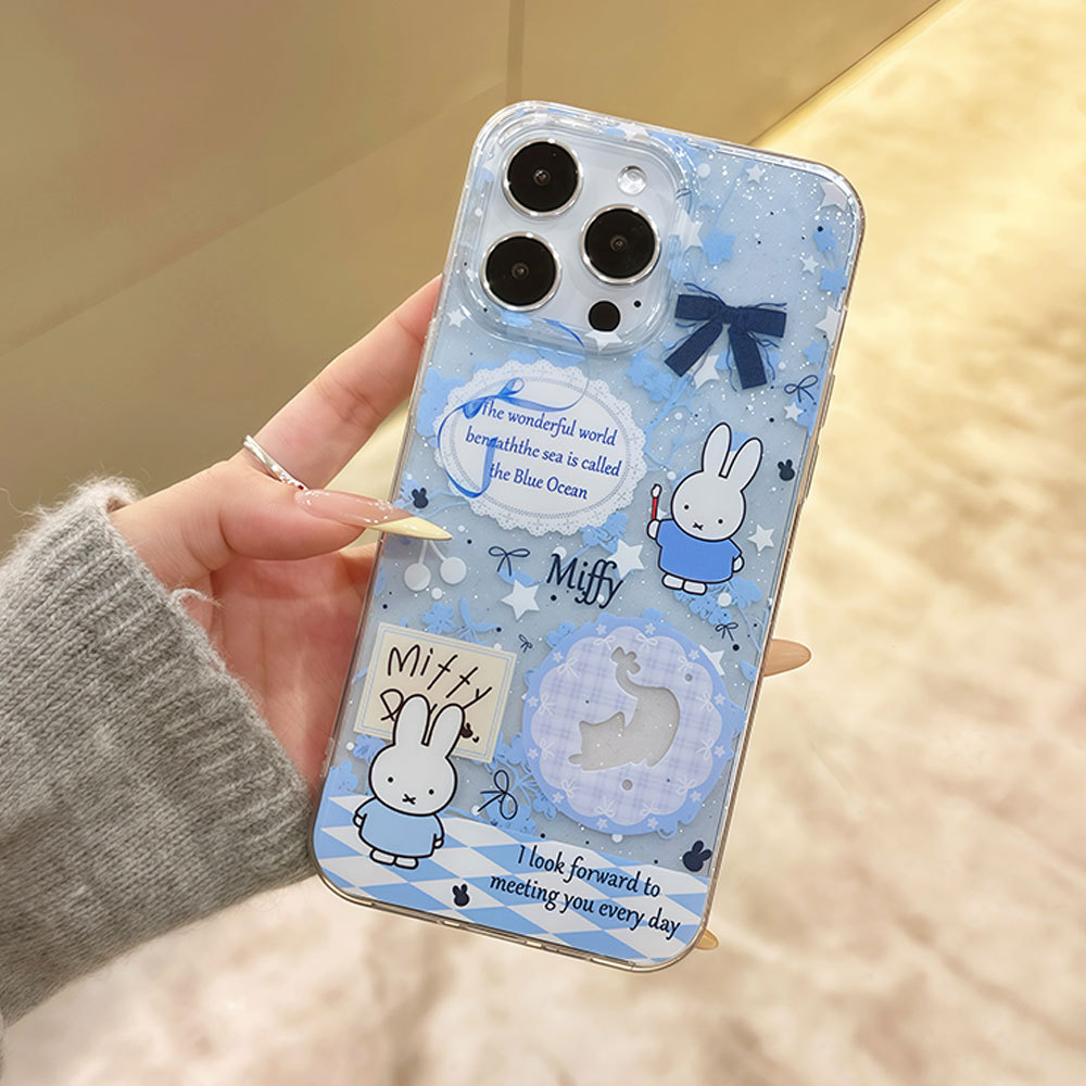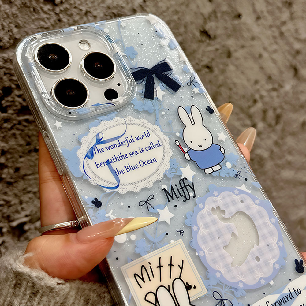 適用蘋果16pro可愛米菲13卡通手機殼大孔透明iphone15閃粉保護套