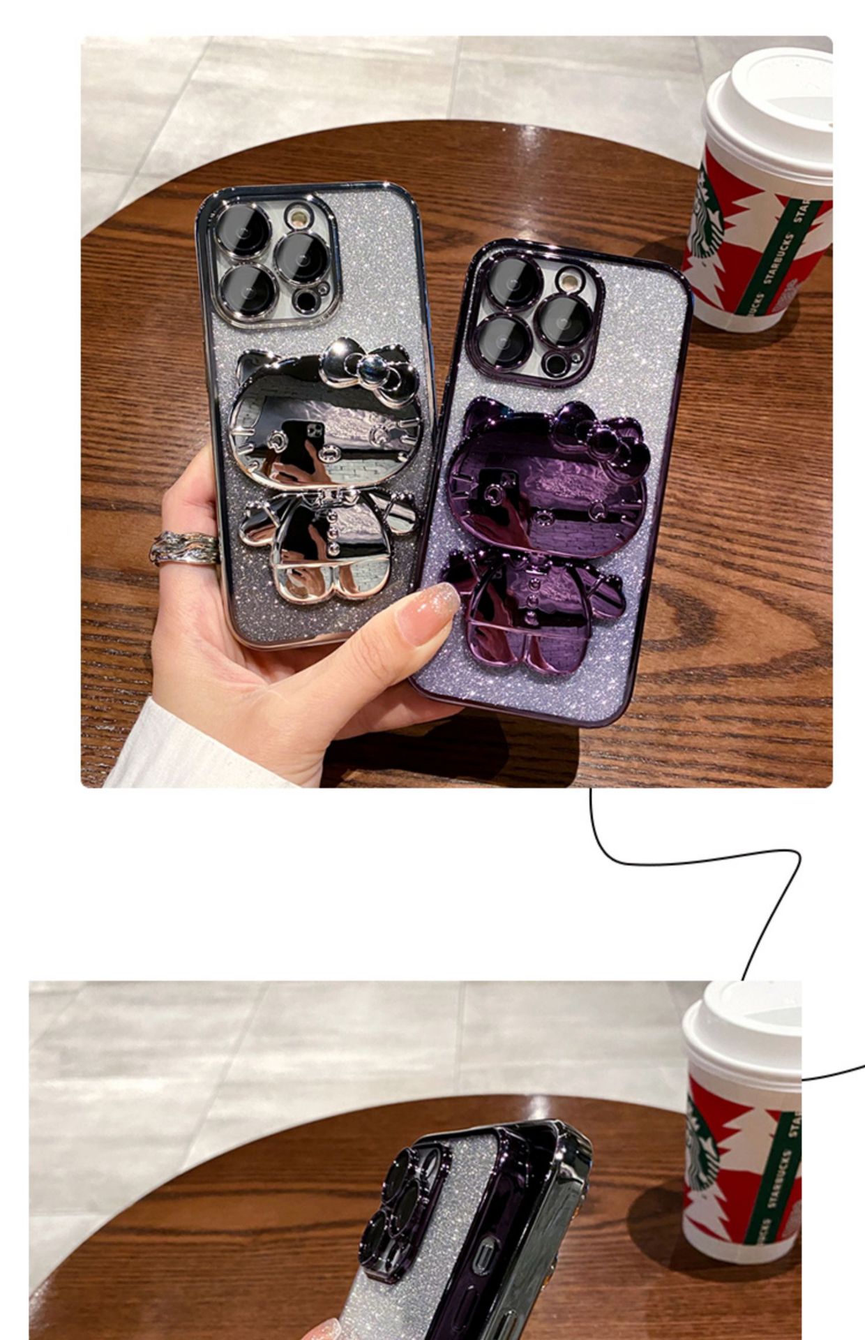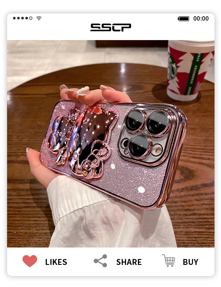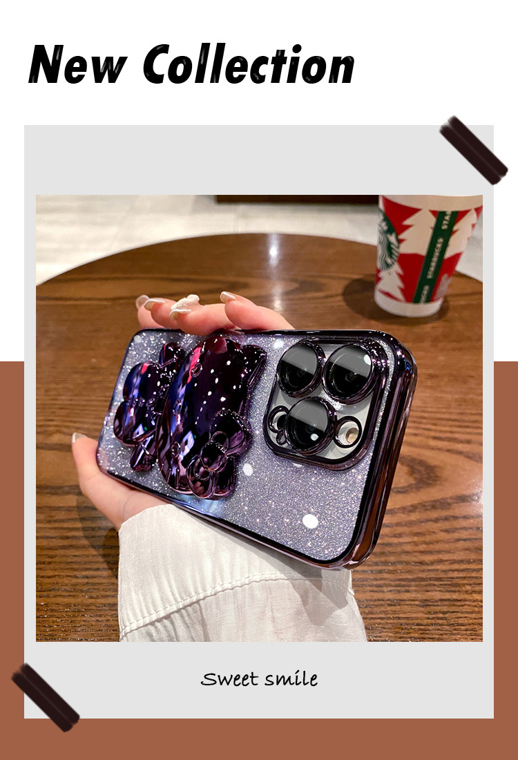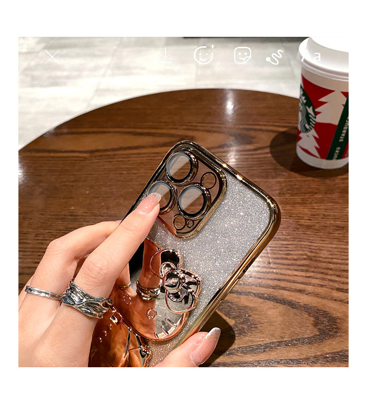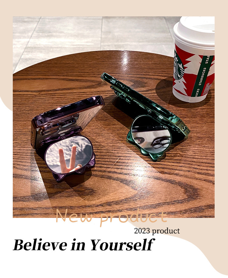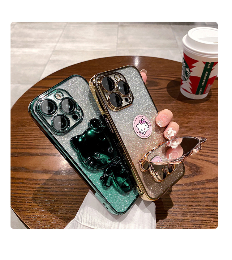 iPhone16Promax手機殼卡通可愛貓咪補妝鏡蘋果15電鍍支架保護套軟