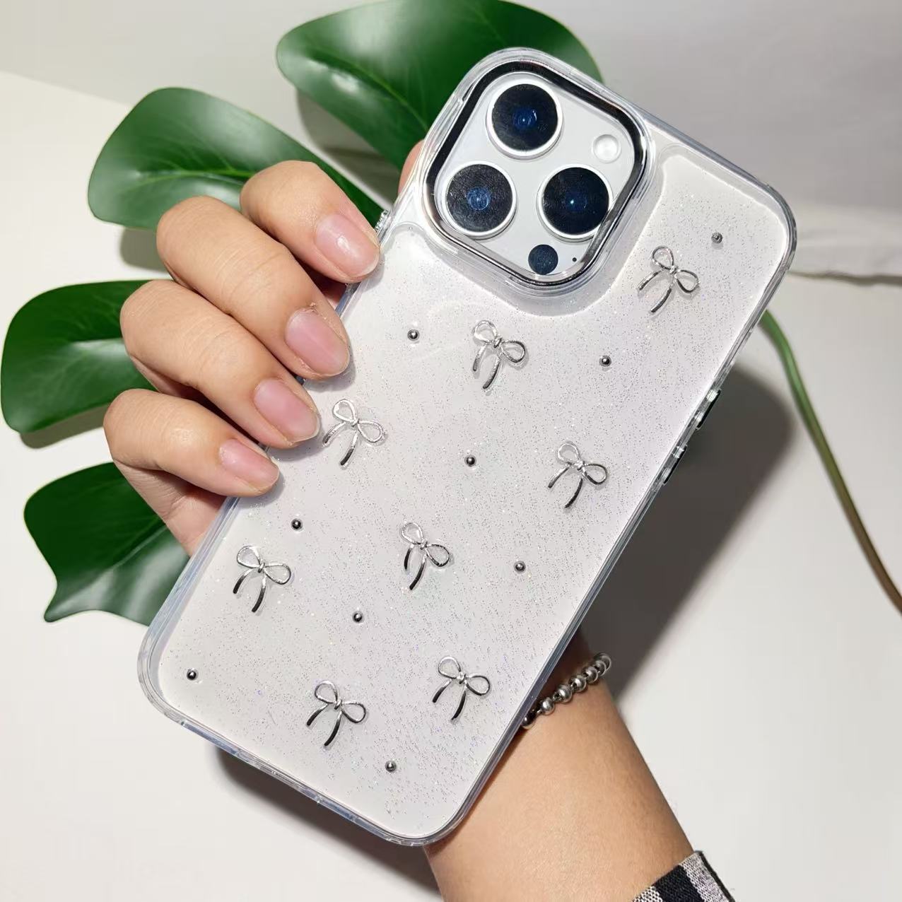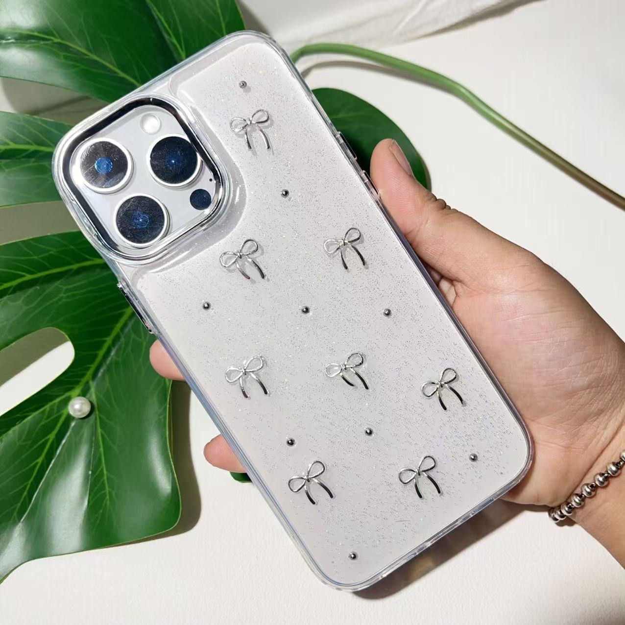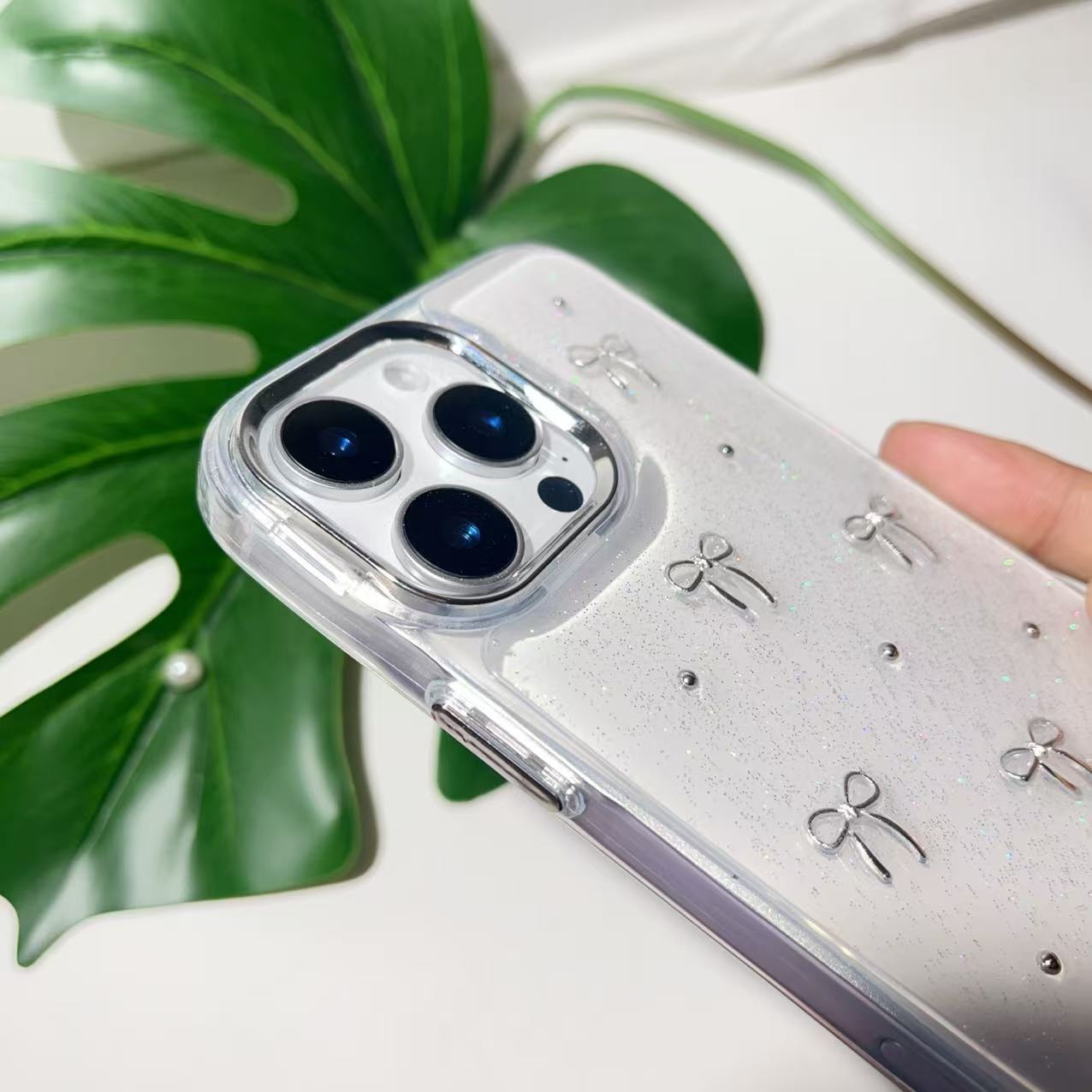滴膠閃粉珍珠蝴蝶結iphone15手機殼適用蘋果16promax保護套銀框