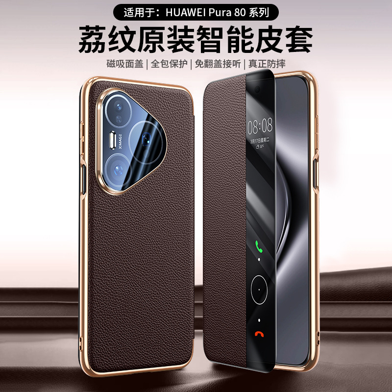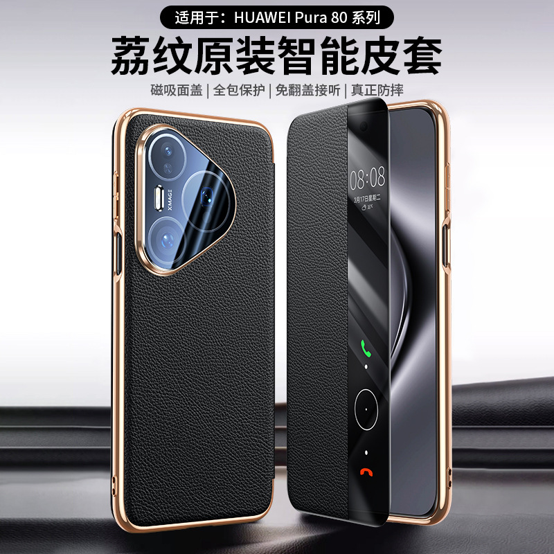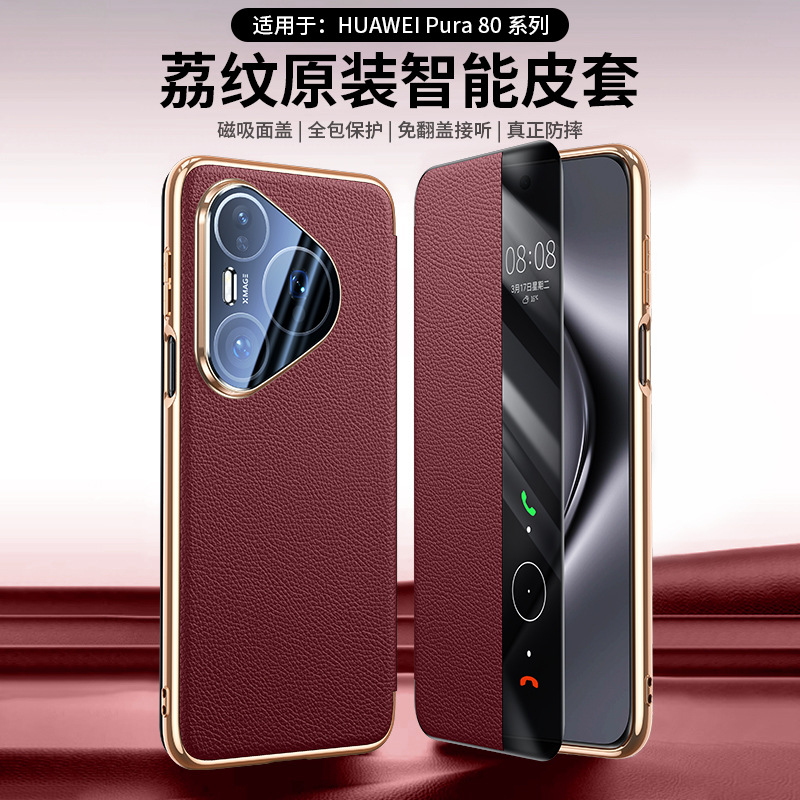 適用於華爲Pura80/Pro手機殼Ultra智能磁吸繙蓋皮套全包小荔枝紋