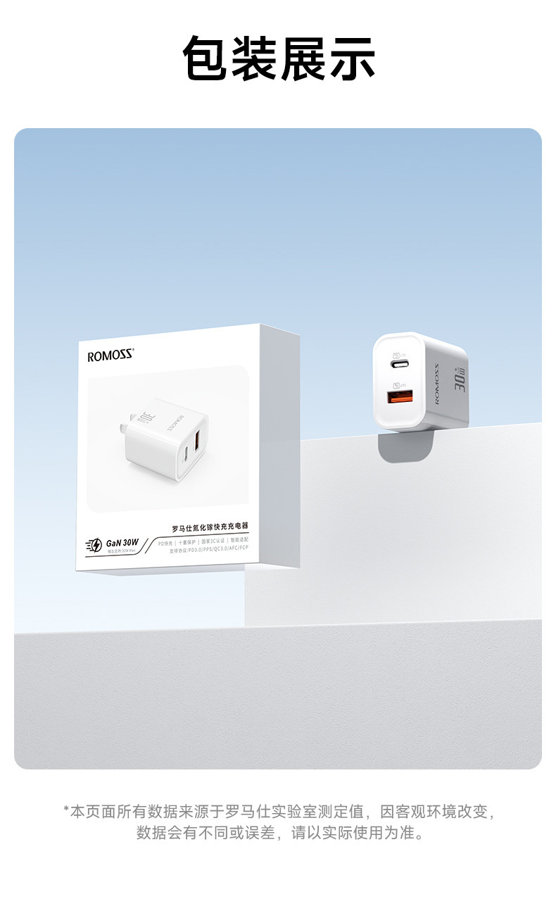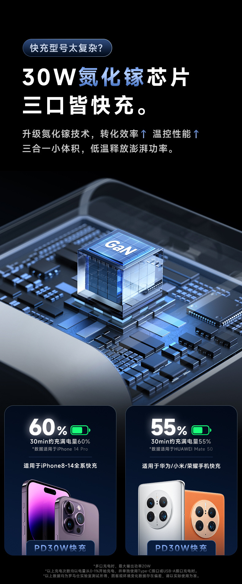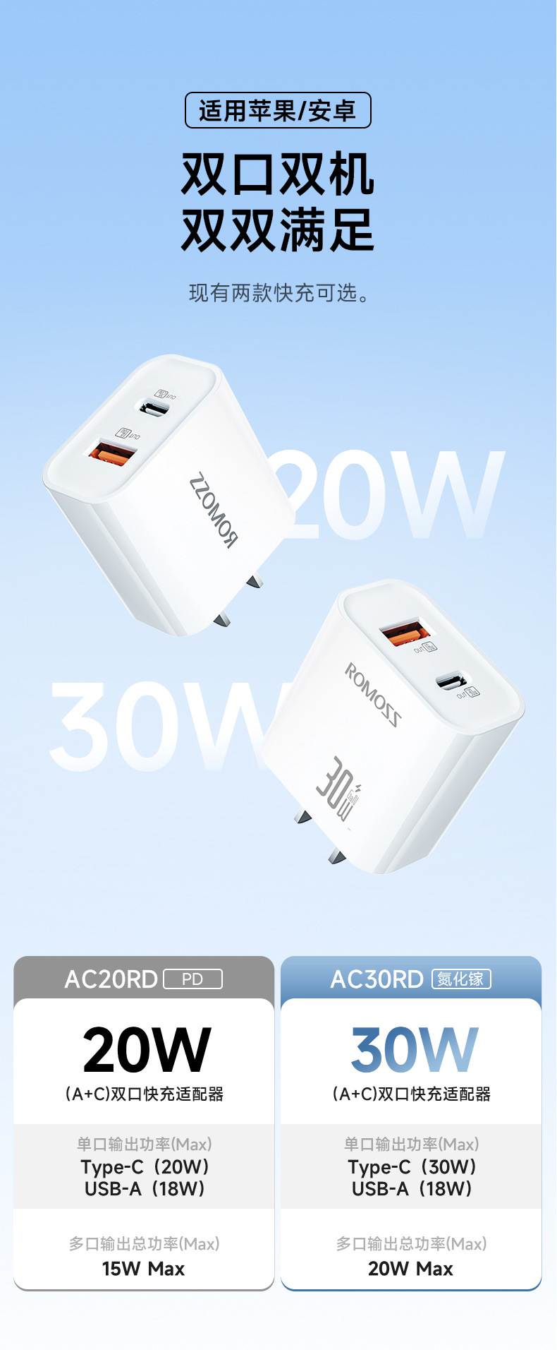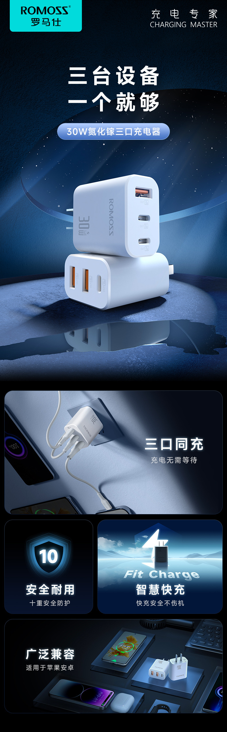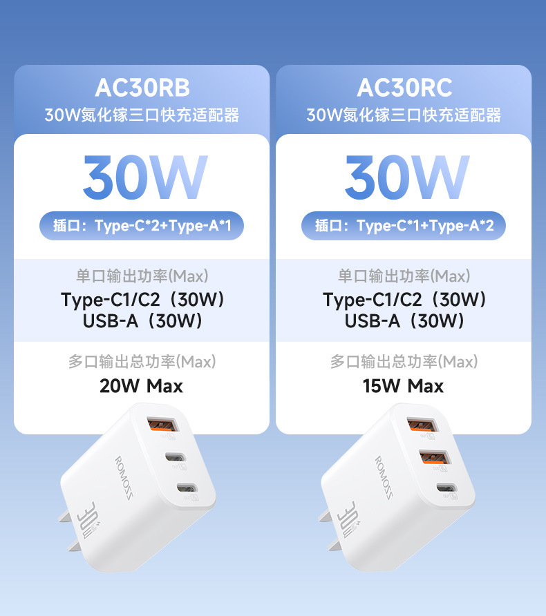 羅馬仕充電頭PD30W三口氮化鎵充電器適用蘋果華爲小米手機快充頭