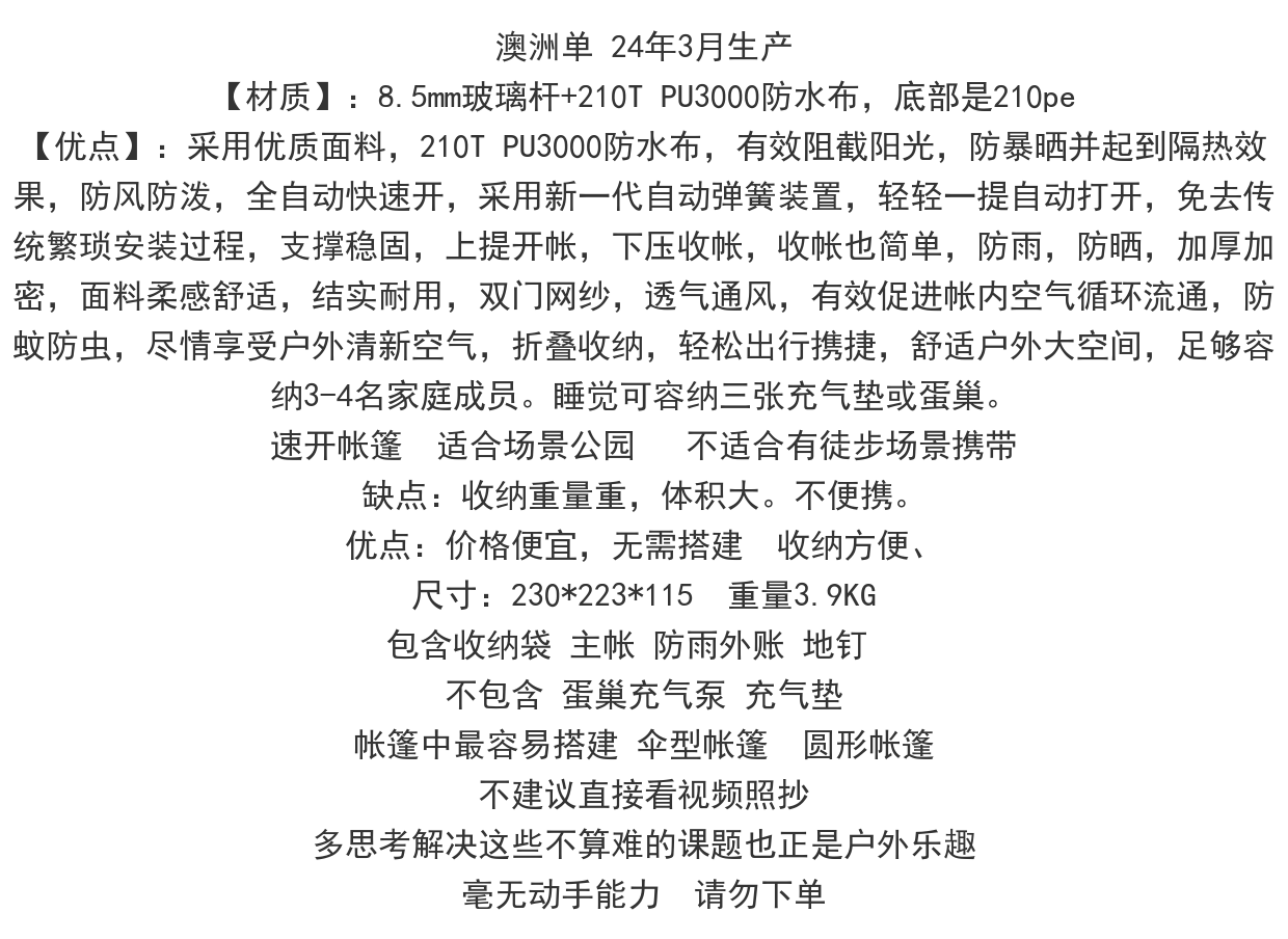 澳洲單速開傘形中大號帳篷郊遊公園帳篷防風防曬防雨免搭建