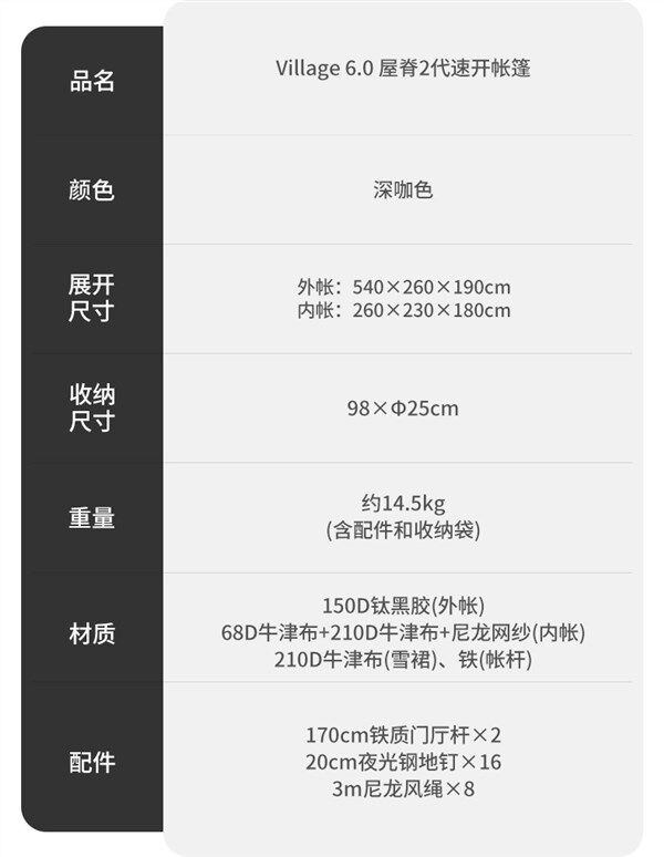 | 帳篷重量 | 約14.5kg(含配件和收納袋) |