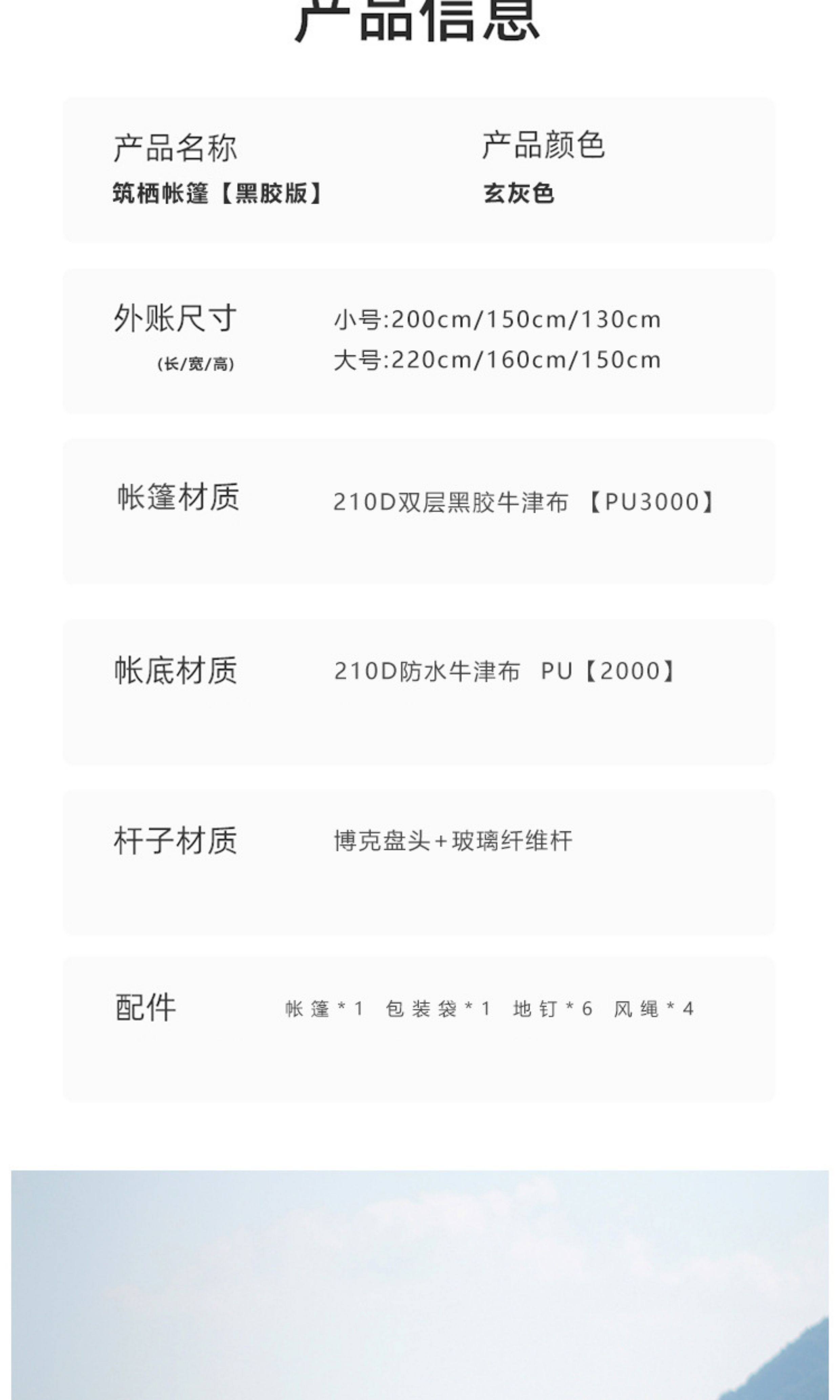 | 內帳材料 | 210D黑膠牛津布PU3000MM,UPF50+ |