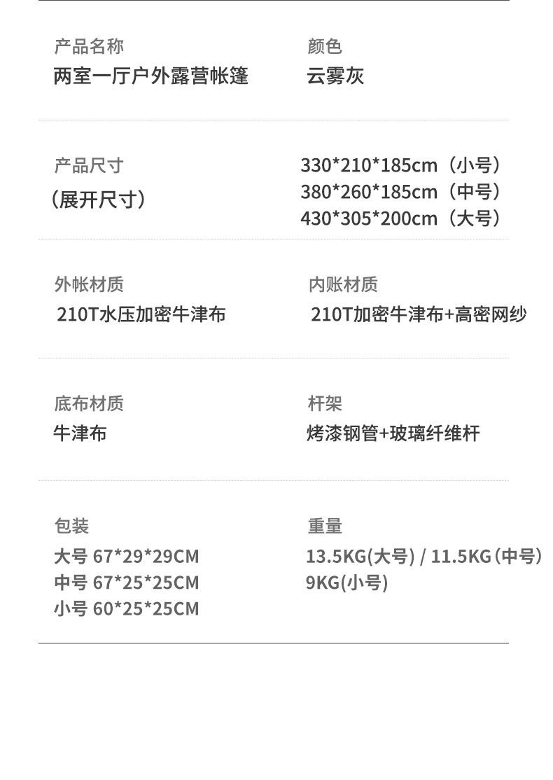 | 帳篷重量 | 13.5kg/11.5kg/9kg |