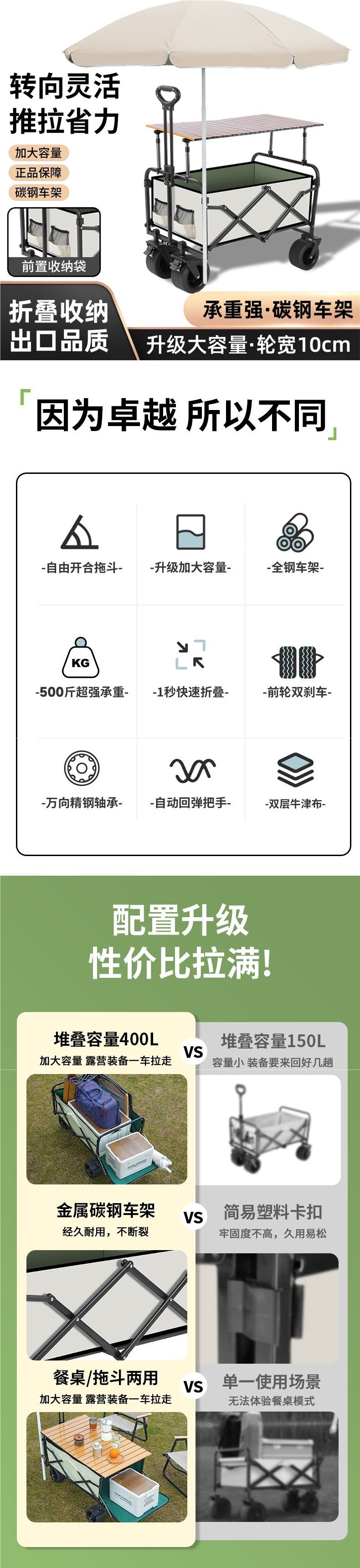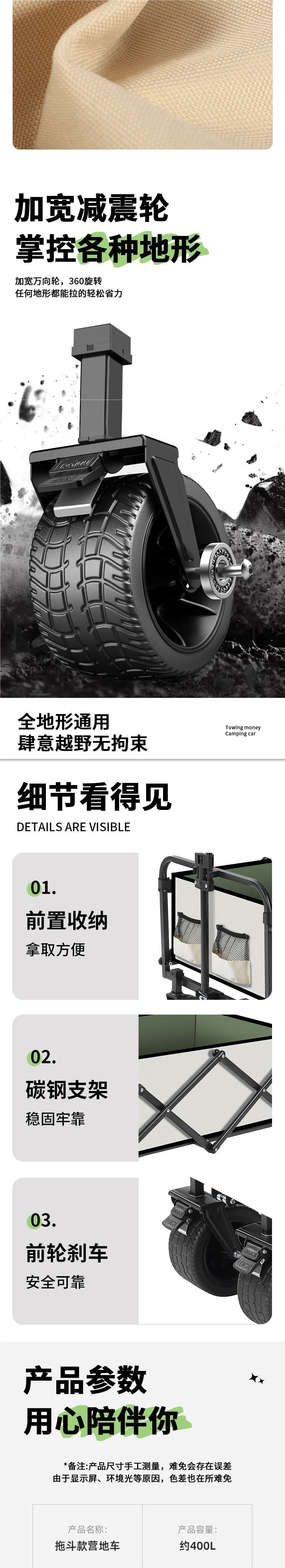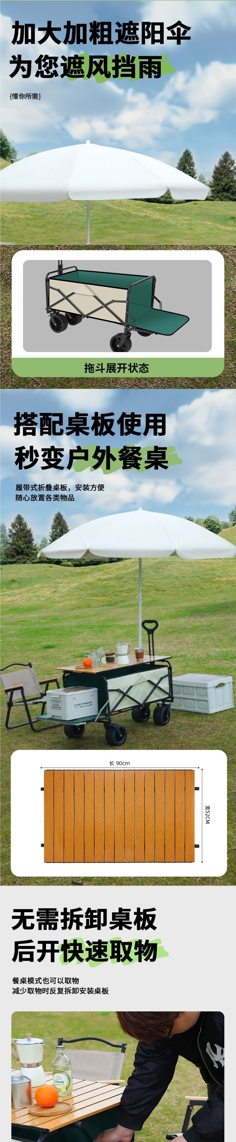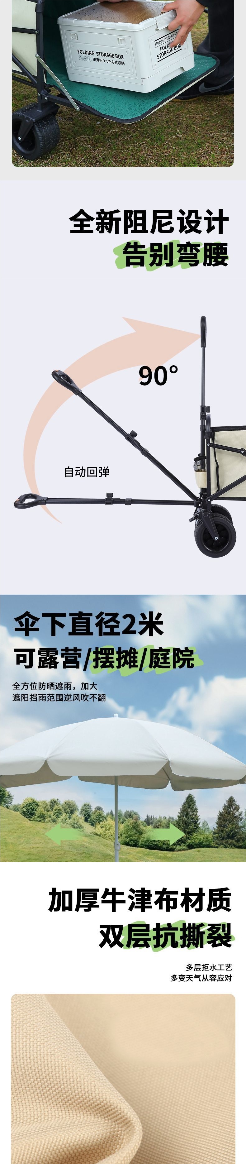 | 顔色 | 營地車+桌板+升降桿+遮陽傘-可後繙十寸坦克輪米綠/雙刹車 |