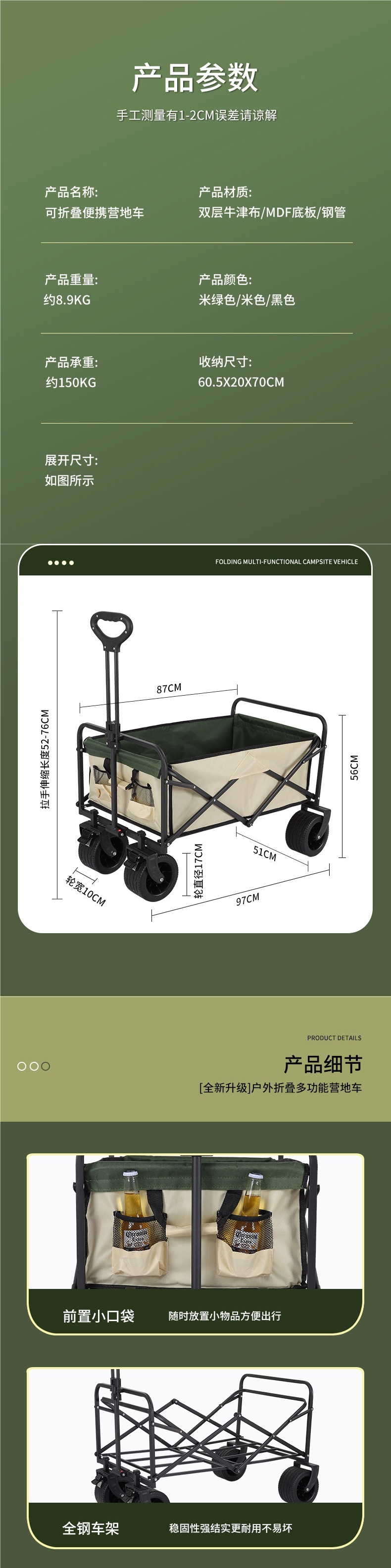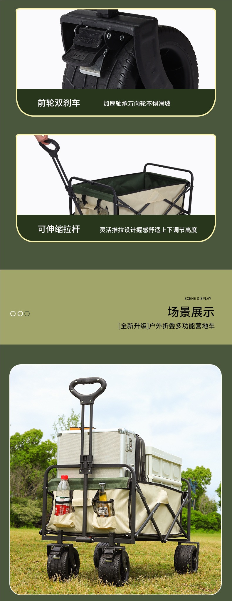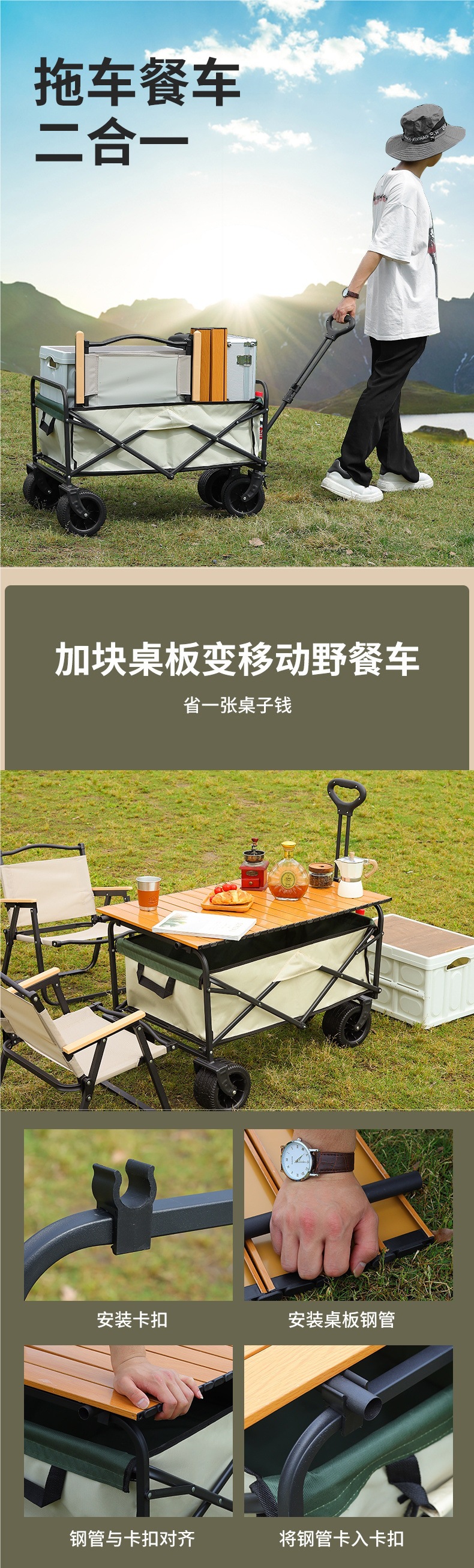 顔色 營地車+加高加長擺攤桌子-大號拖鬥款坦克輪(米綠)★