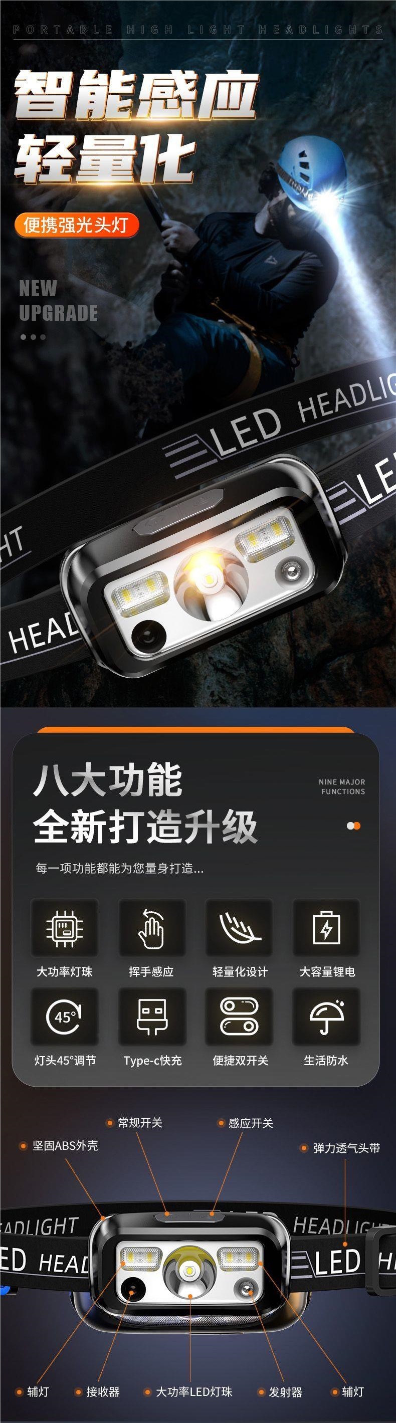 揮手感應三光源白光紅光頭燈超亮夜釣魚可充電戶外家用輕便頭戴式