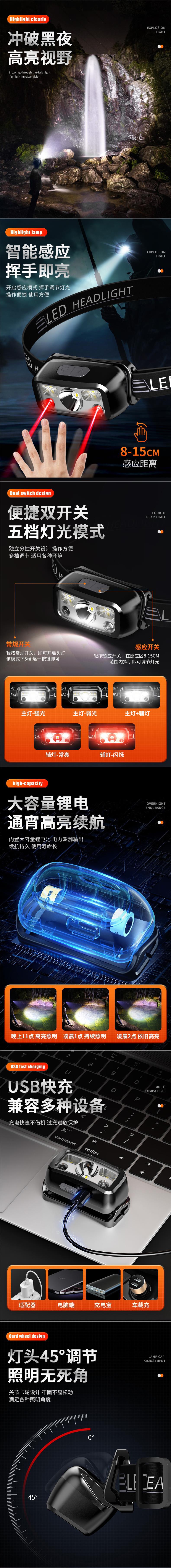 頭燈超亮可充電頭戴式強光感應手電筒小型夜釣魚續航登山照明可攜式