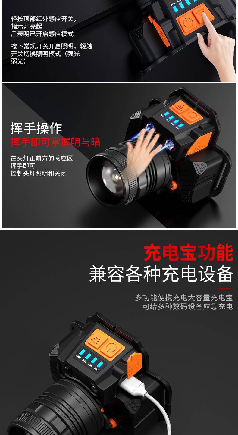 頭戴式手電筒感應超亮野外夜釣魚燈led頭燈礦燈可充電強光