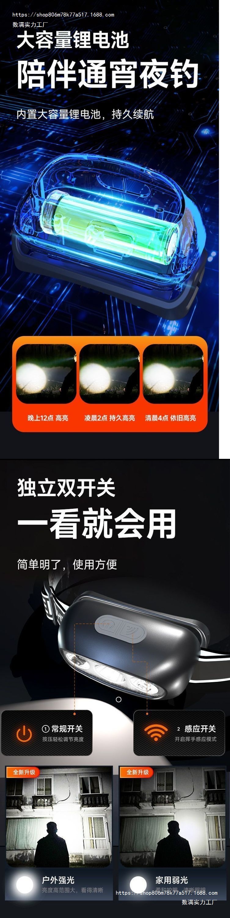LED強光超亮頭燈續航釣魚感應可充電充電可攜式頭戴式