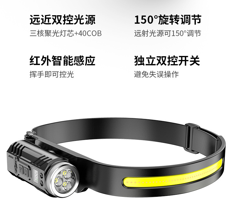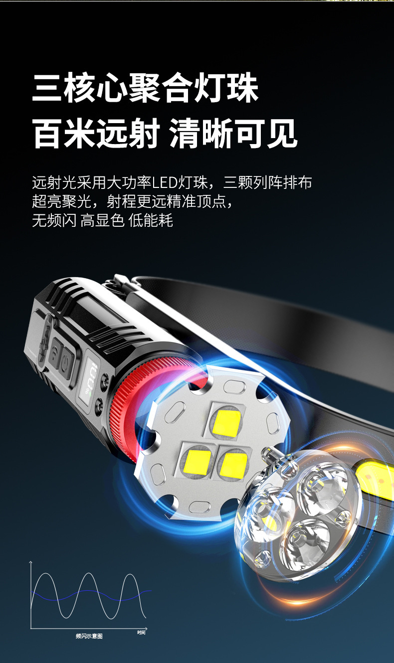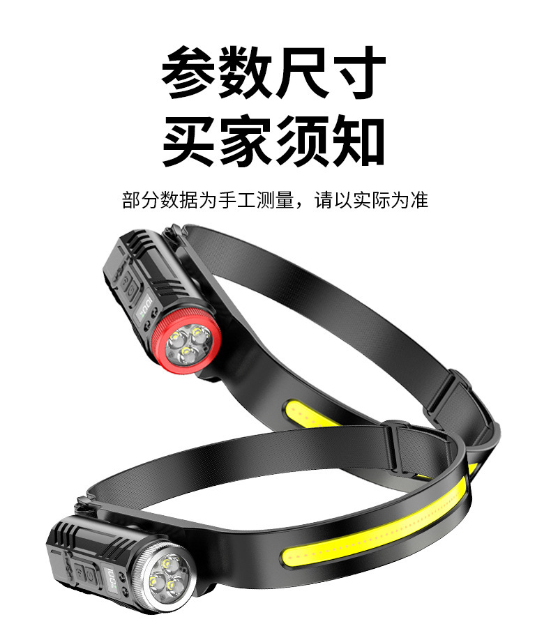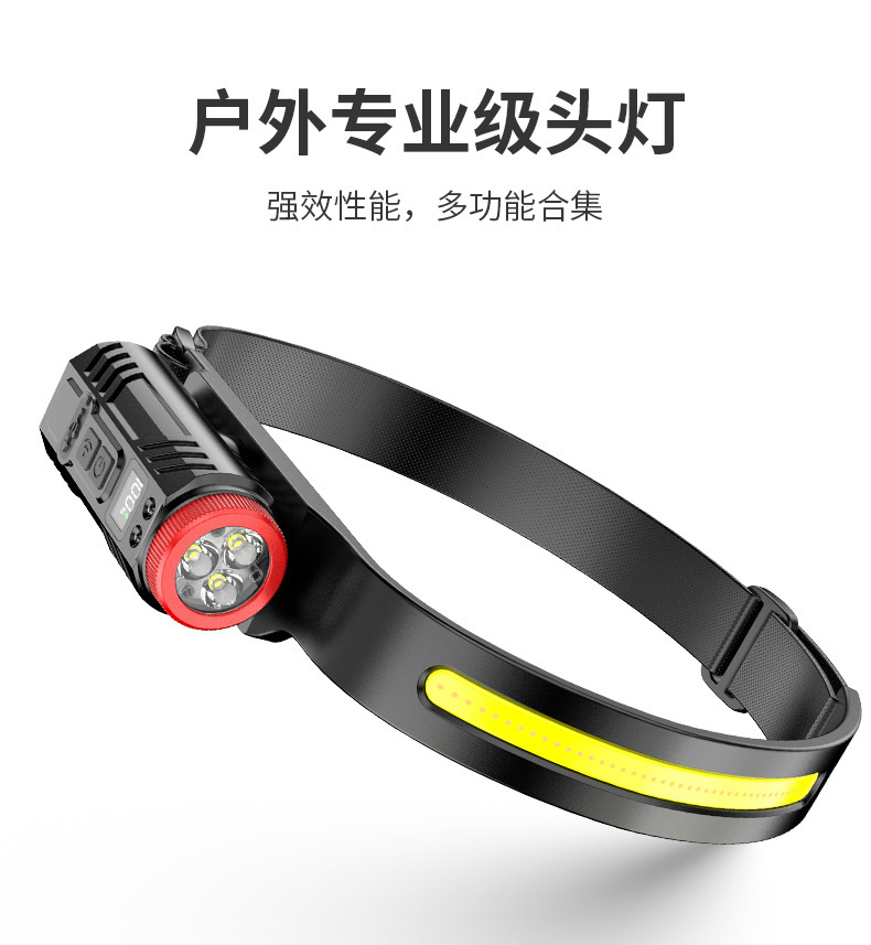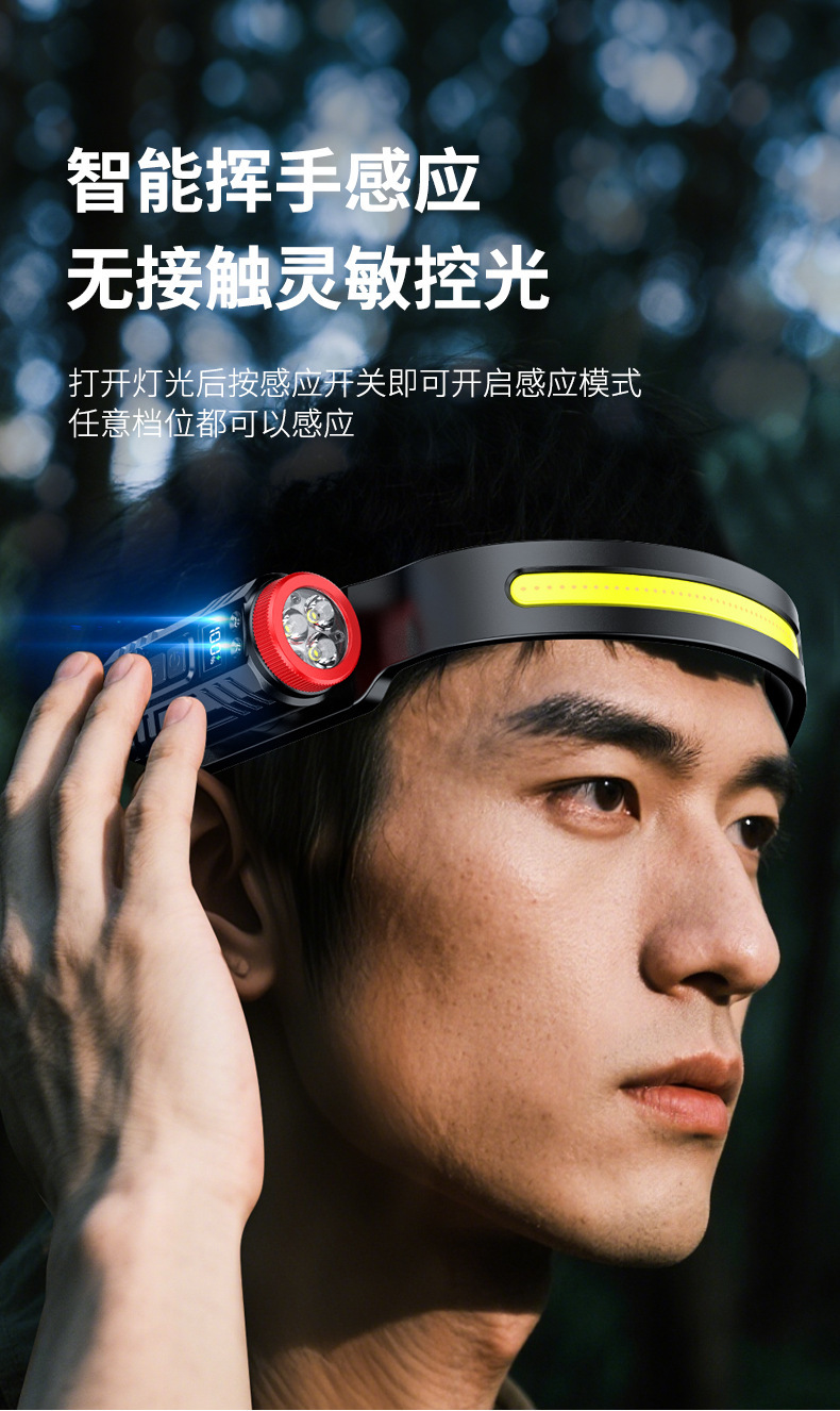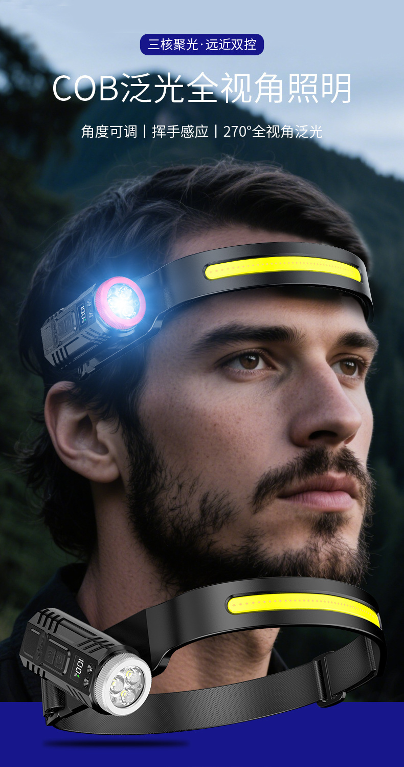 新款矽膠三頭可充電夜跑步騎行野露營感應頭戴燈 可調COB頭燈