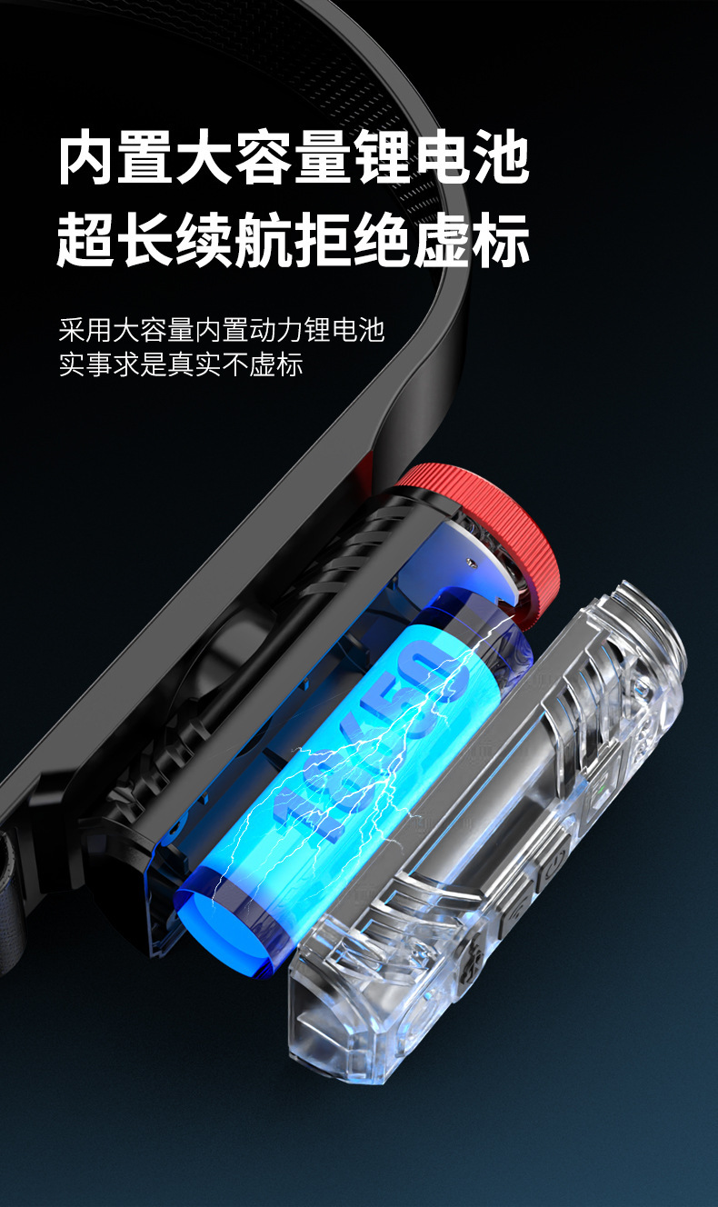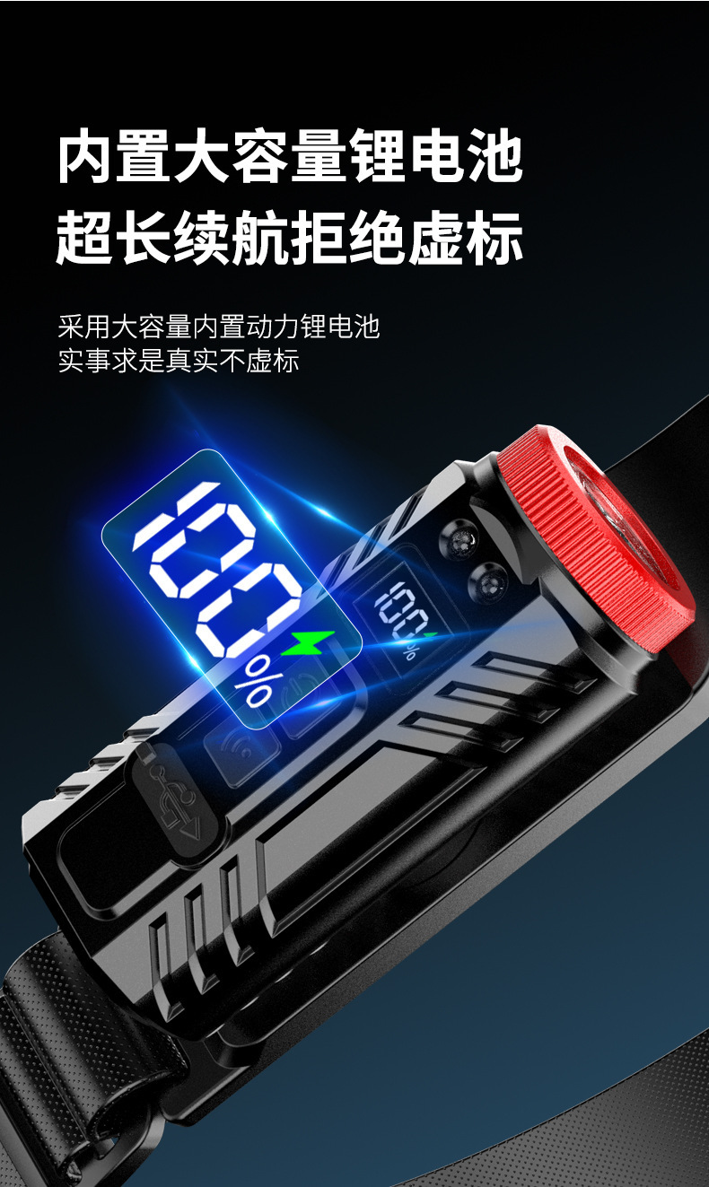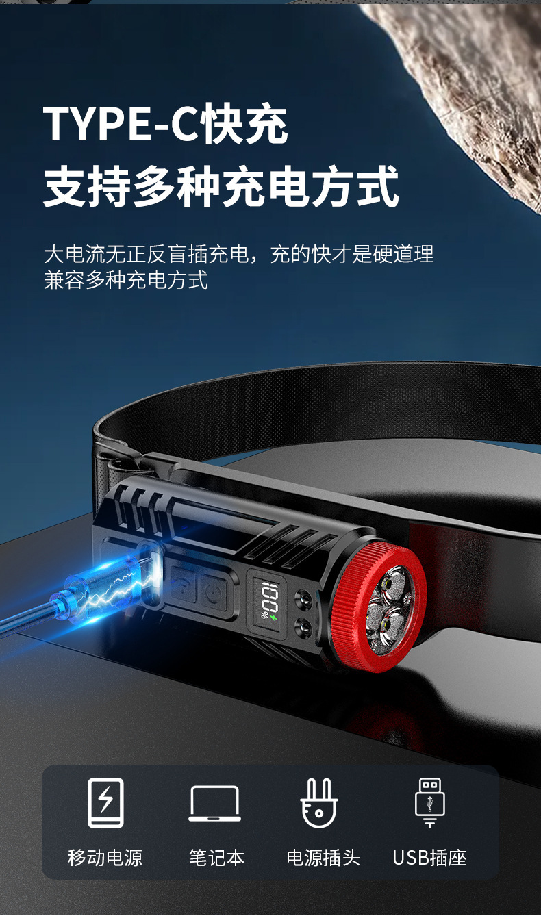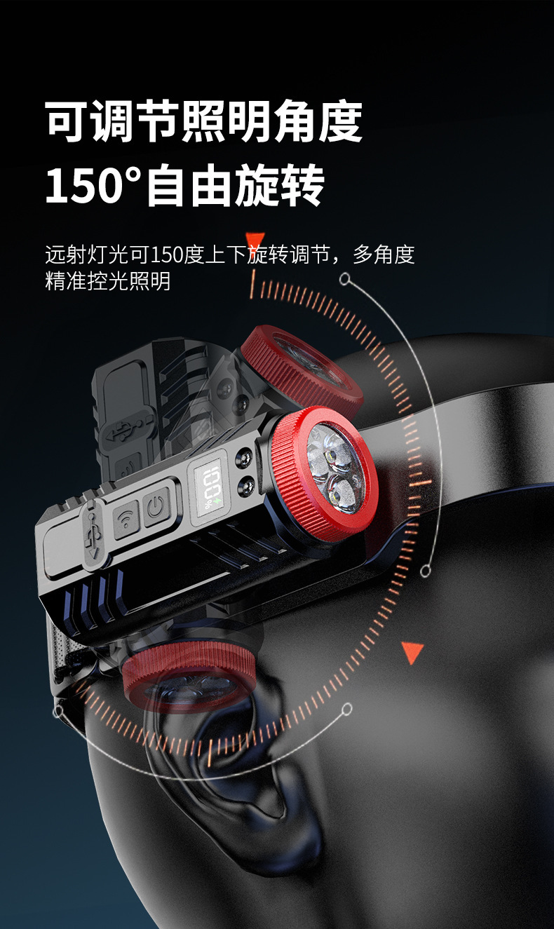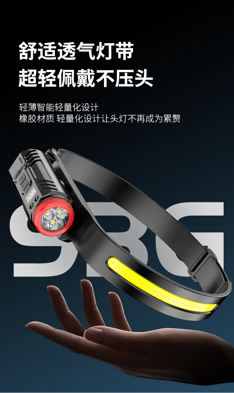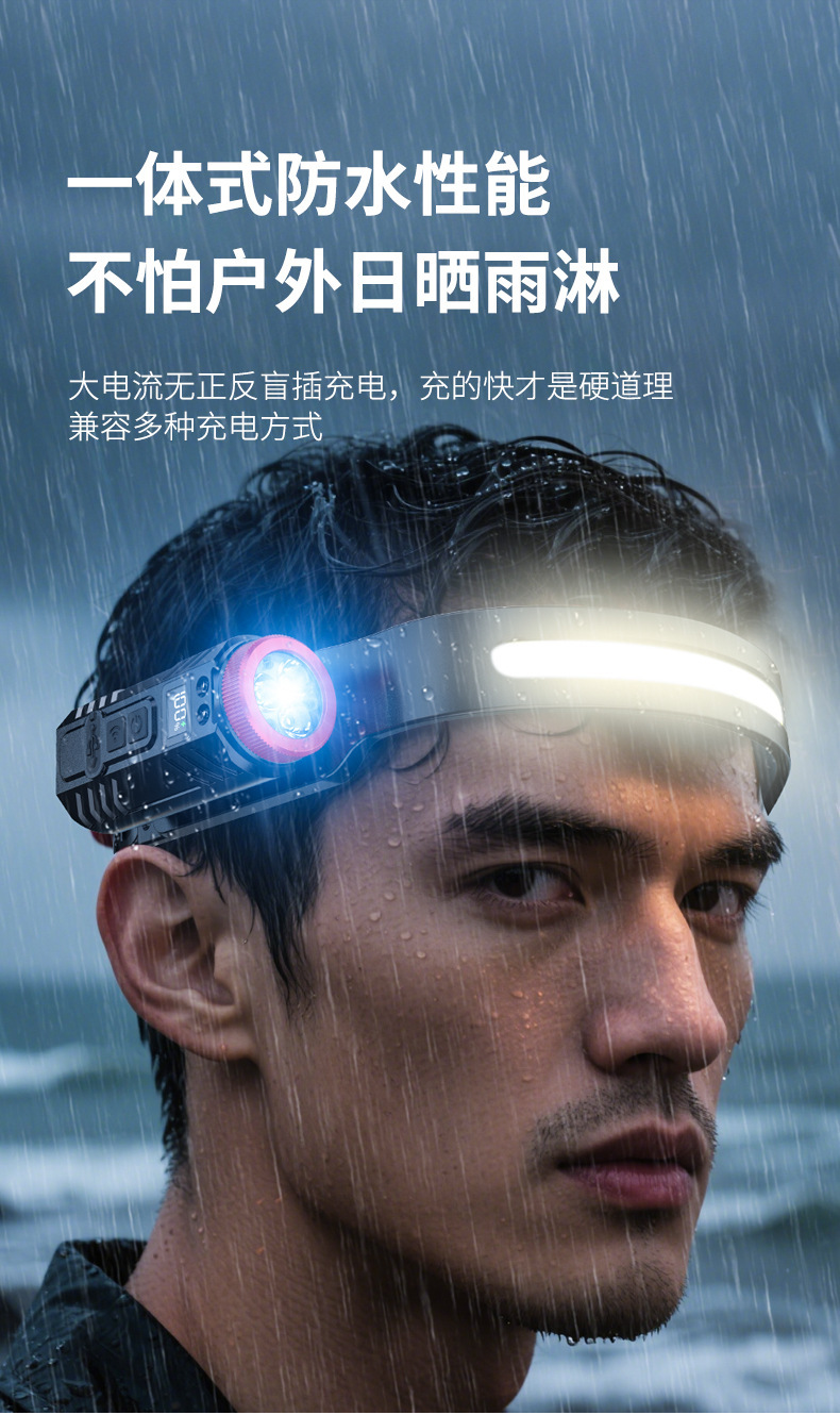 新款矽膠三頭可充電夜跑步騎行野露營感應頭戴燈 可調COB頭燈