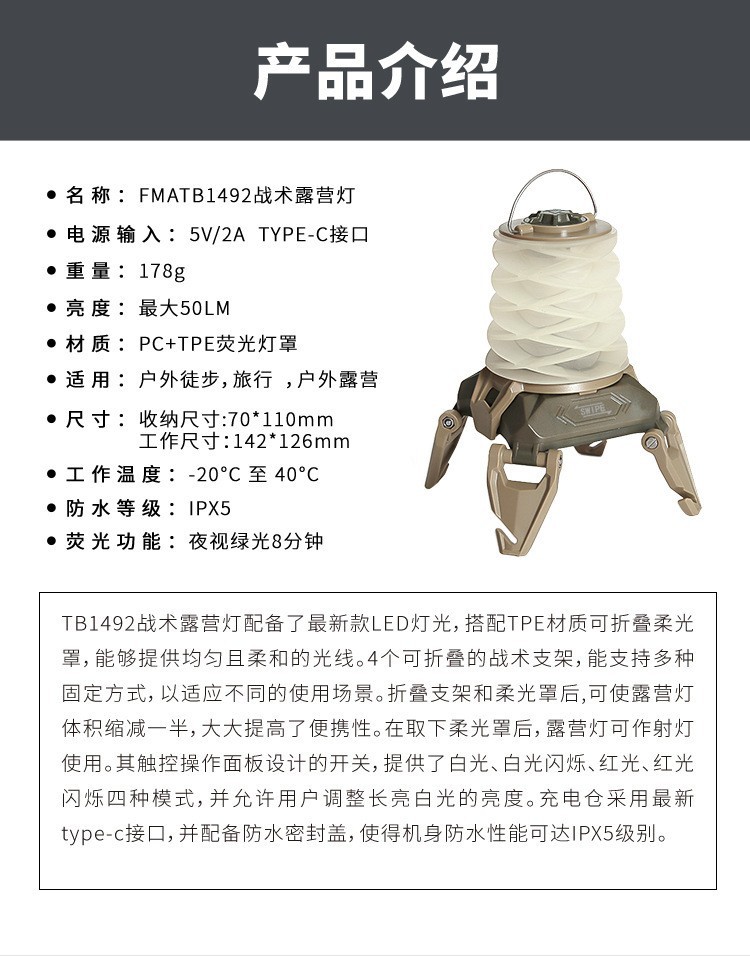 FMA 戶外裝備 可充電式 可攜式 戶外戰術露營燈 TB1492