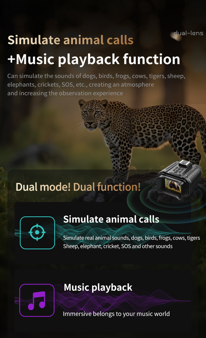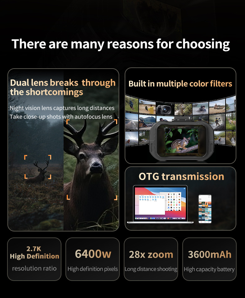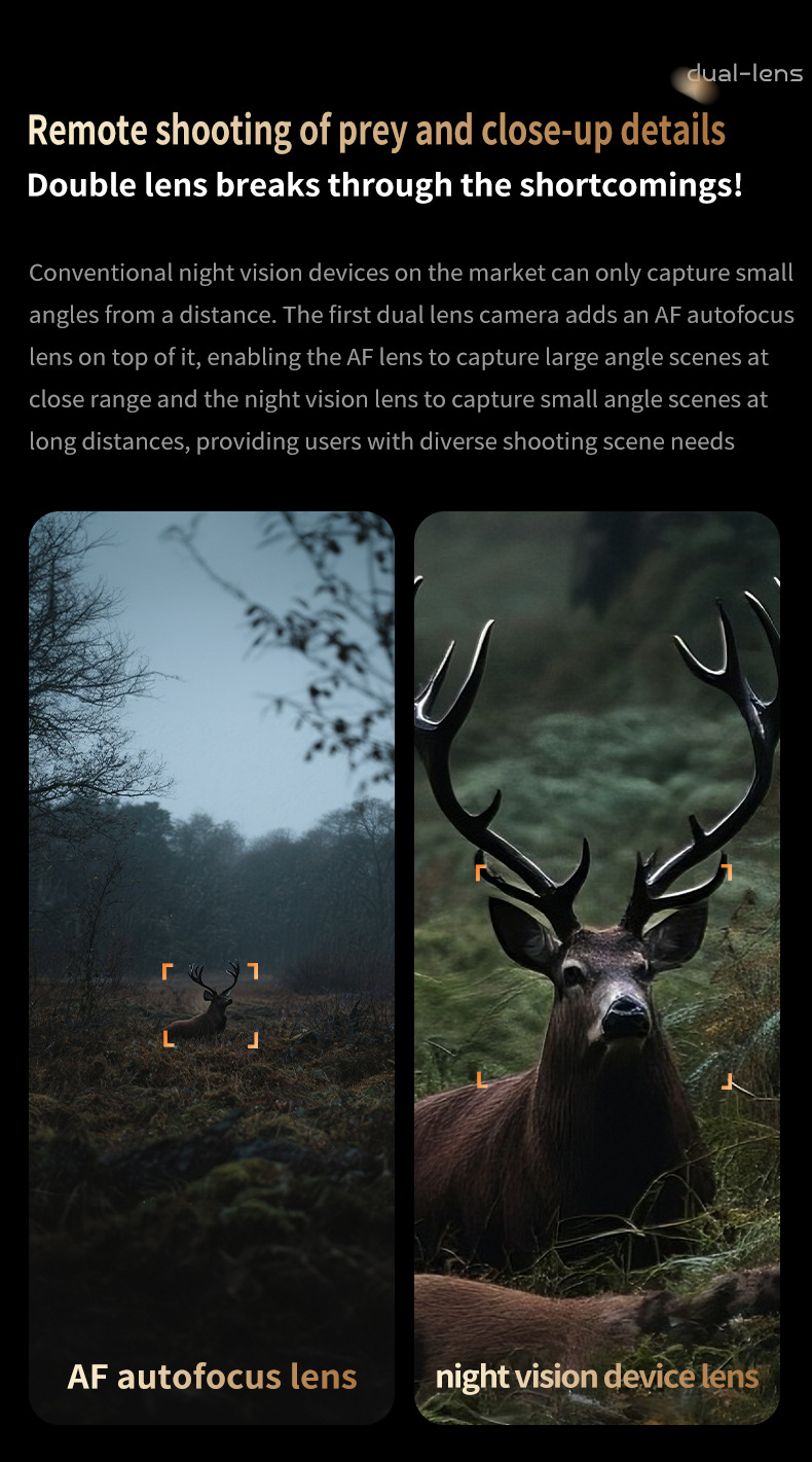 | 核心賣點 | 首創雙鏡頭遠近可拍、多種動物聲模擬、電子瞄具、紅外線、息屏錄製、微距、多種濾鏡、可拓展配件 |