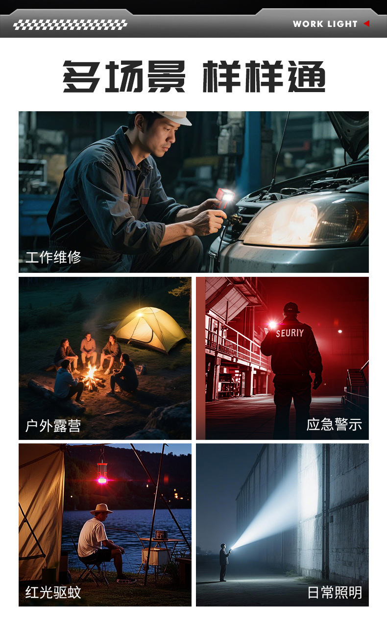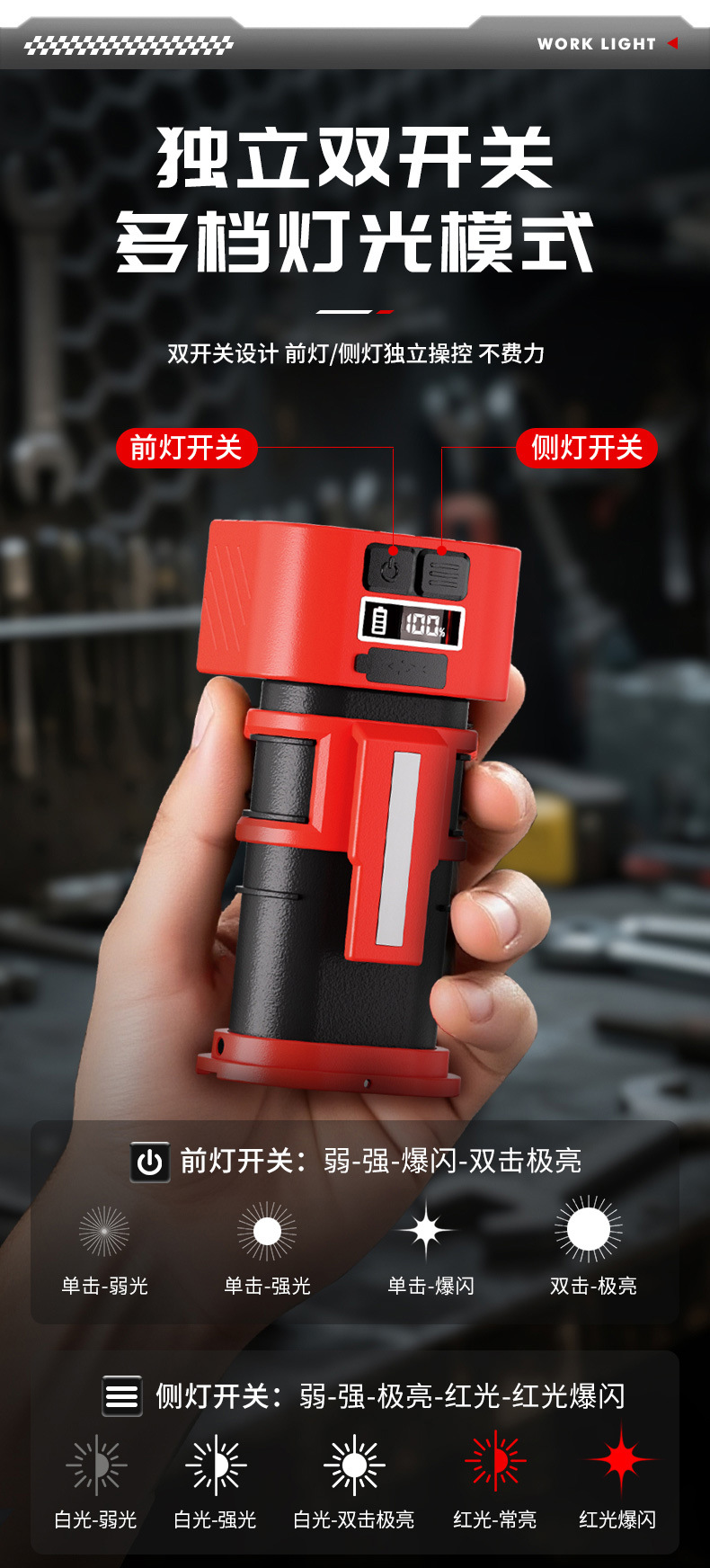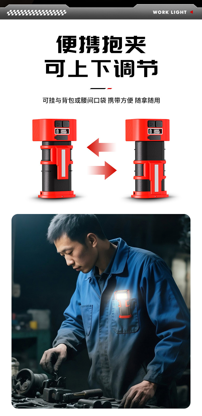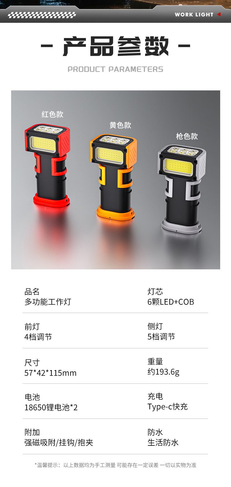 新款多功能LED工作燈旋轉調節COB照明帶磁吸迷你充電手電筒