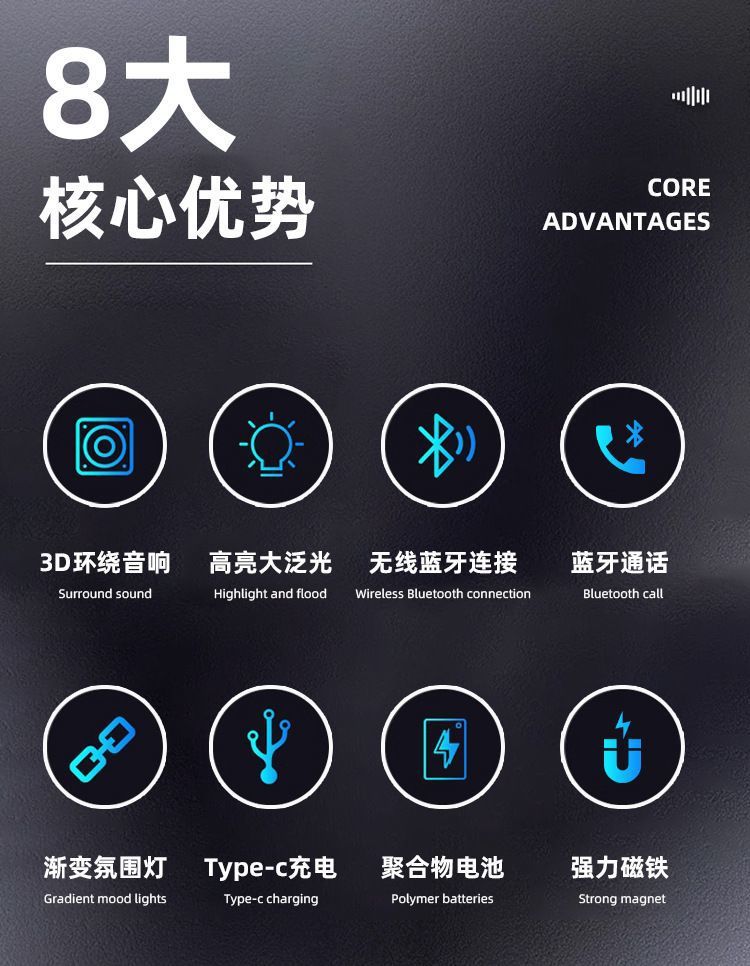 | 顔色 | 【低配款】黑色+隻有照明/慎拍-多功能藍牙音響帶氛圍燈露營燈 |
