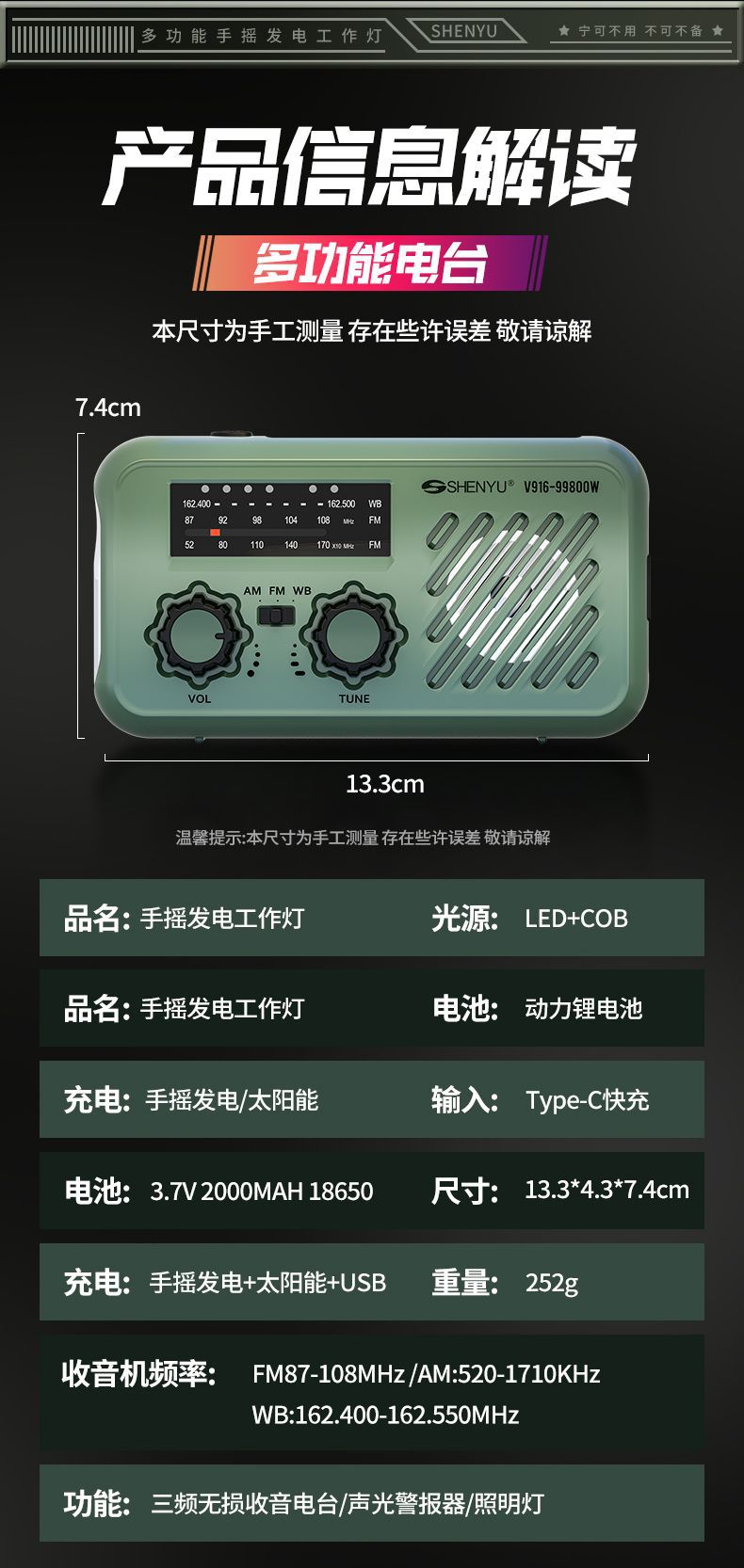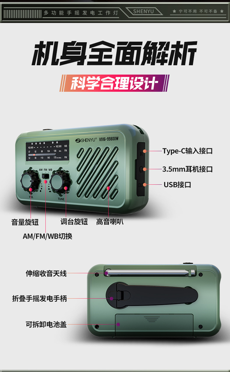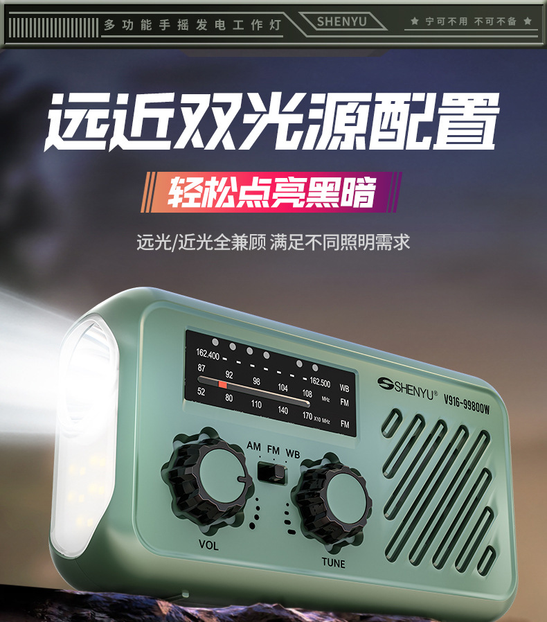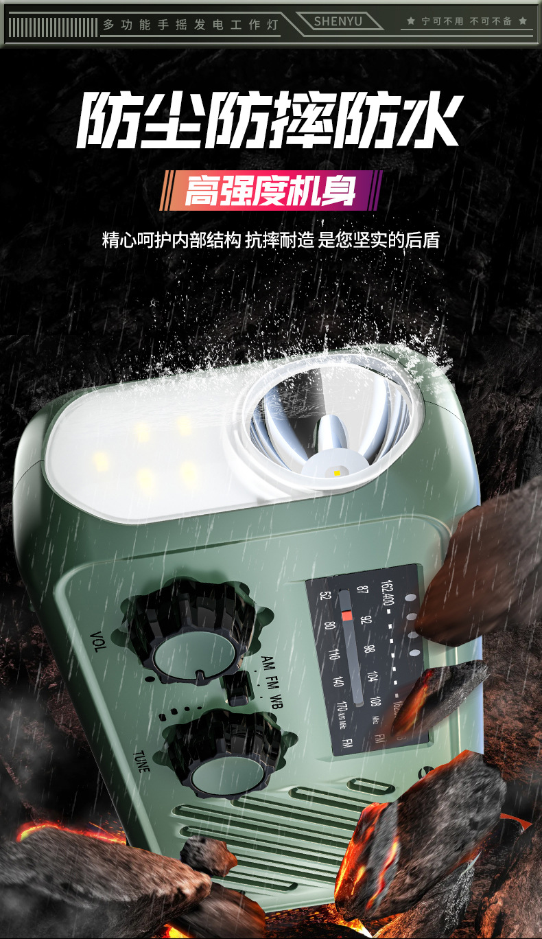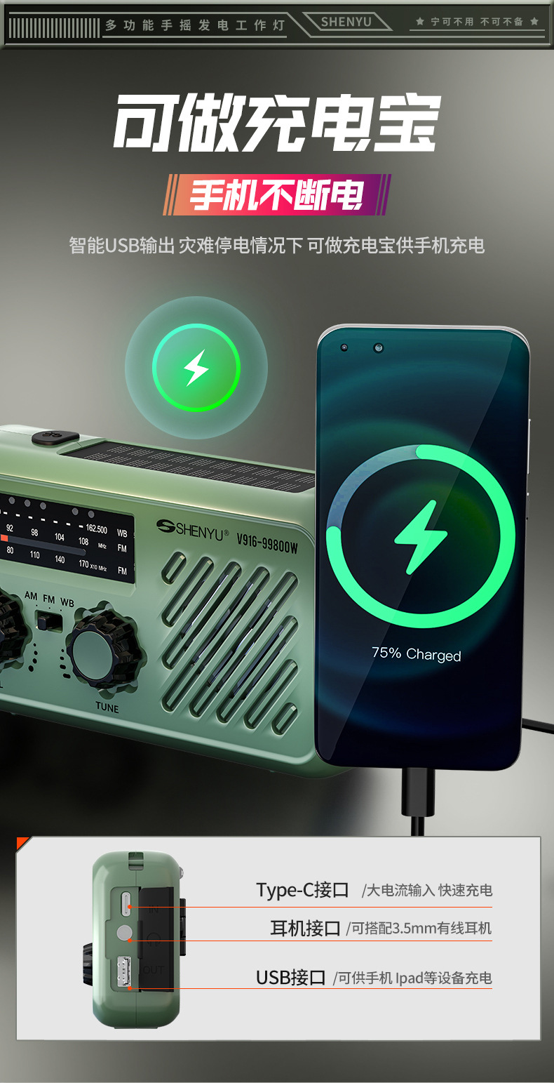 | 顔色 | 頂配 軍綠色【手搖髮電/太陽能/快充/三波段收音機/sos/照明燈】 |