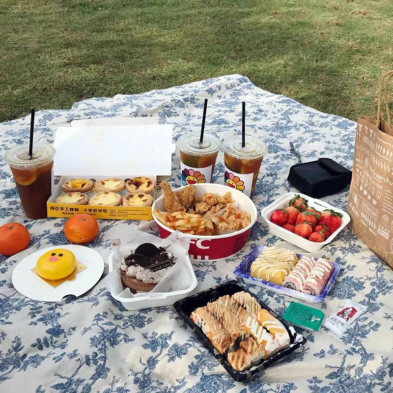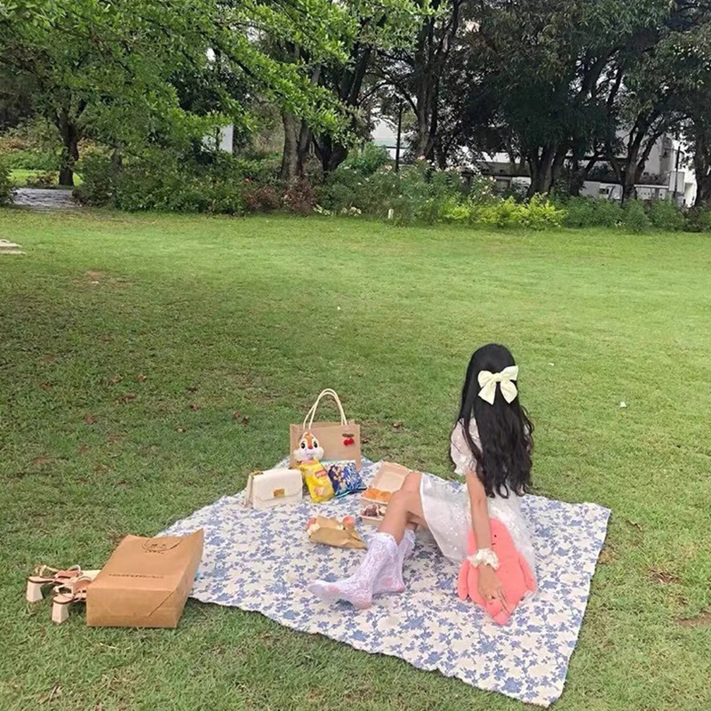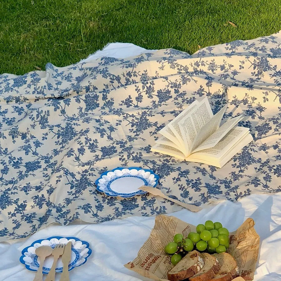 法式戶外露營野餐布春遊青花防潮墊可攜式草地墊子加厚防潮墊沙灘毯