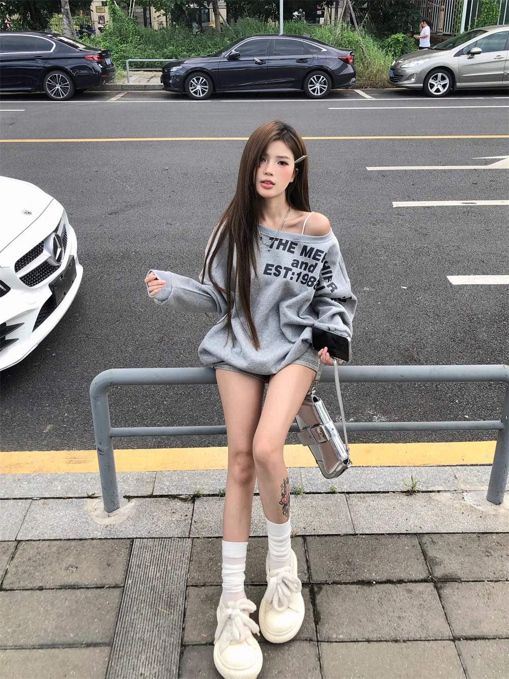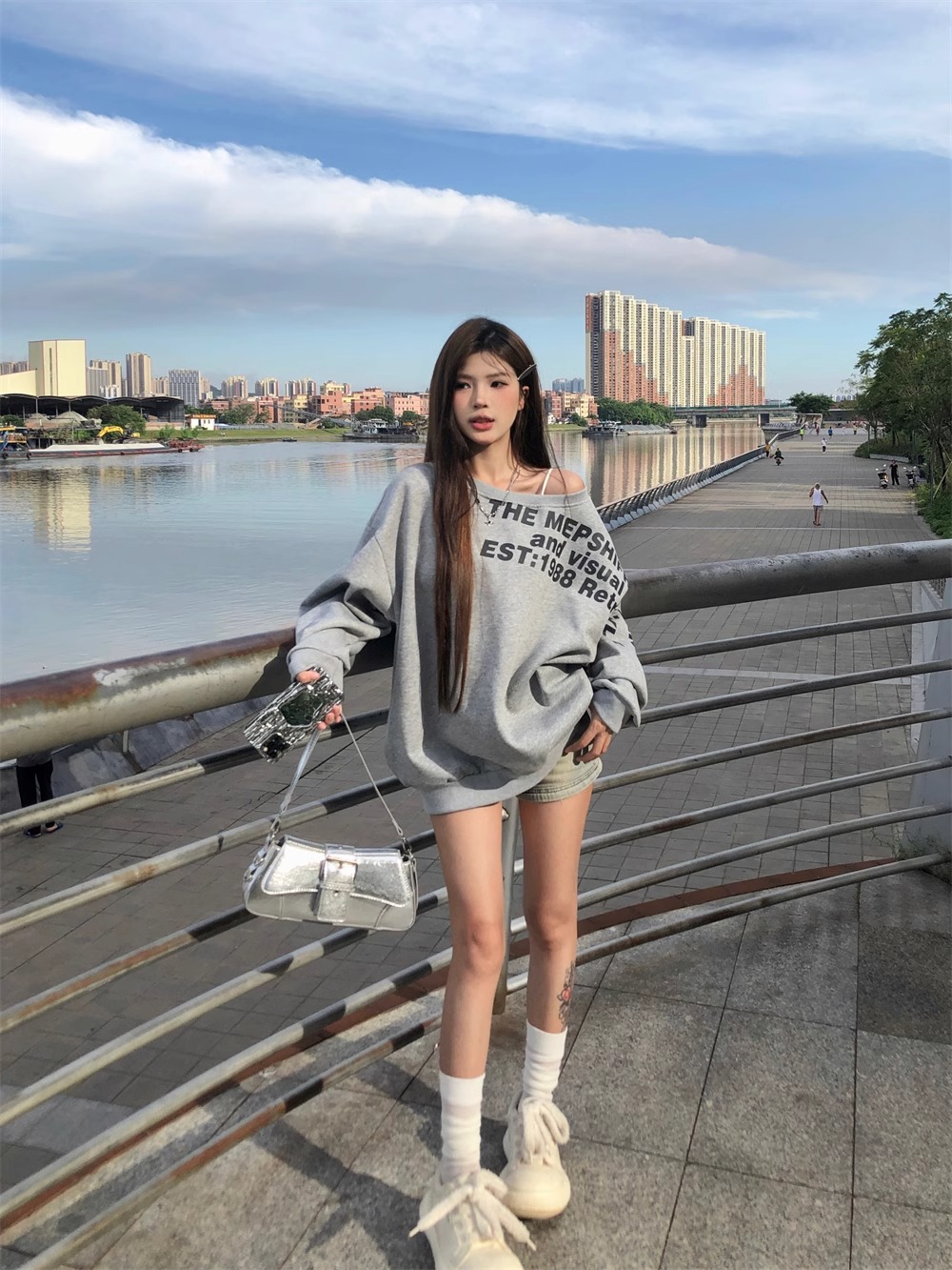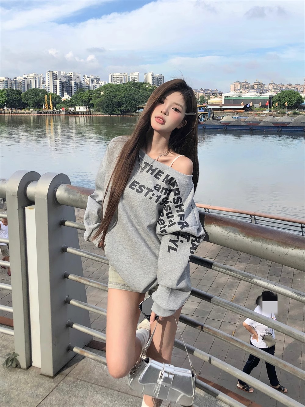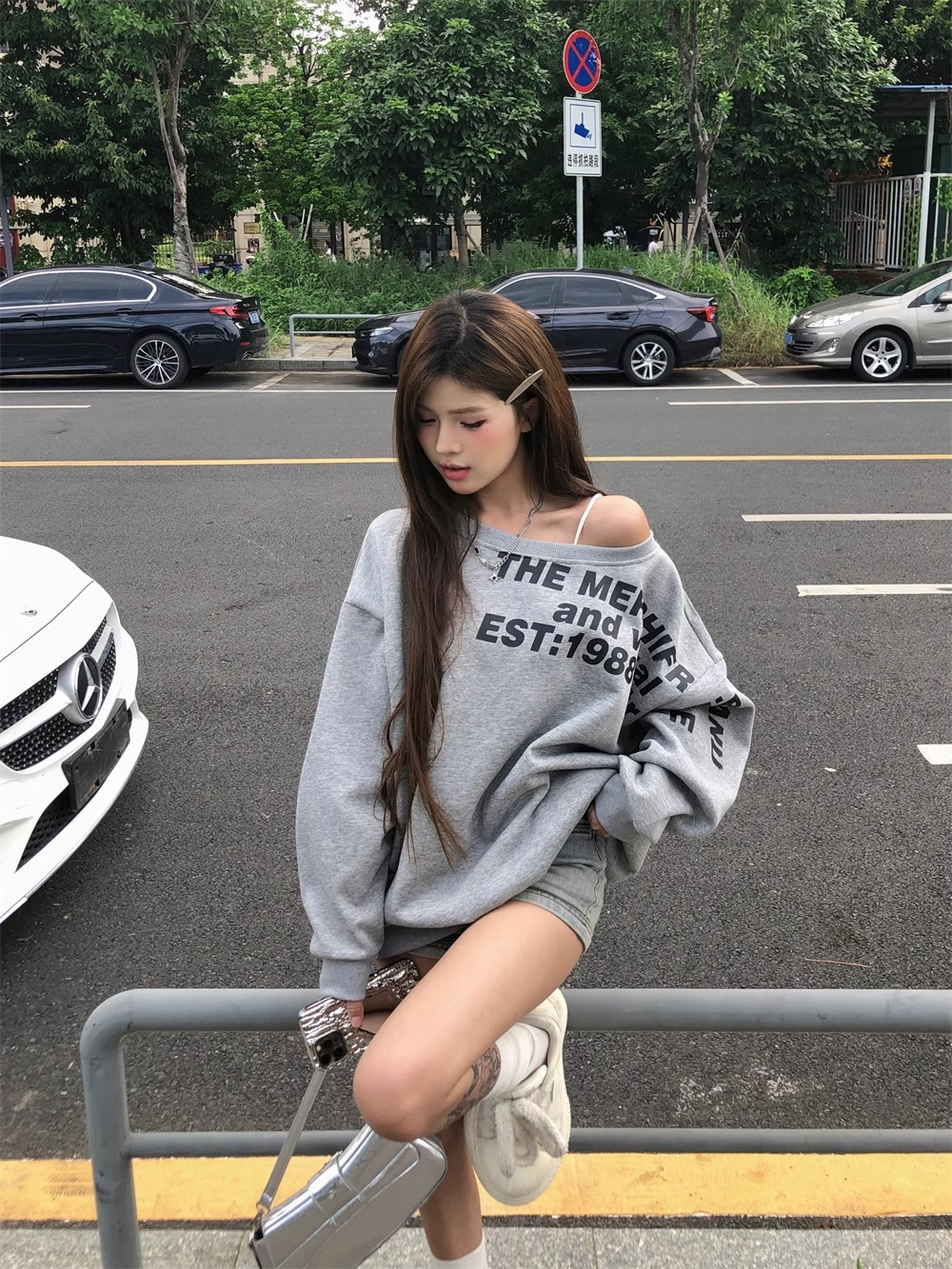 春秋季新款美式字母印花設計感斜肩長袖衛衣女慵嬾套頭上衣