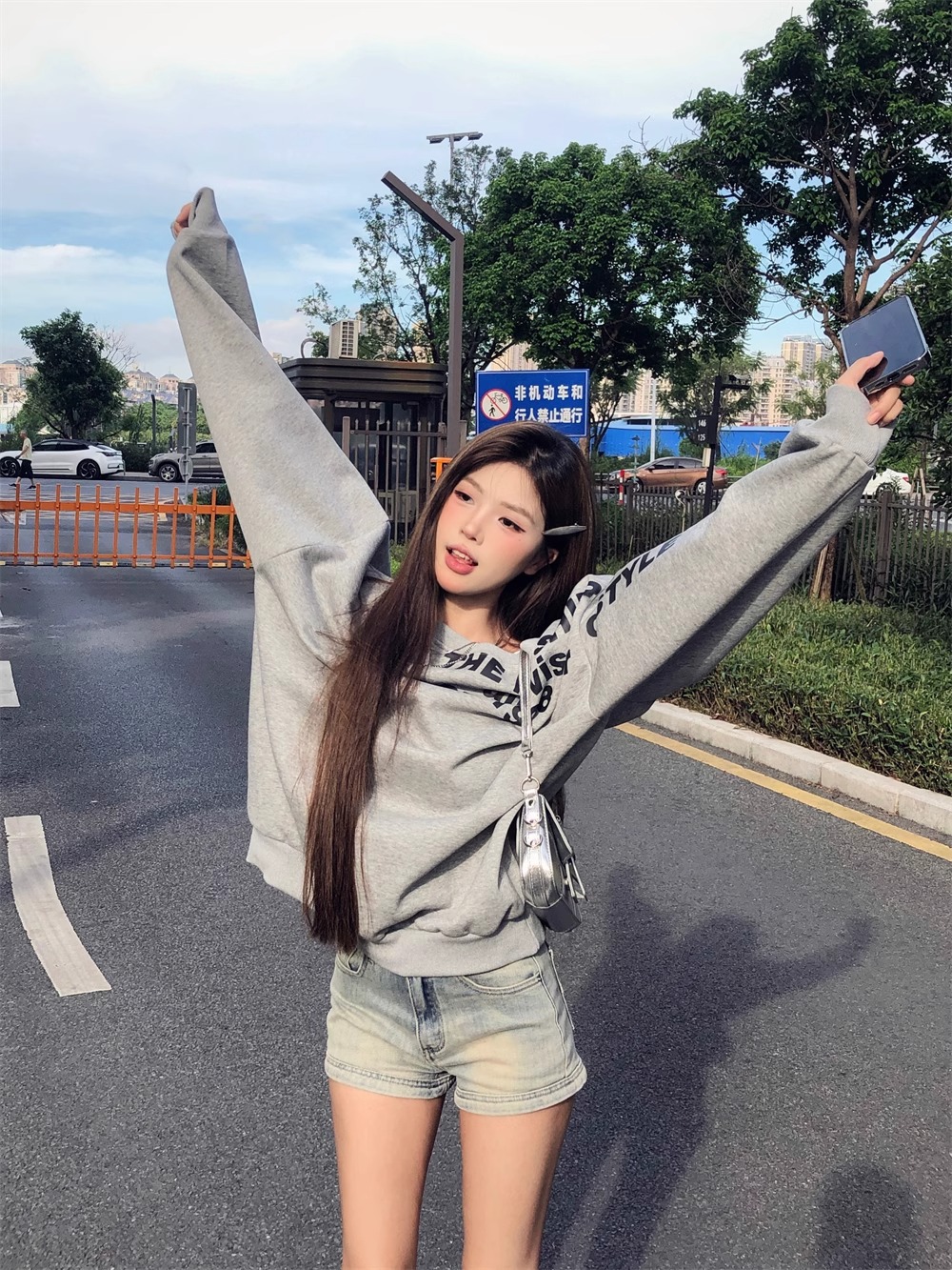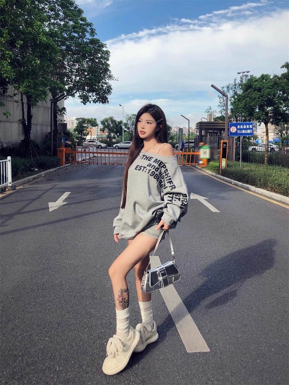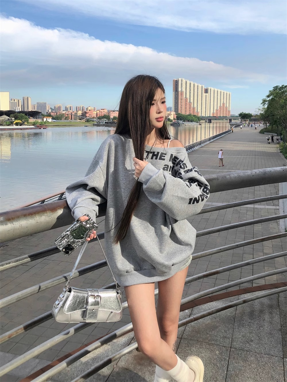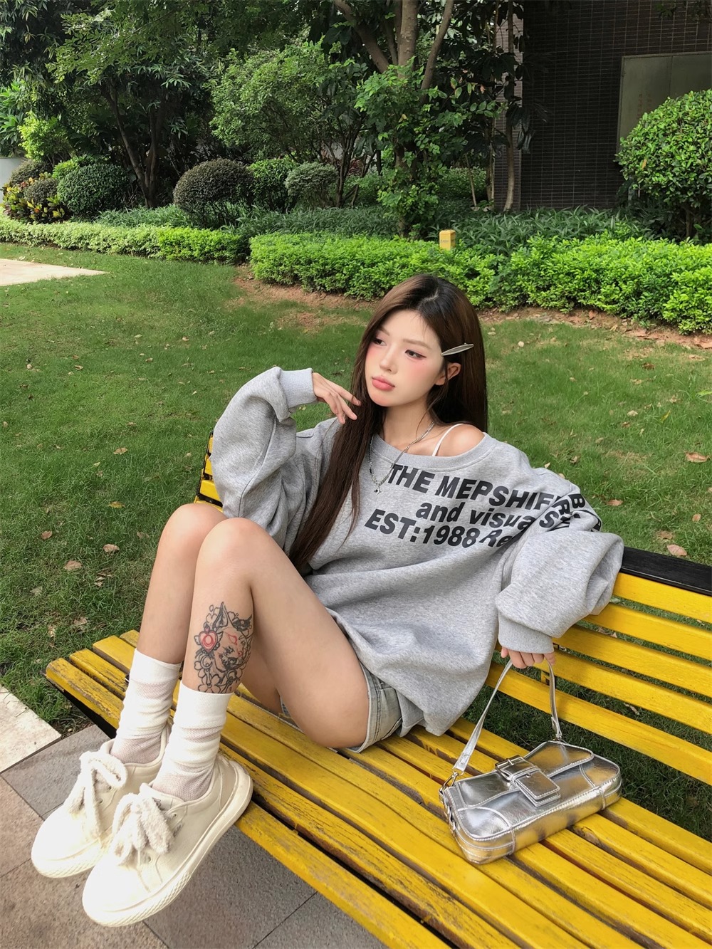 春秋季新款美式字母印花設計感斜肩長袖衛衣女慵嬾套頭上衣