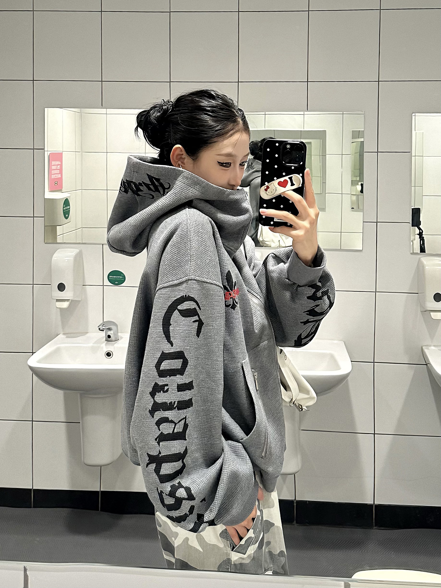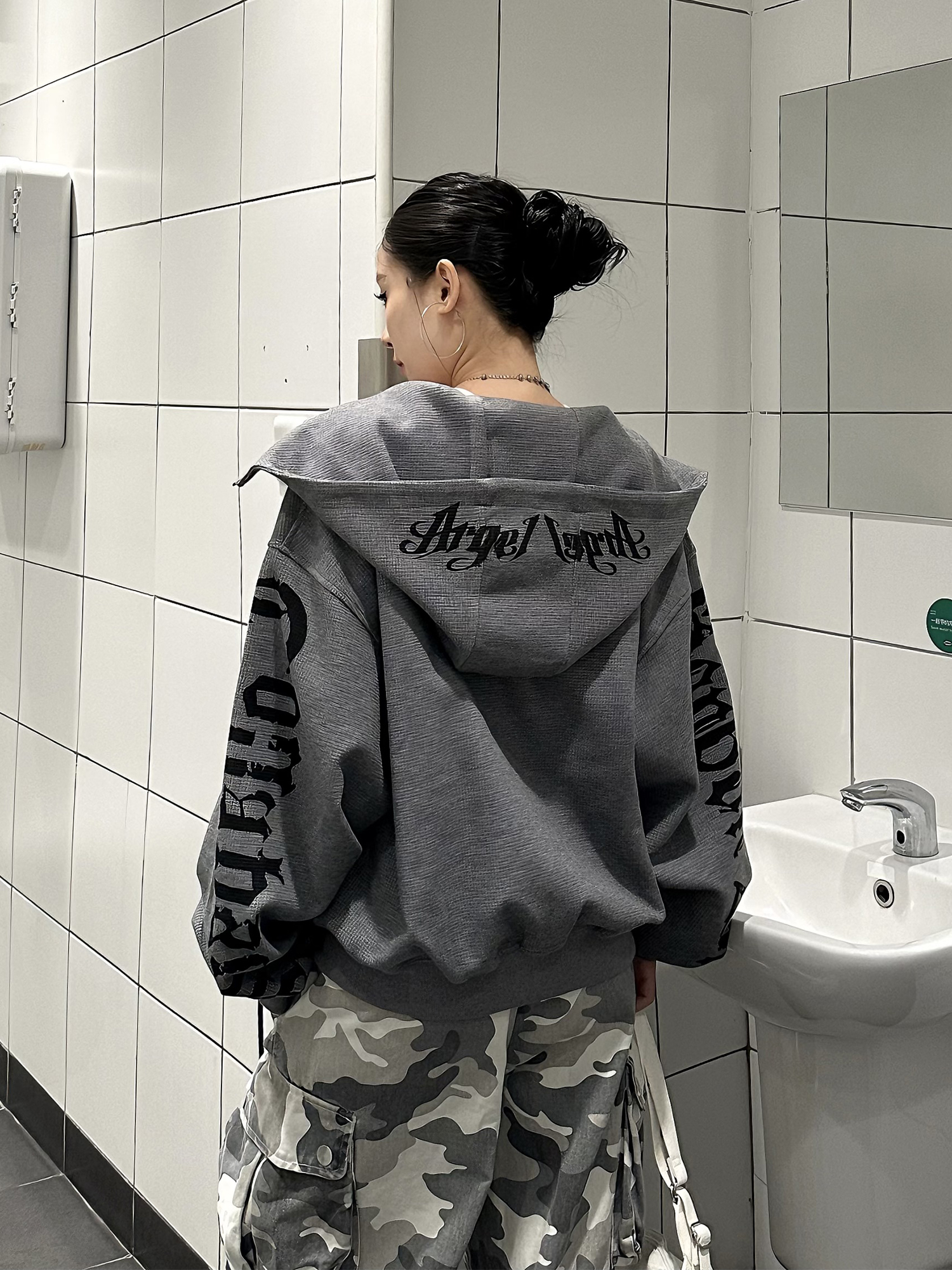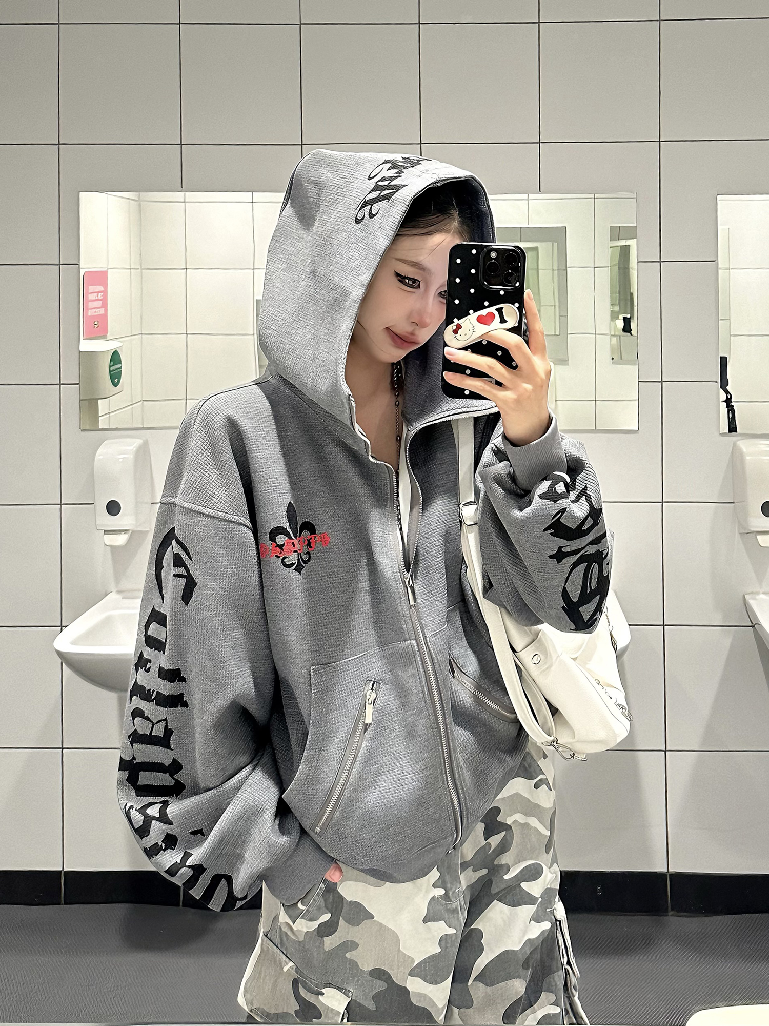 爆爆糖美式復古哥特式字母華夫格連帽衛衣外套男女秋寬松開衫上衣