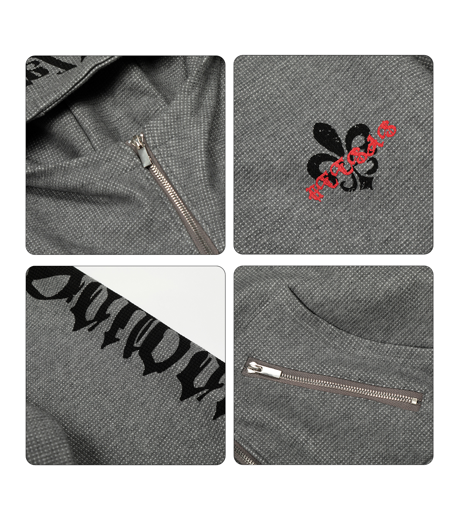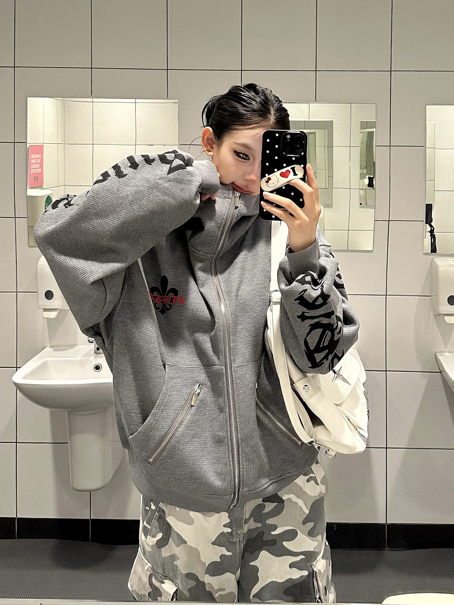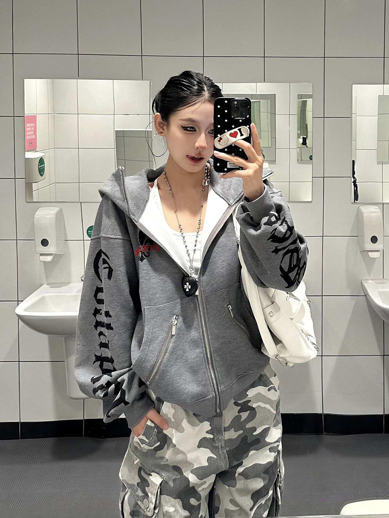 爆爆糖美式復古哥特式字母華夫格連帽衛衣外套男女秋寬松開衫上衣