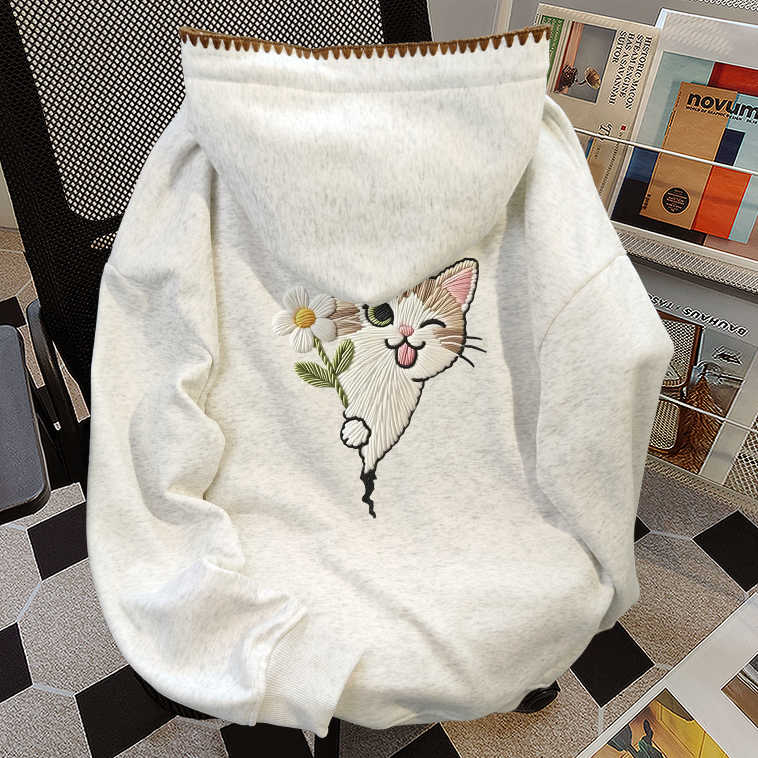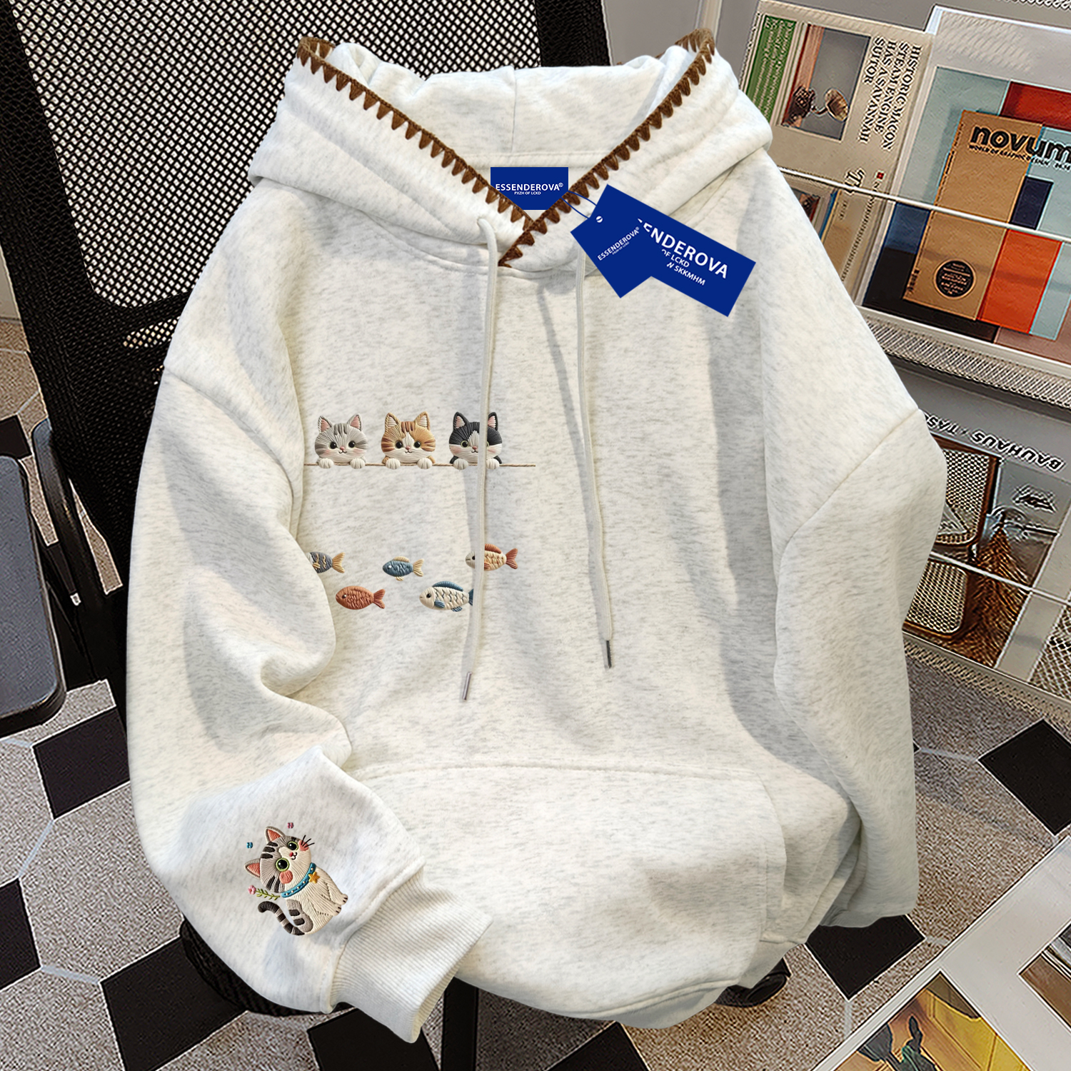 韓版美式可愛貓咪印花慵懶花邊連帽衛衣女秋冬vibe小衆學院風上衣