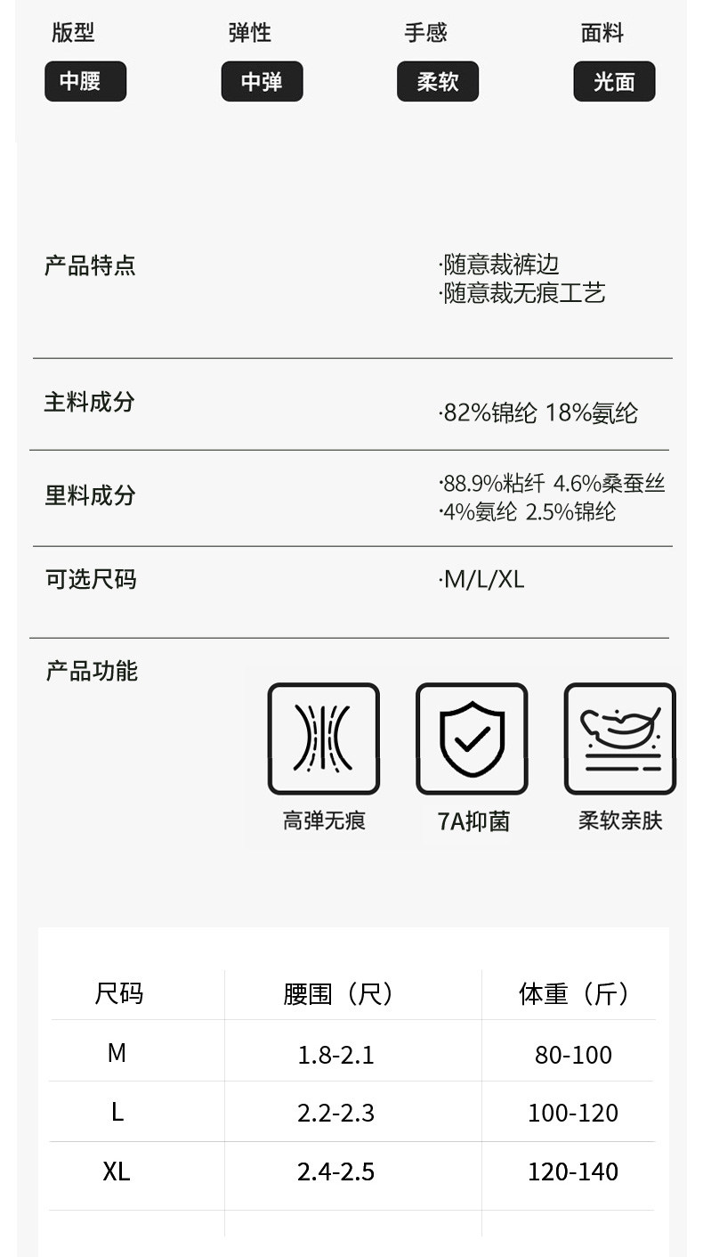 | 襠部材質成分 | 粘膠纖維(粘纖)88.9% 桑蠶絲4.6% 聚氨酯彈性纖維(氨綸)4% 聚醯胺纖維(錦綸)2.5% |