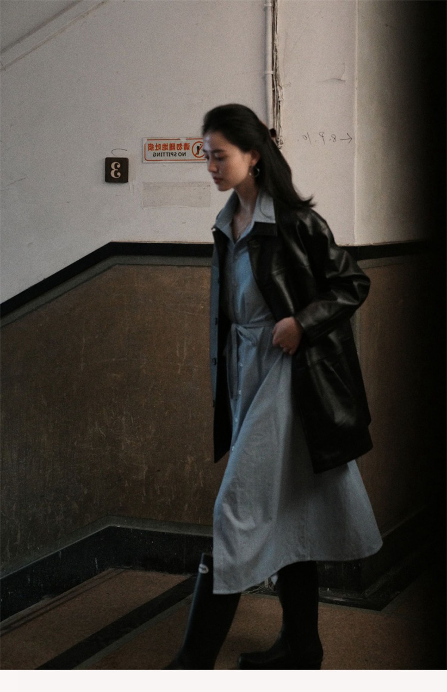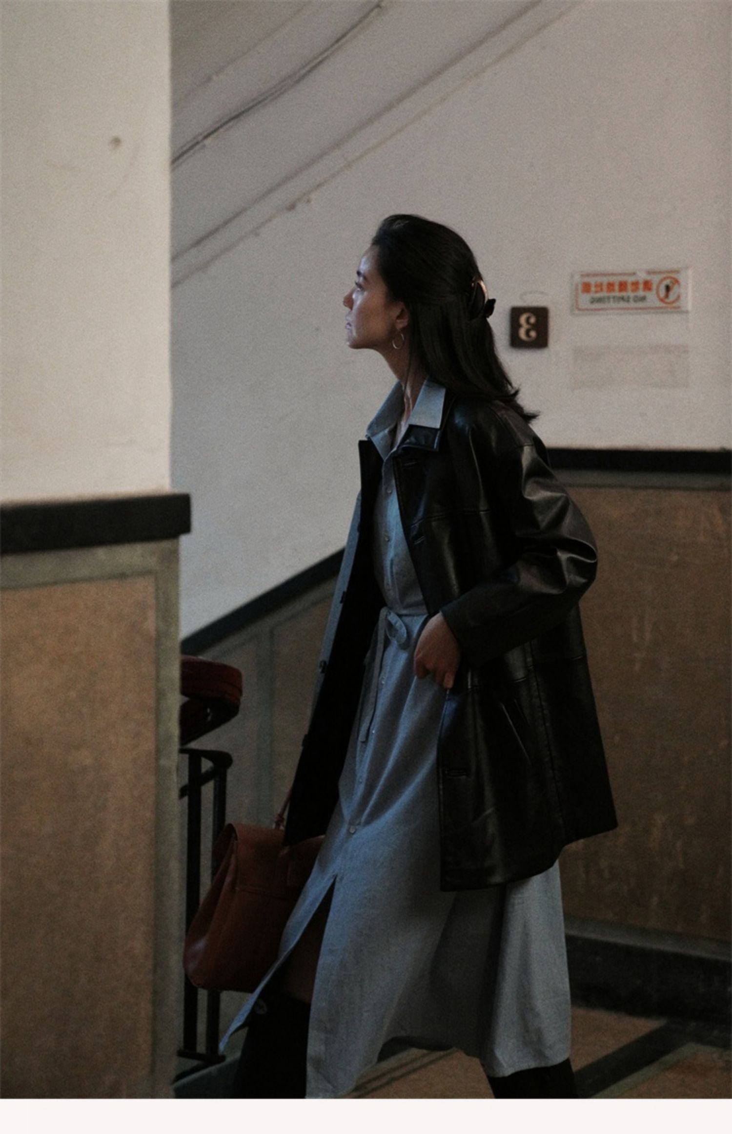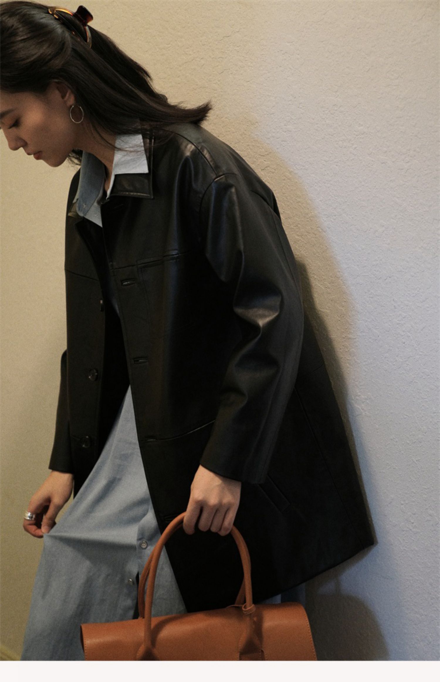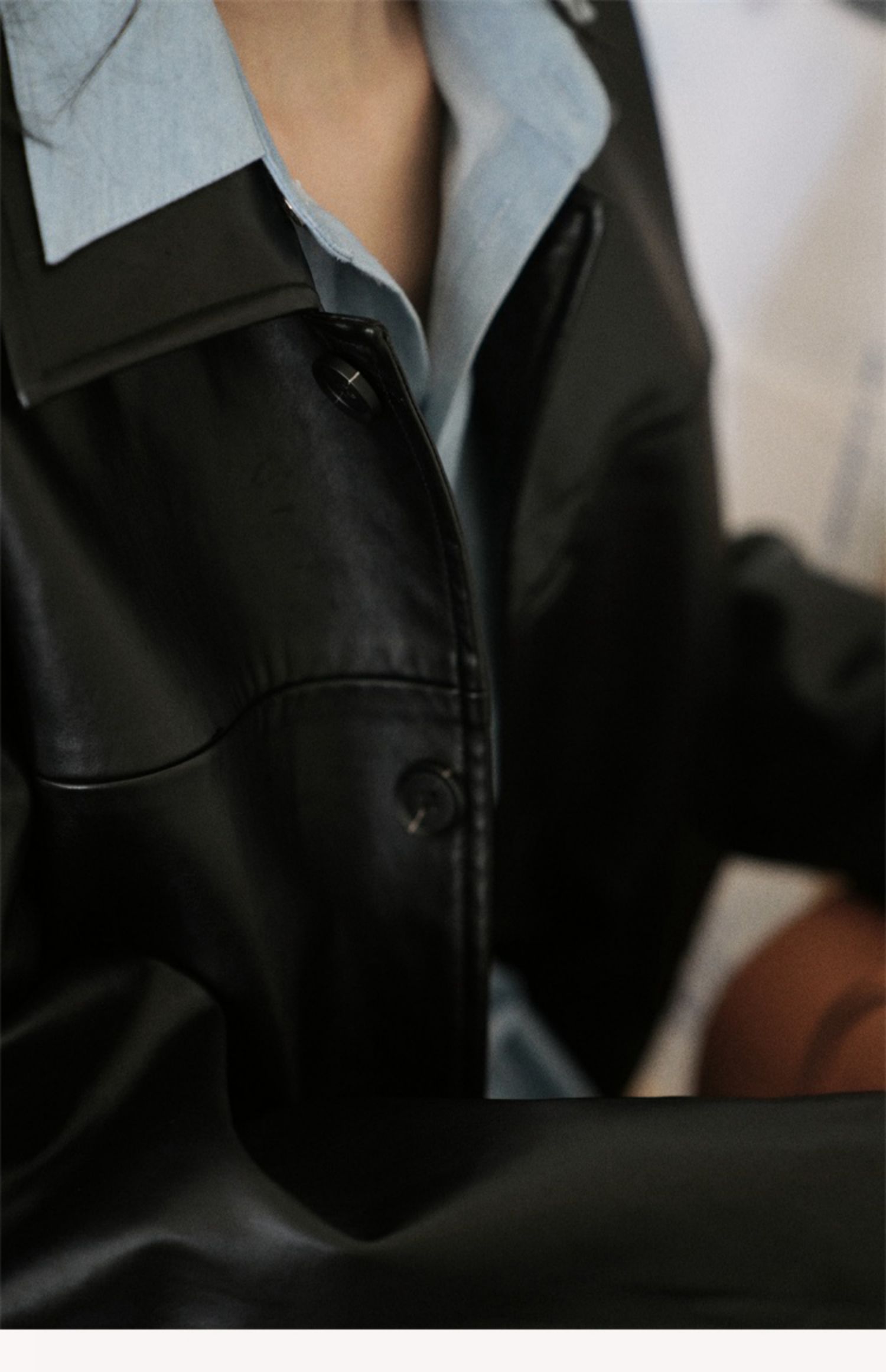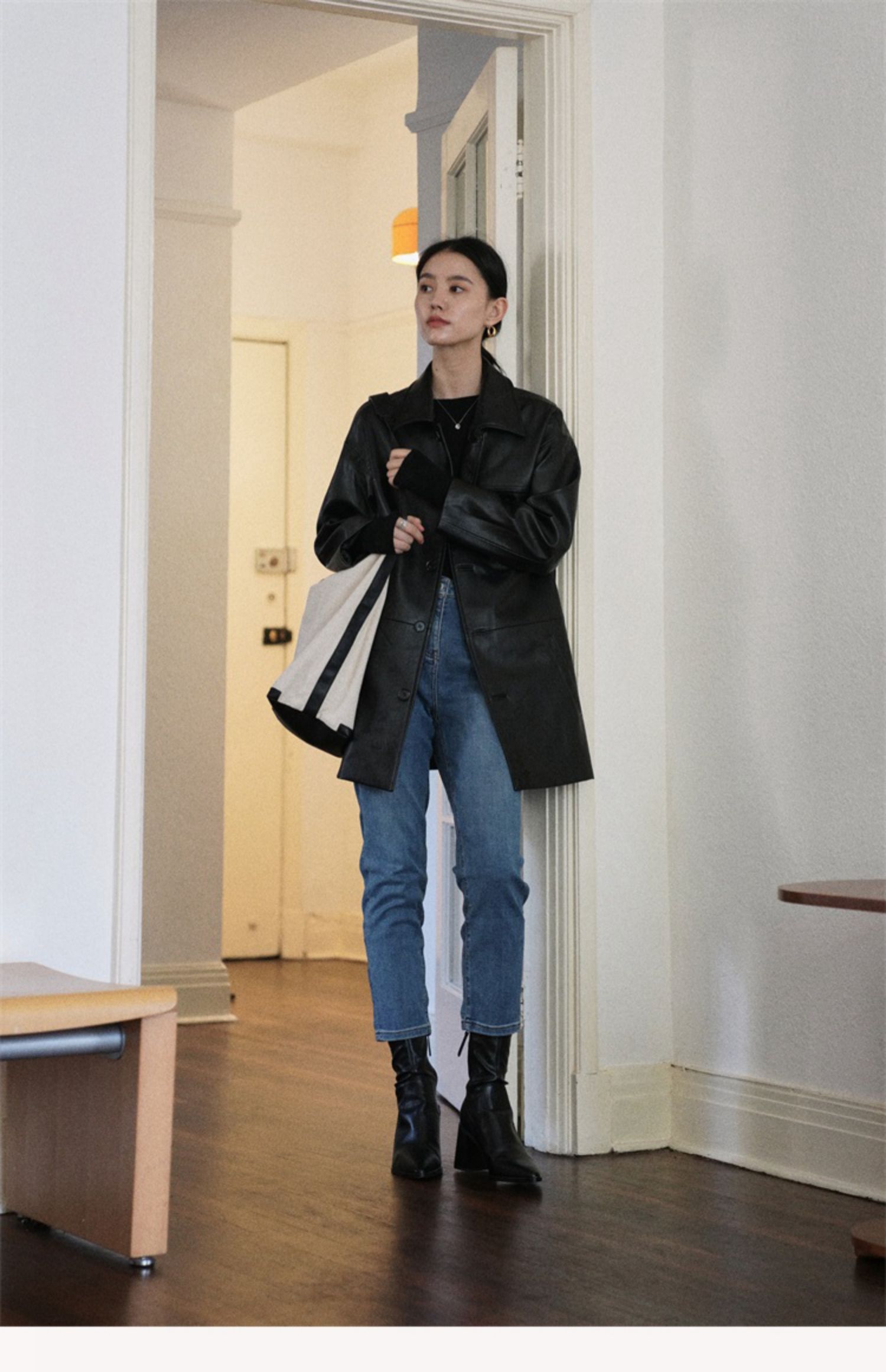 法式復古黑色拼接皮衣外套女2025春秋季新款寬松氣質中長款夾克女