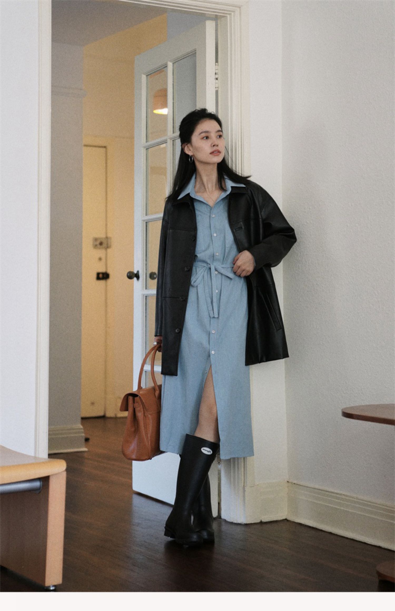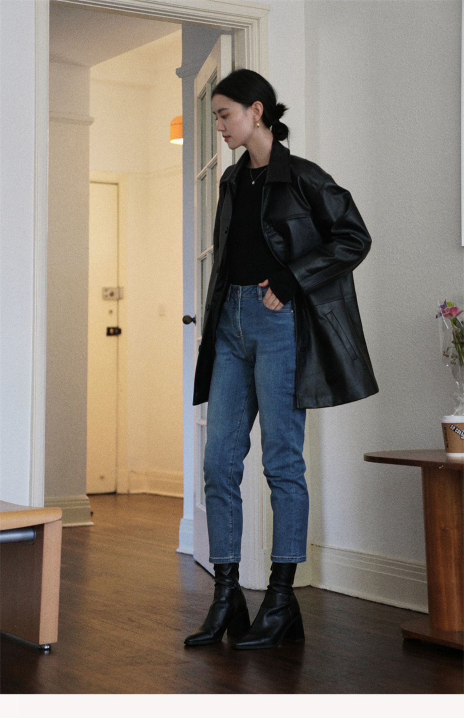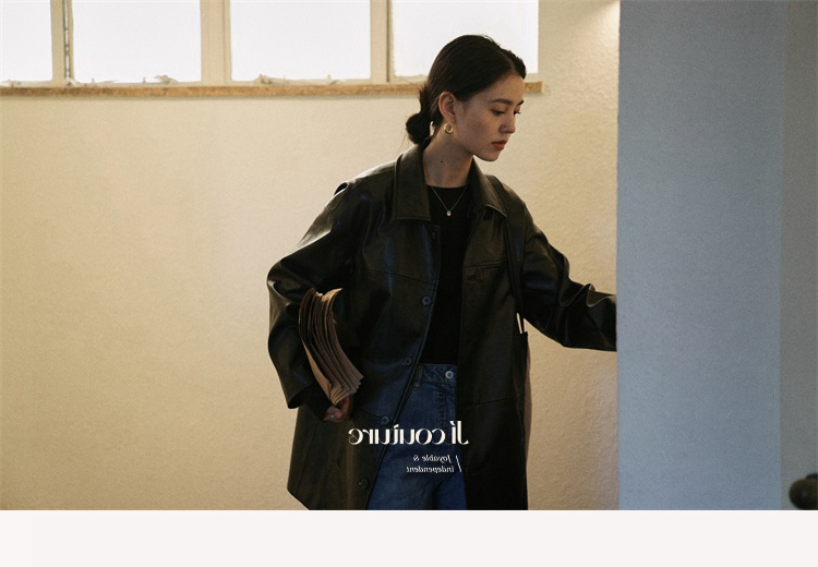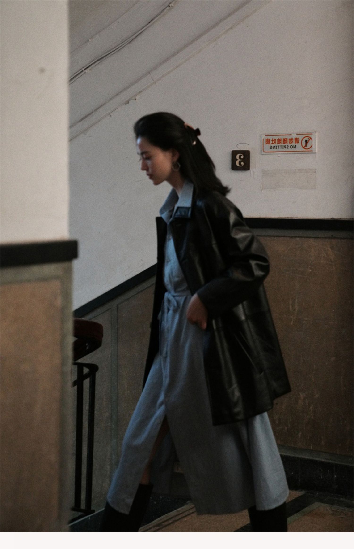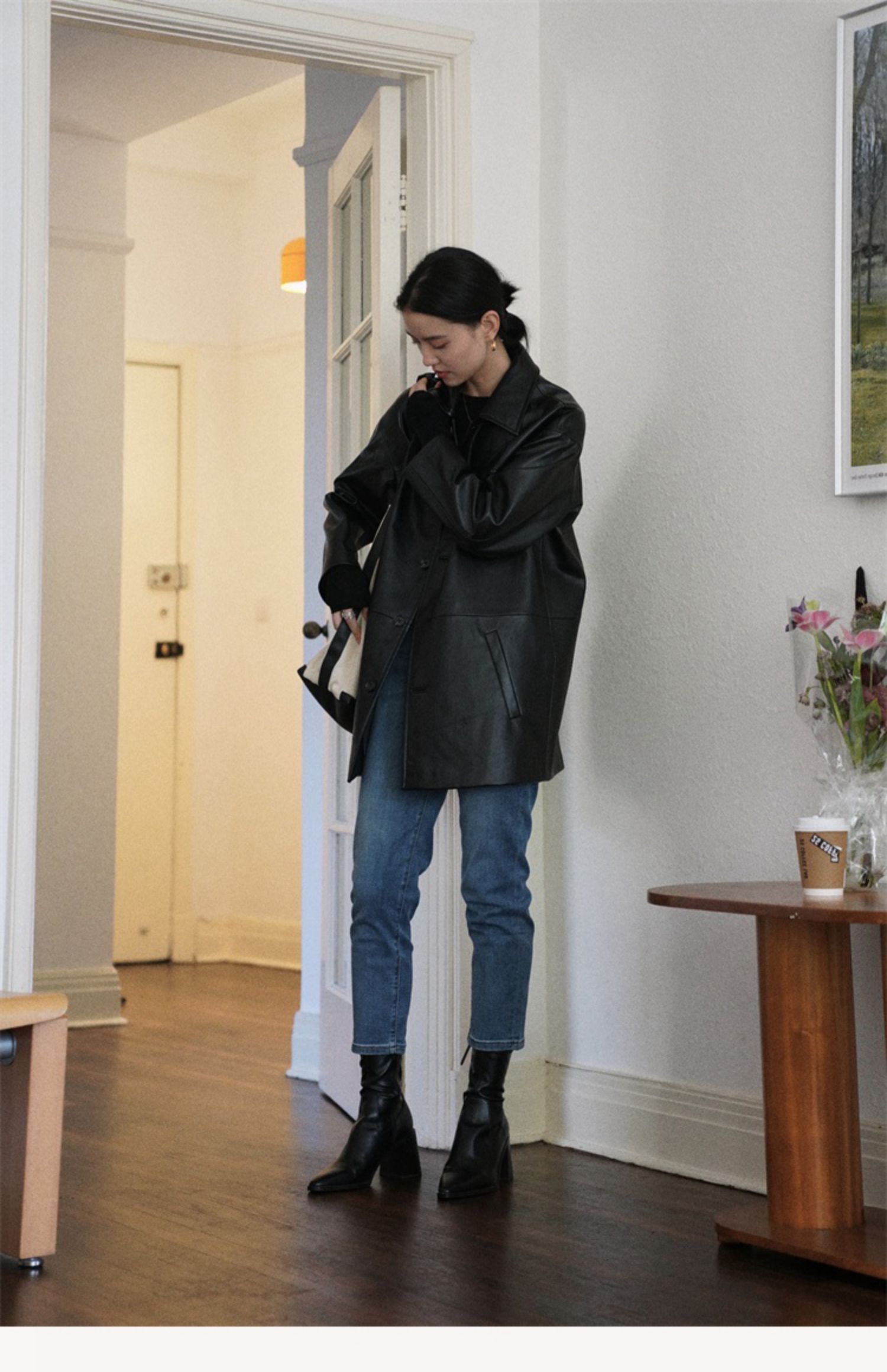 法式復古黑色拼接皮衣外套女2025春秋季新款寬松氣質中長款夾克女