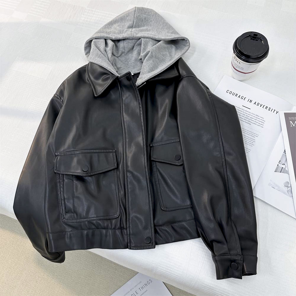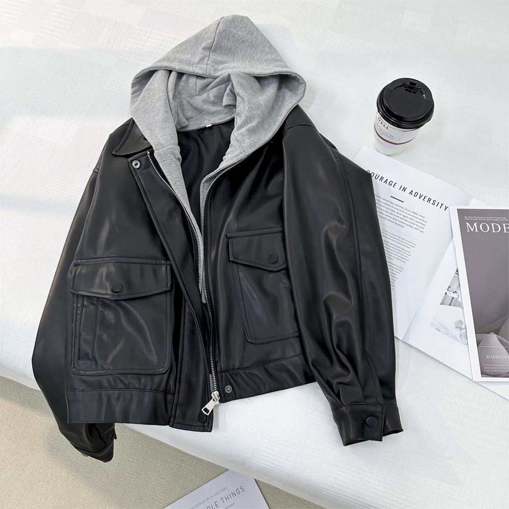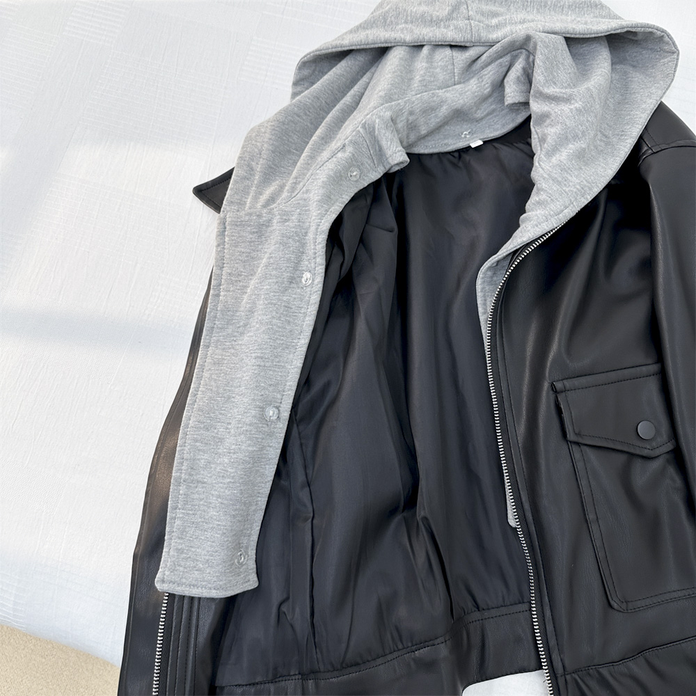 小個子俏皮減齡假兩件連帽皮衣外套女2024秋季新款學院風夾克上衣