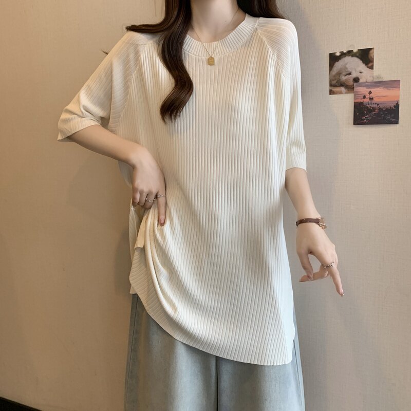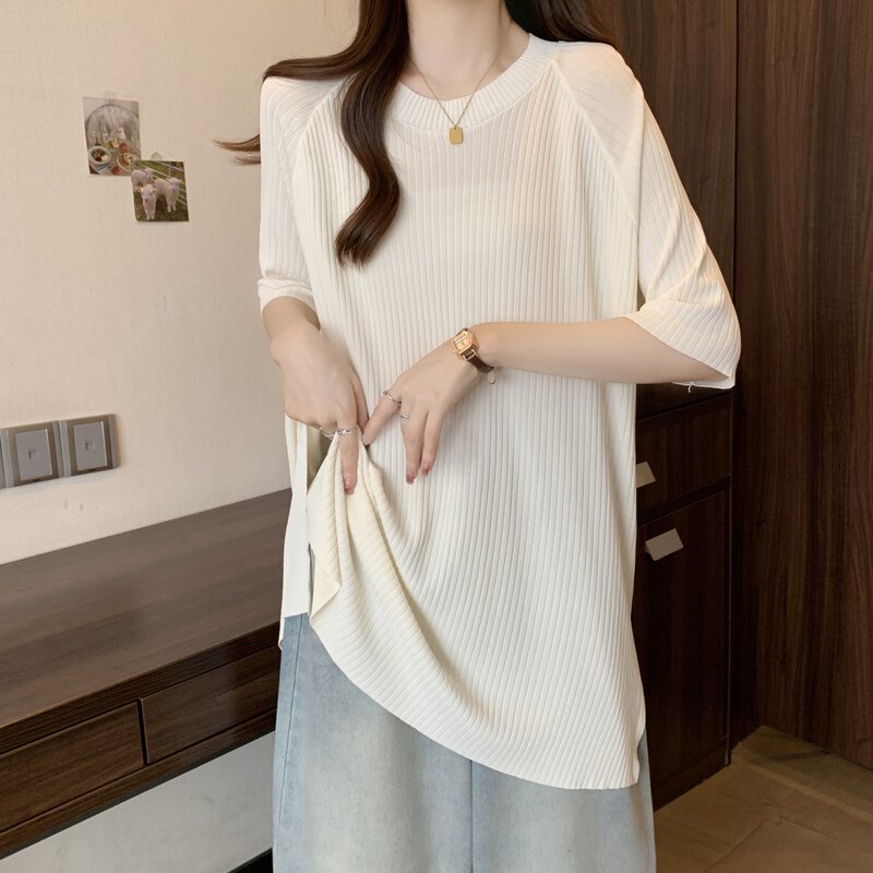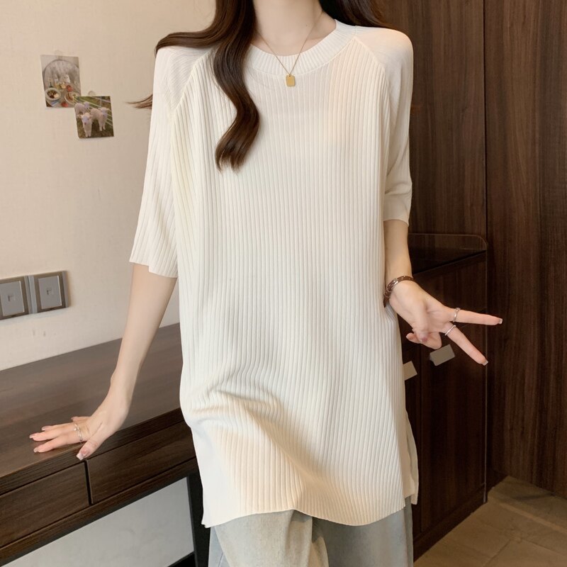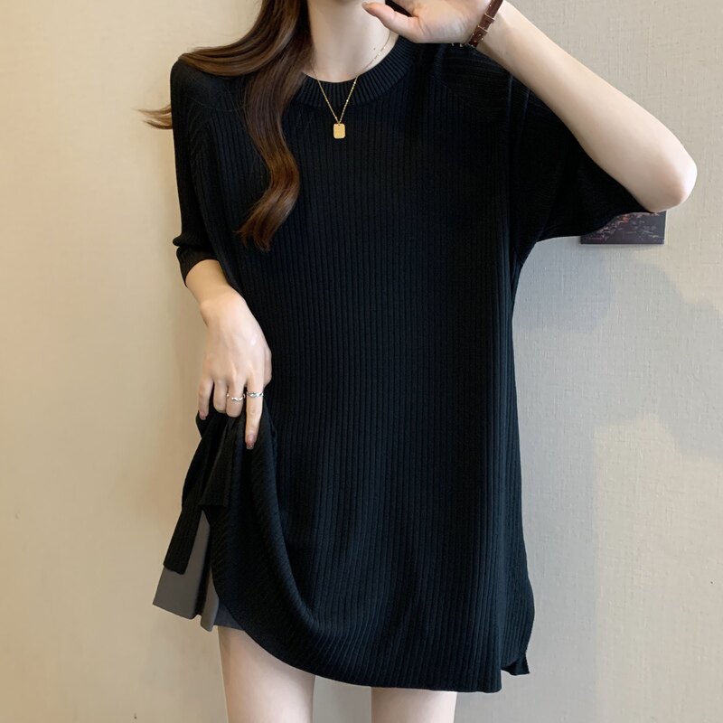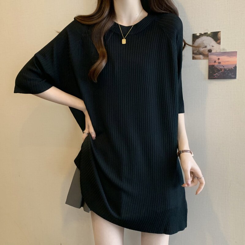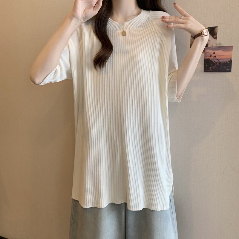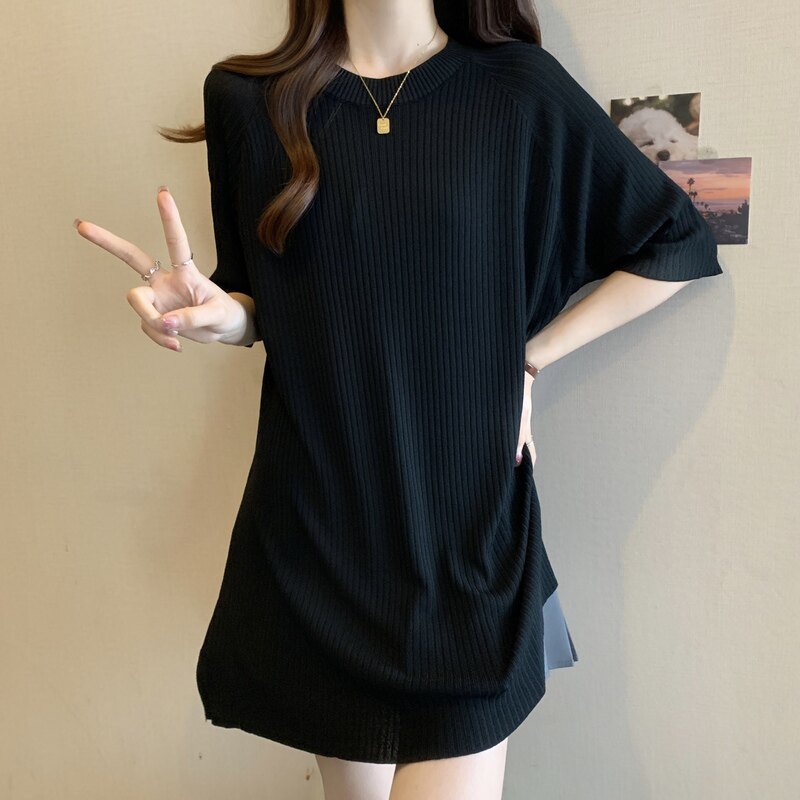大碼冰絲中長款短袖t恤女2026新款胖mm寬鬆慵懶風遮屁股開叉上衣