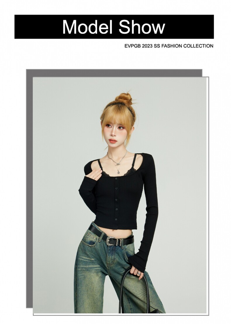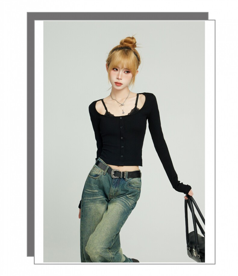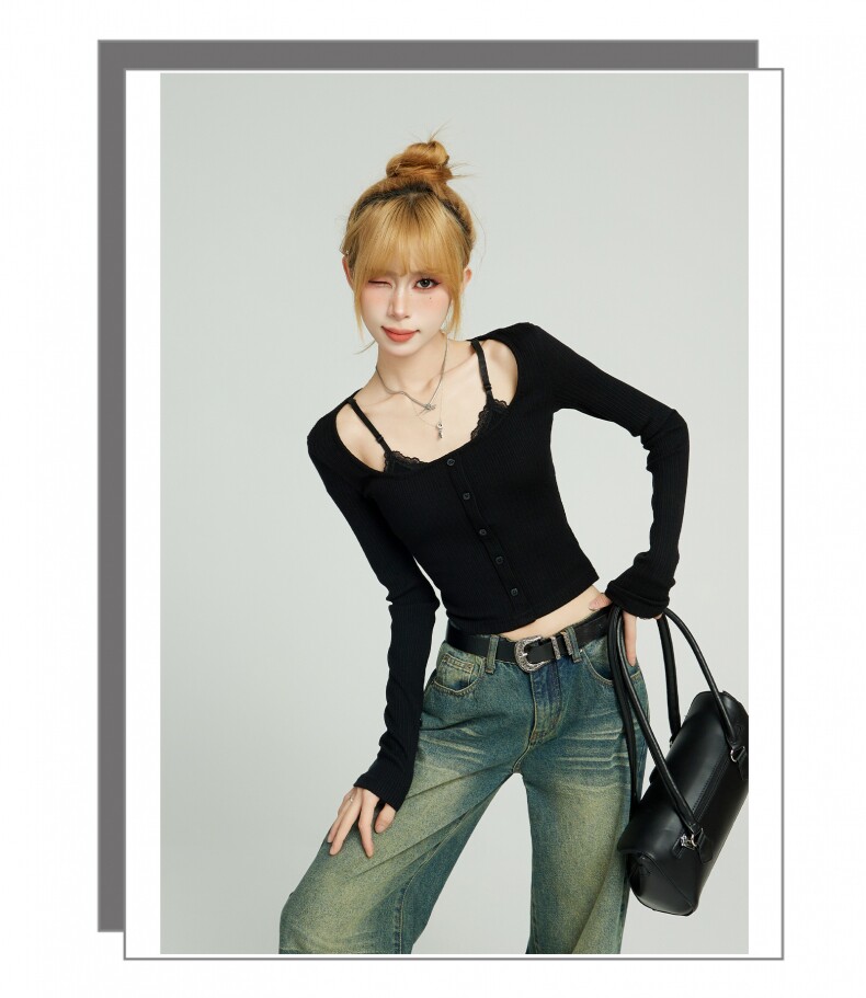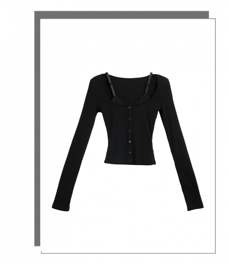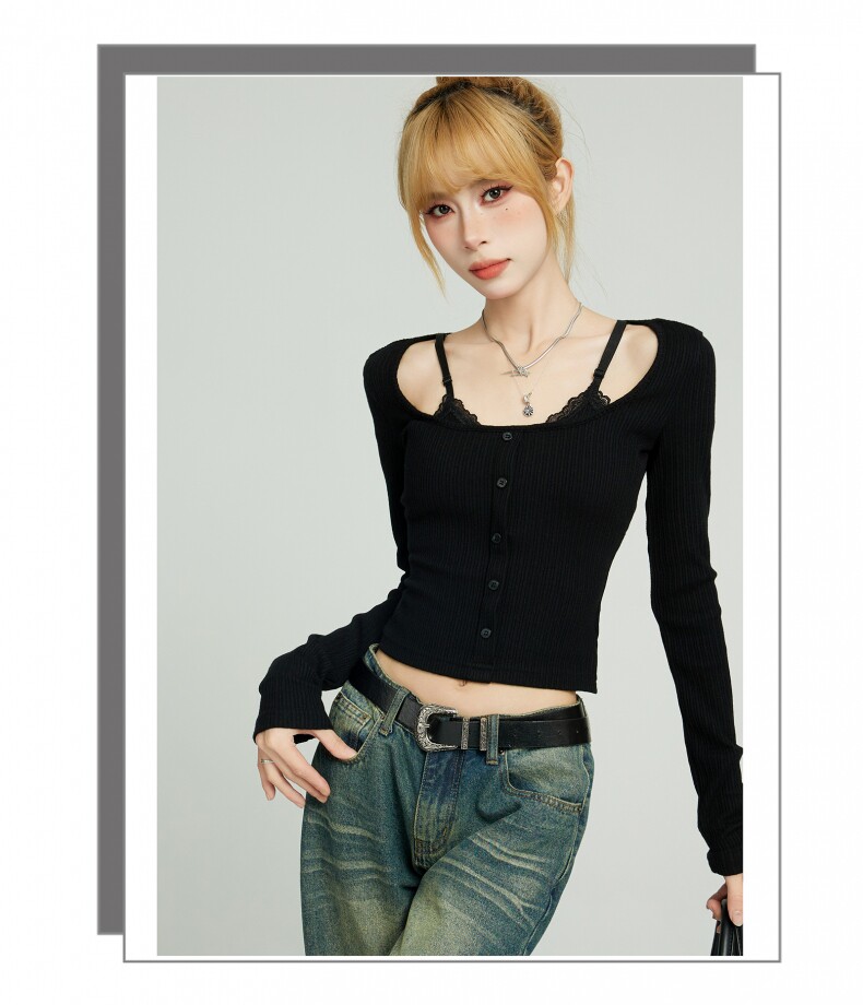 辣妹黑色假兩件蕾絲長袖t恤女早秋修身內搭打底吊帶短款上衣秋季