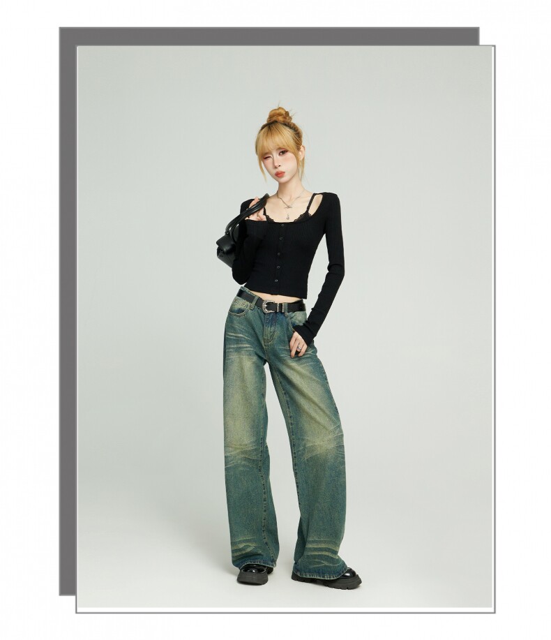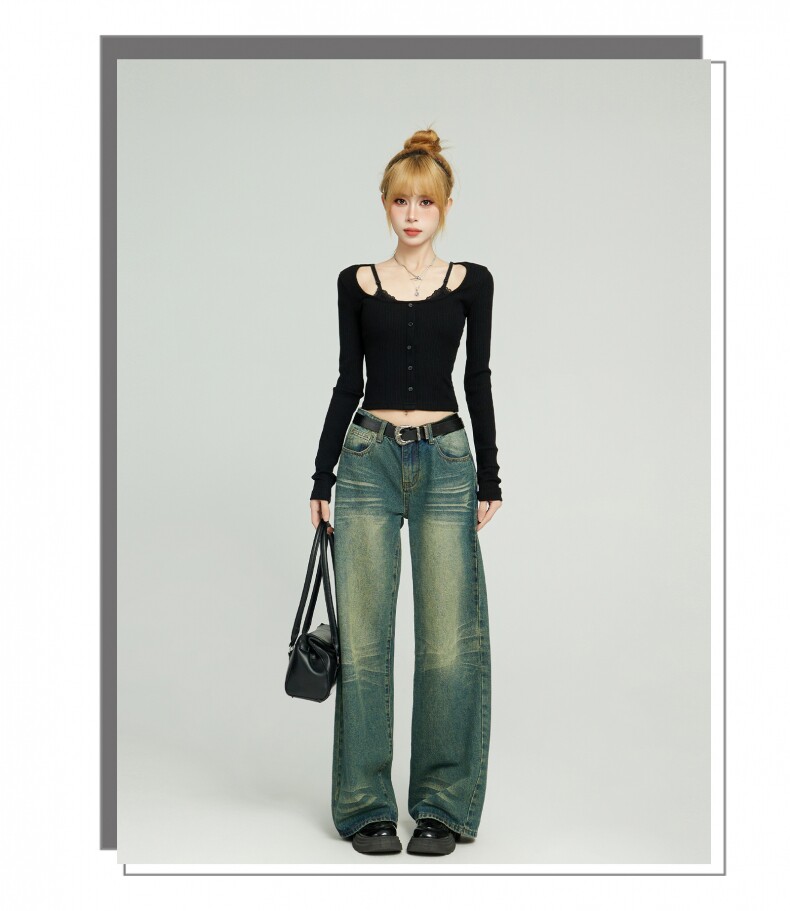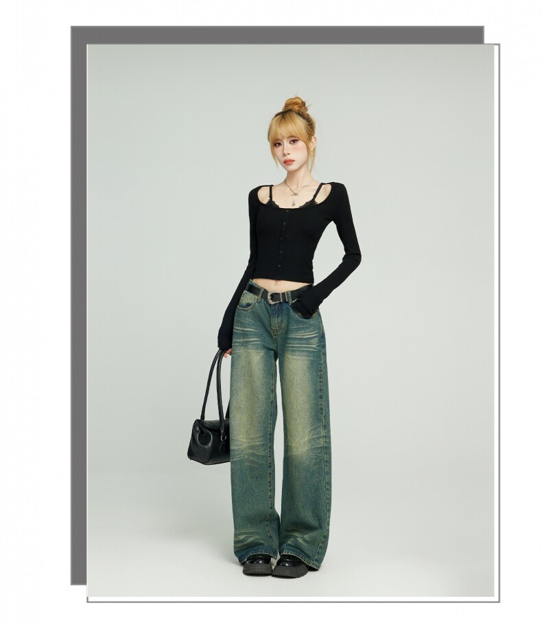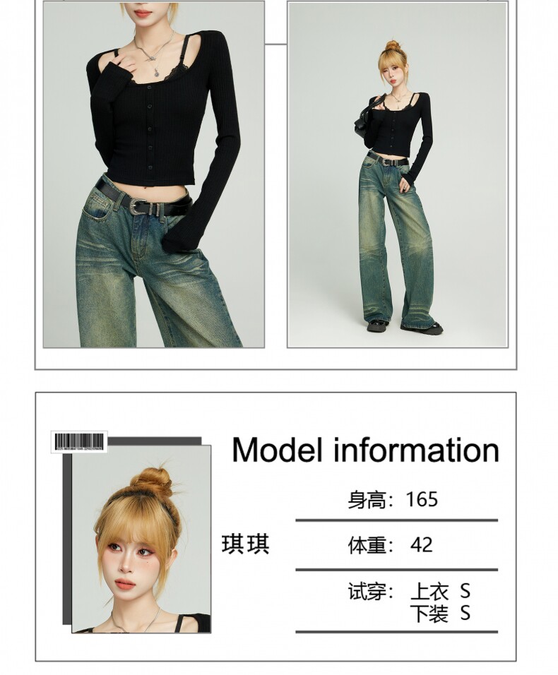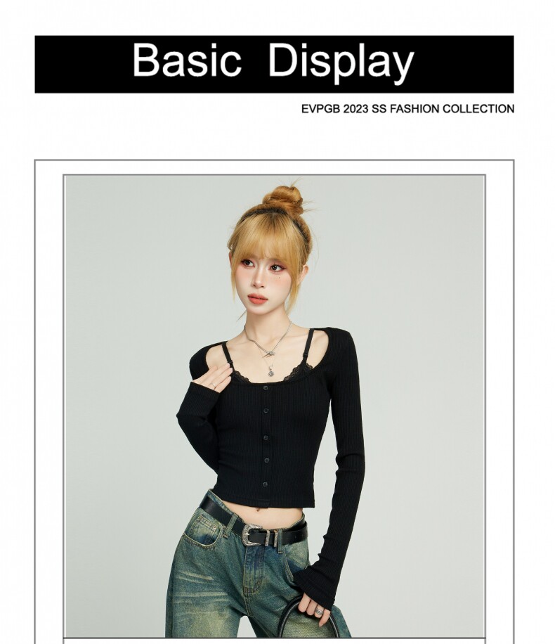 辣妹黑色假兩件蕾絲長袖t恤女早秋修身內搭打底吊帶短款上衣秋季