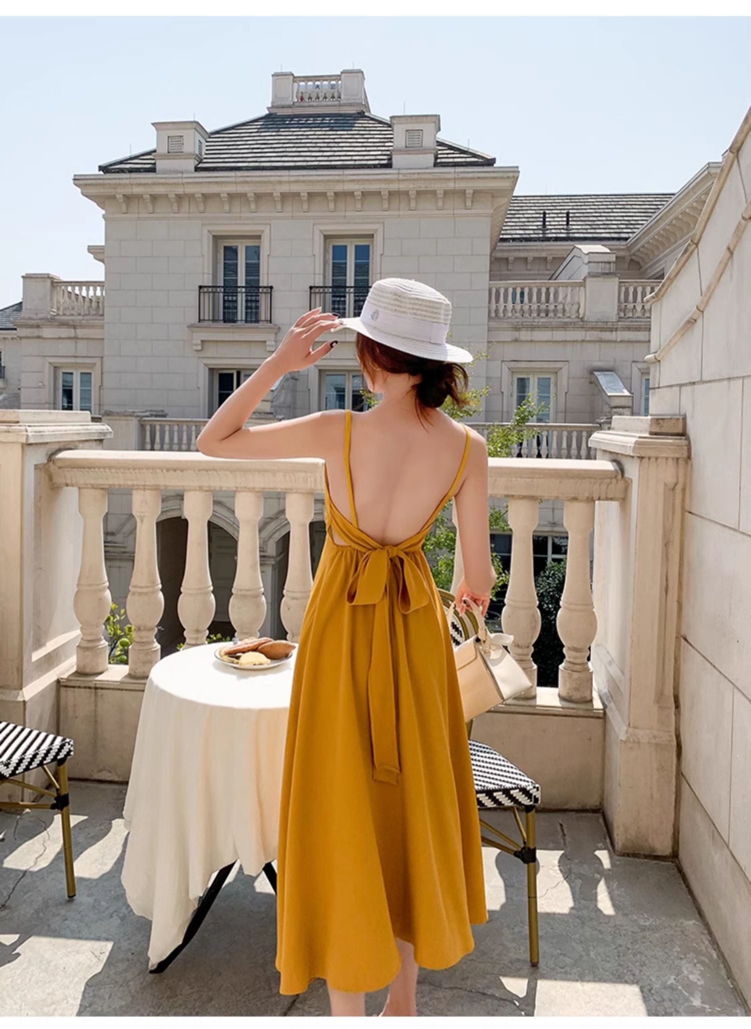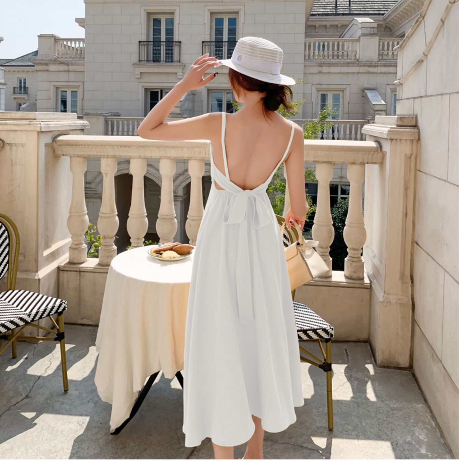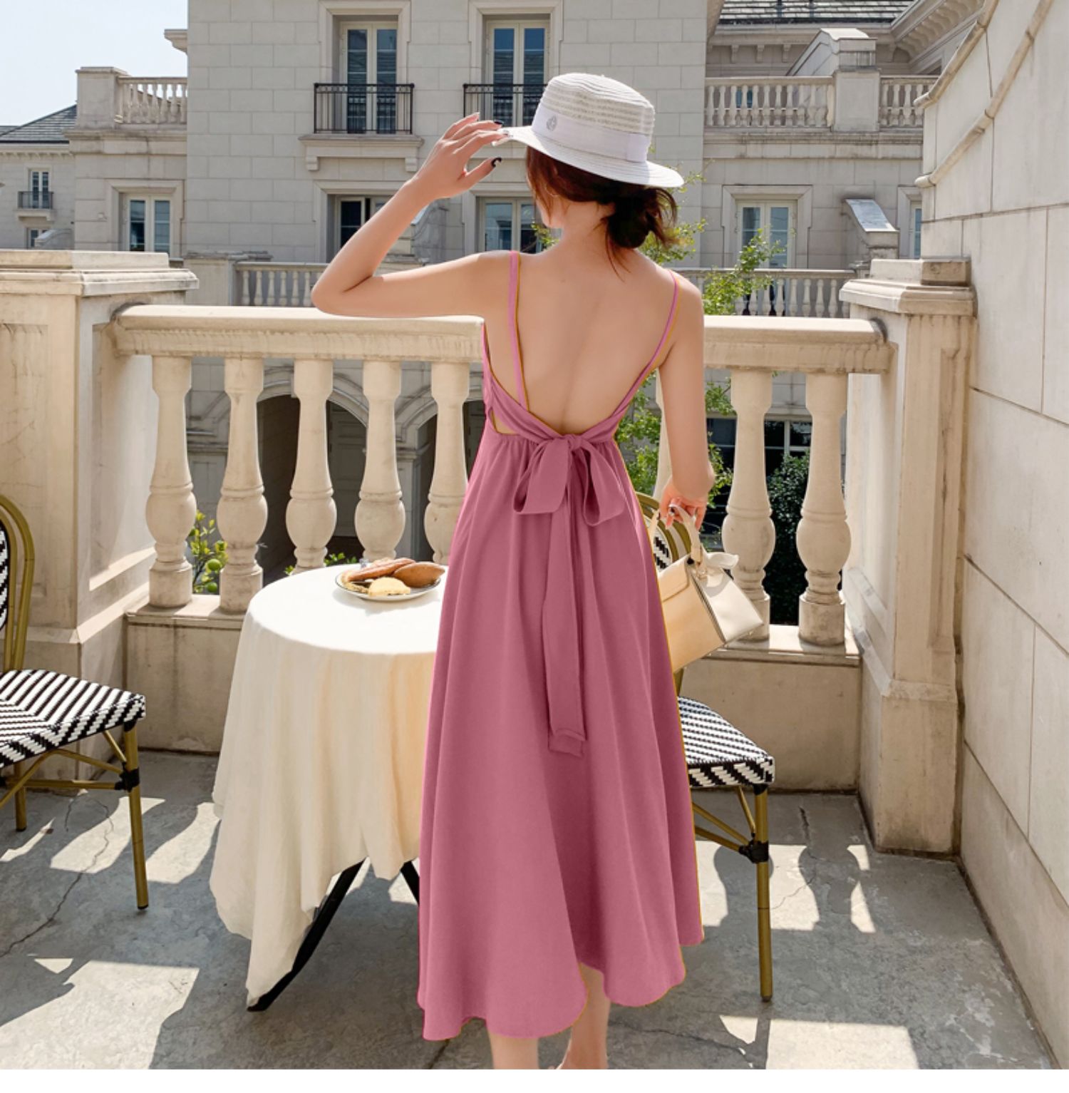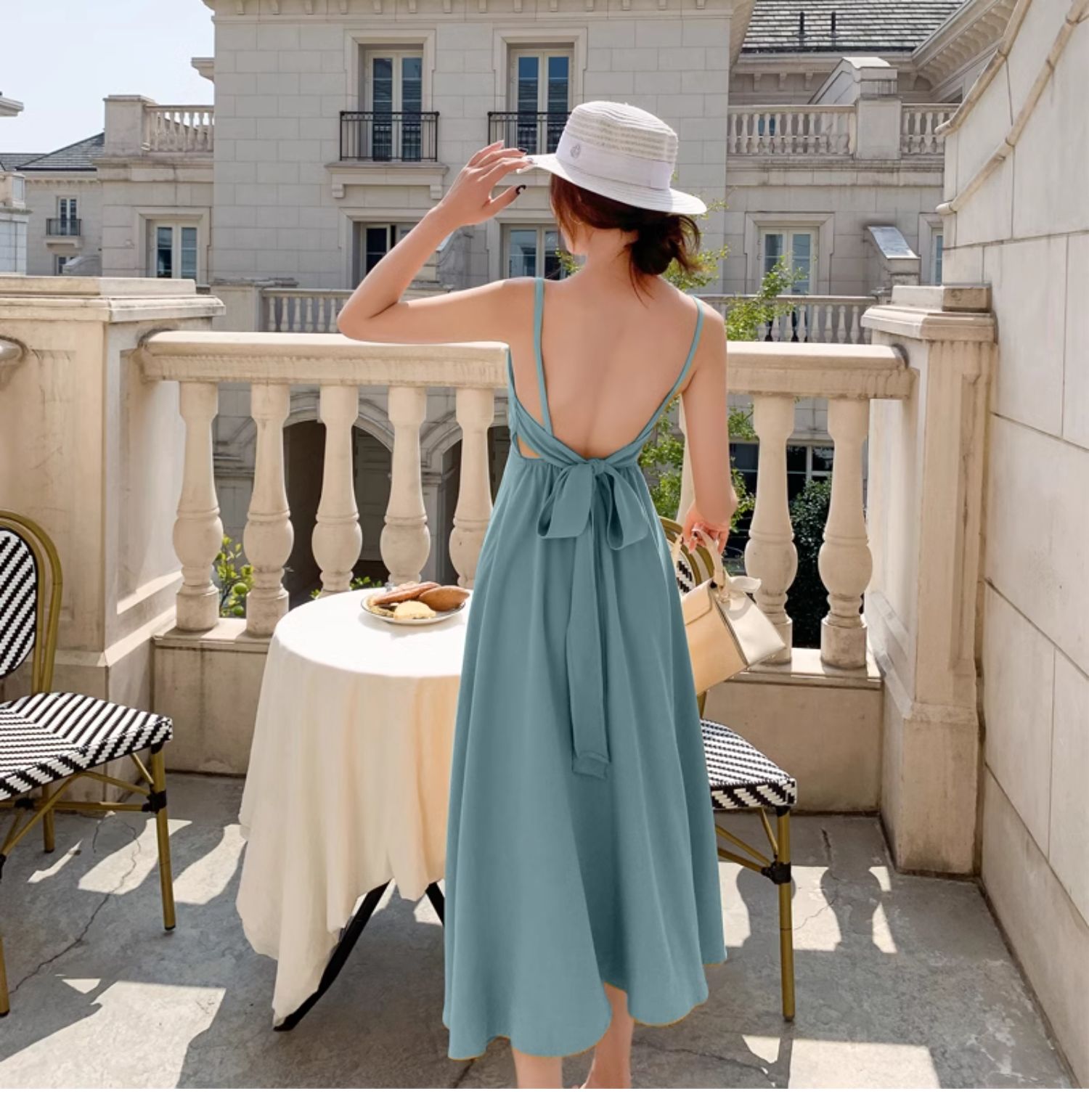 沙灘裙2025新款海邊旅遊度假性感露背長裙顯瘦V領吊帶連衣裙超仙