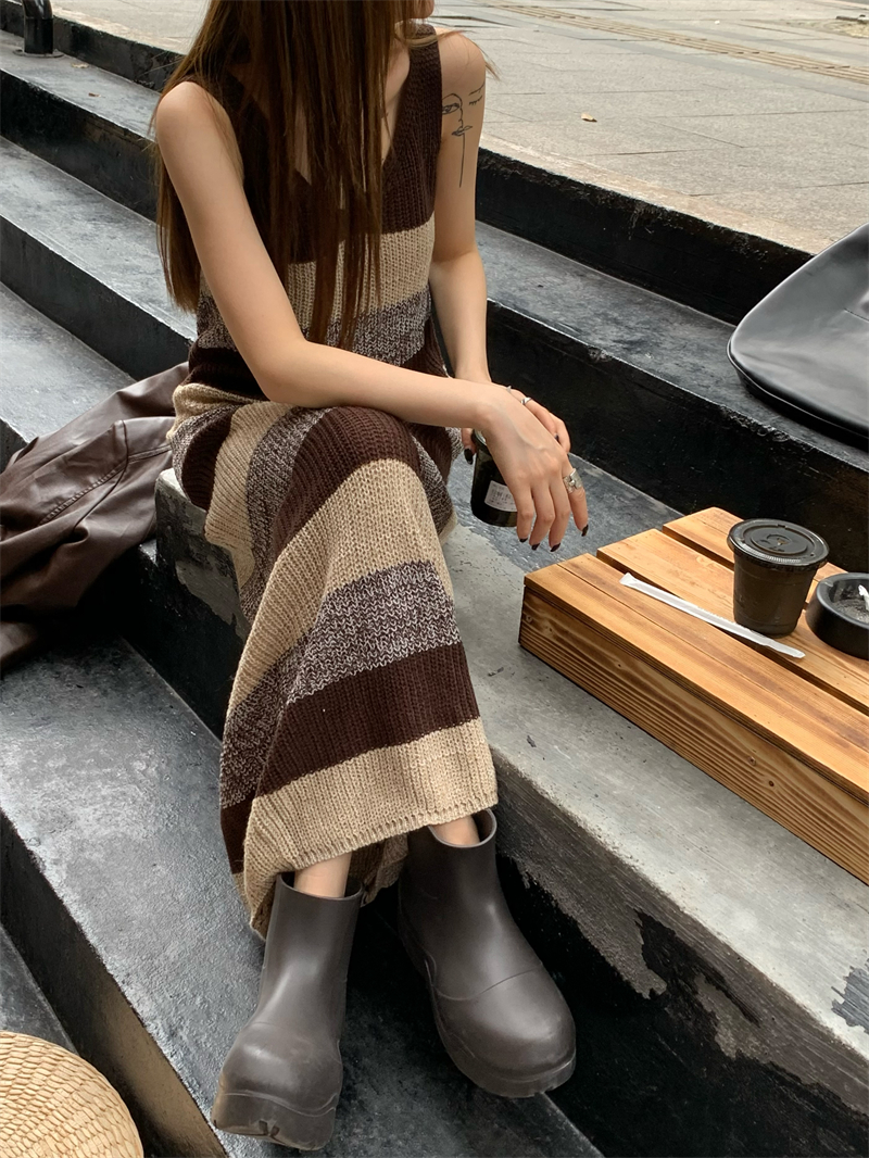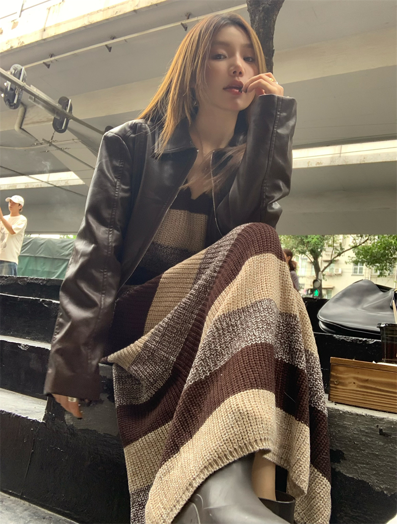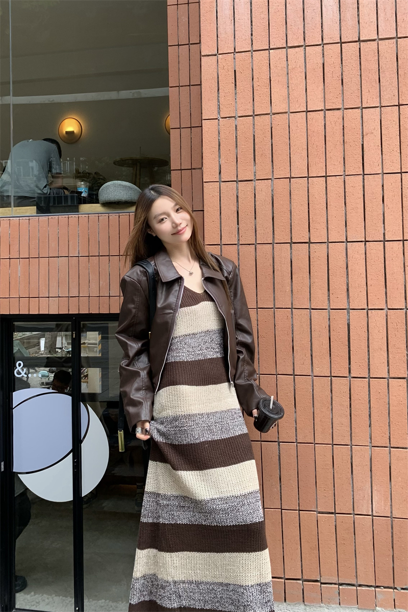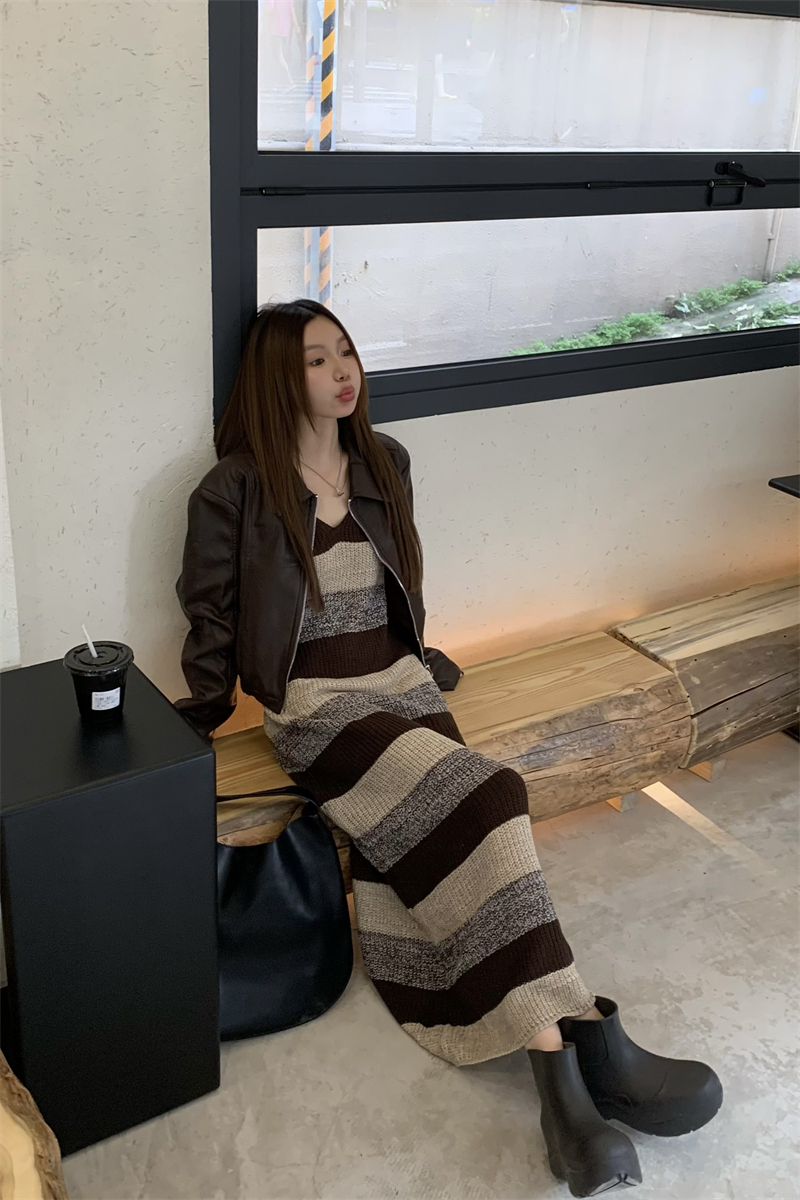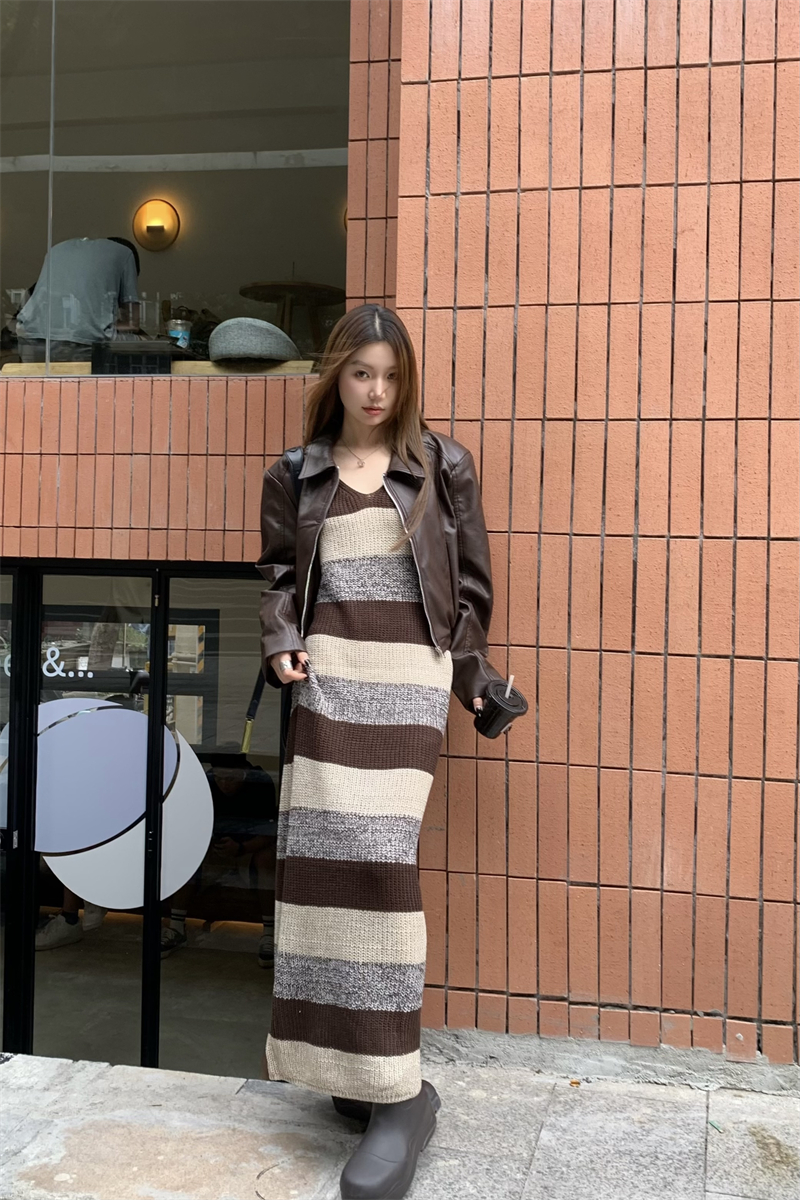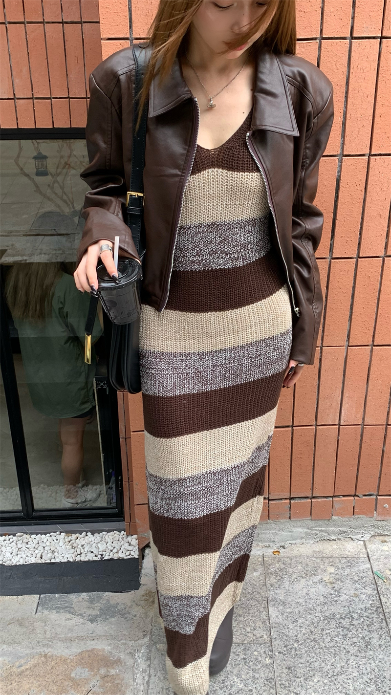 美拉德條紋針織連衣裙女春秋配皮衣打底毛衣裙慵懶垂墜感內搭長裙