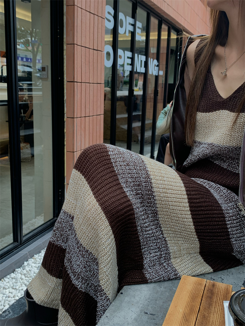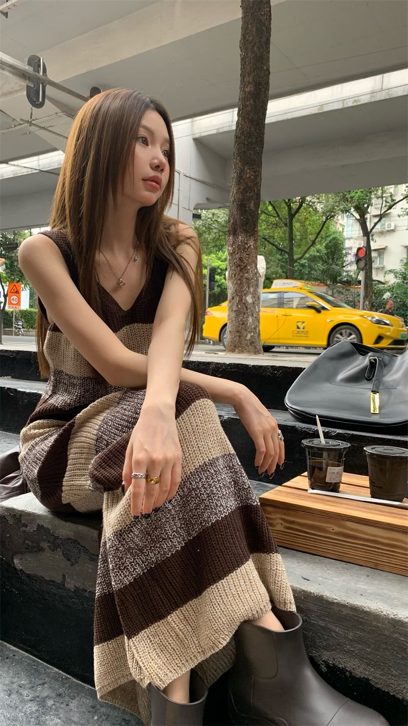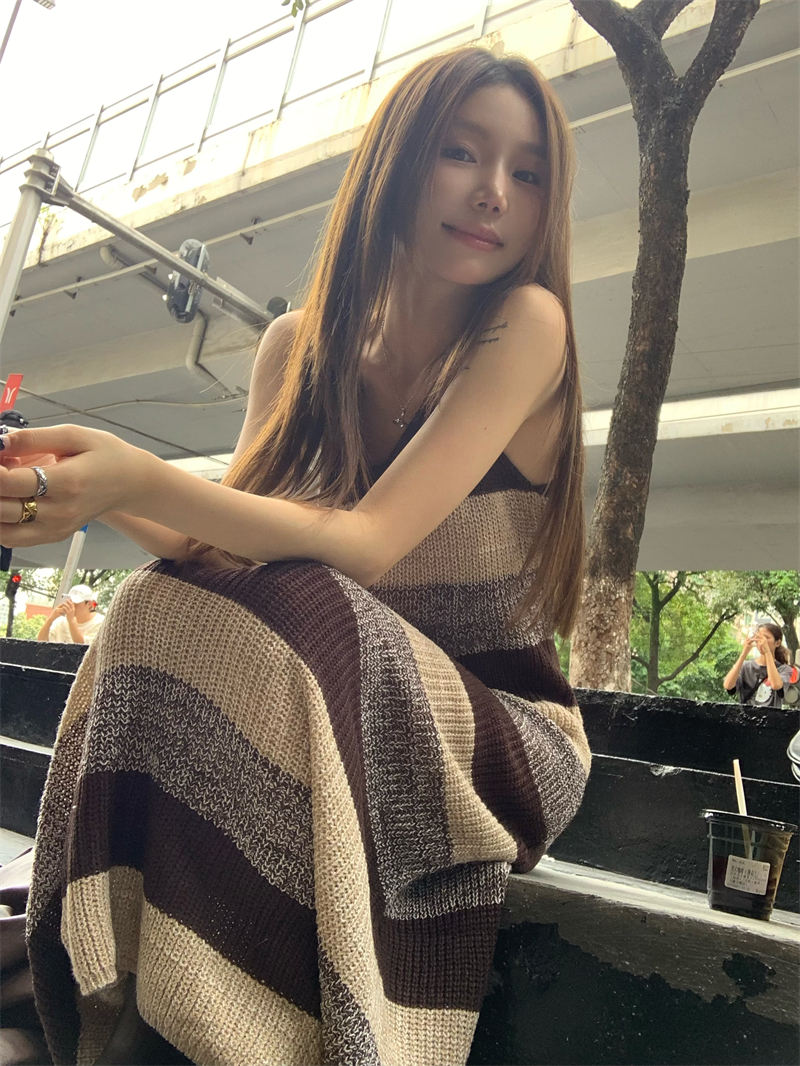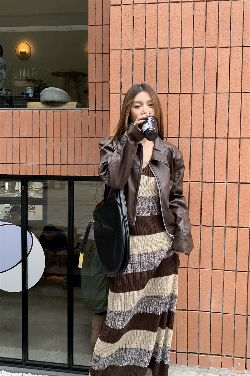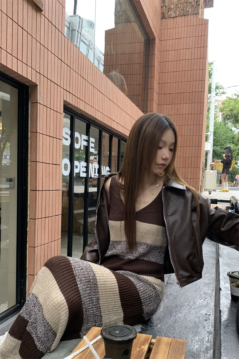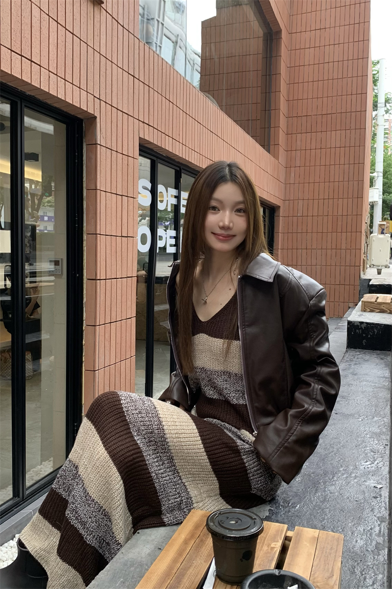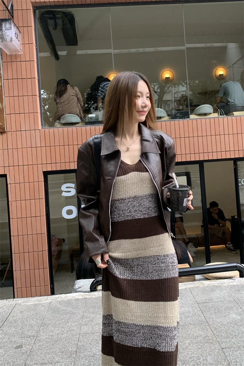 美拉德條紋針織連衣裙女春秋配皮衣打底毛衣裙慵懶垂墜感內搭長裙