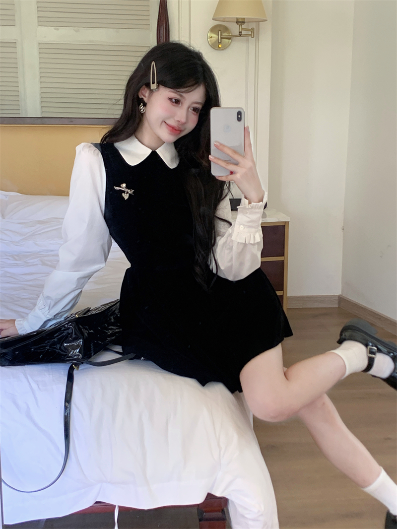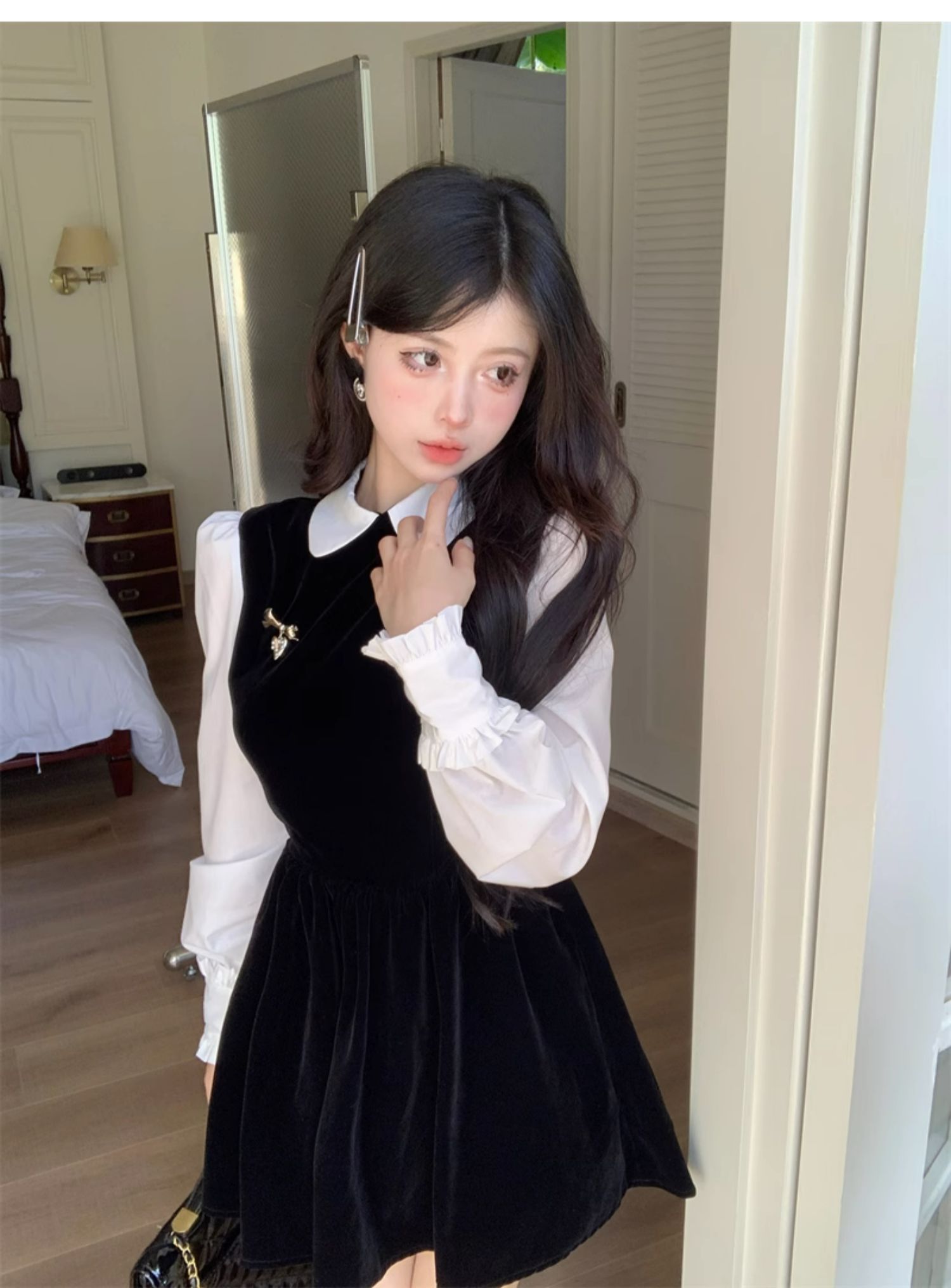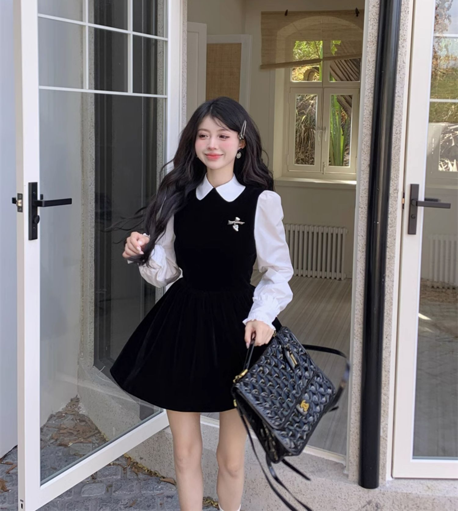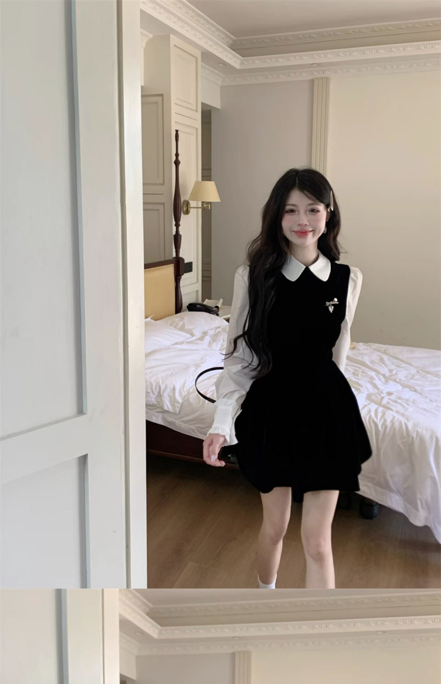 韓系溫柔風減齡高級感娃娃領長袖小黑裙小個子高級精緻連衣裙秋季