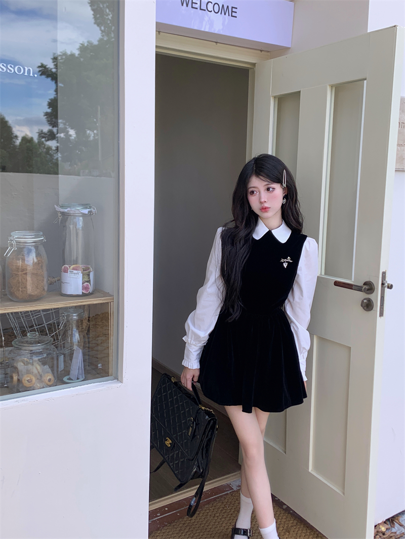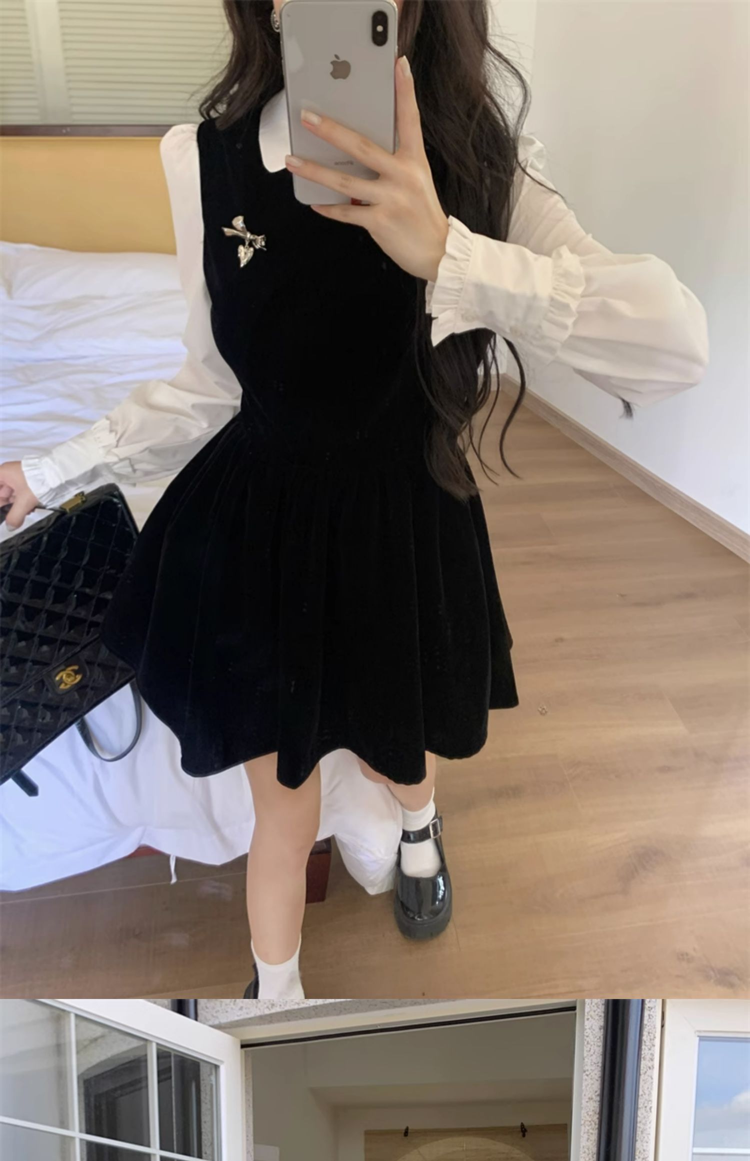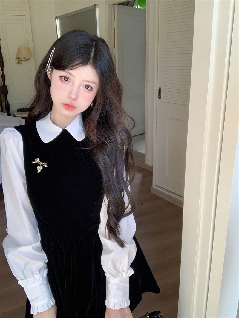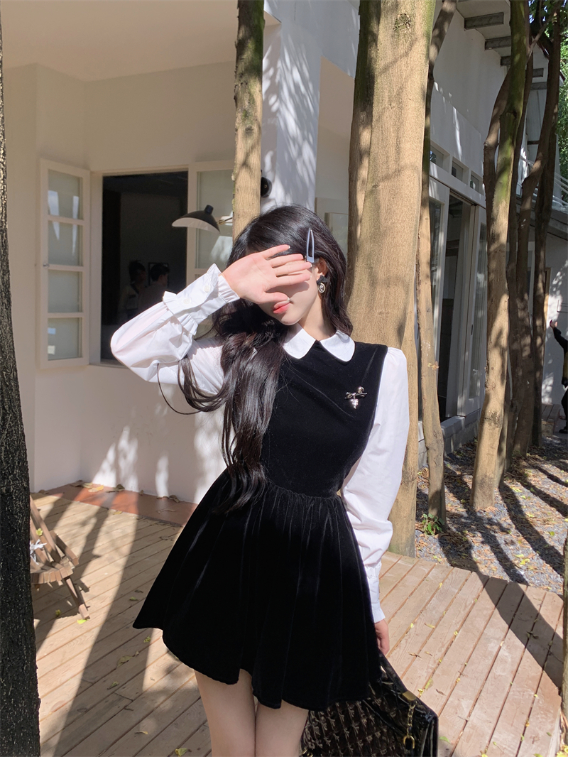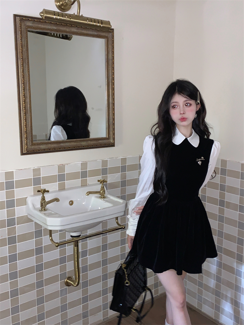 韓系溫柔風減齡高級感娃娃領長袖小黑裙小個子高級精緻連衣裙秋季