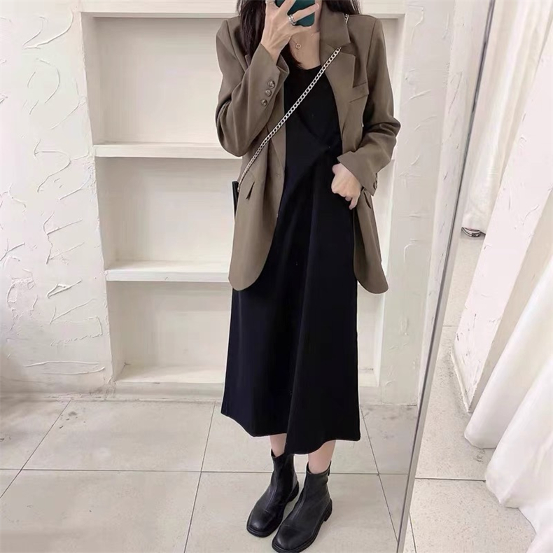 春秋新款大碼胖mm鹽系穿搭遮肉顯瘦西裝外套吊帶連衣裙兩件套裝女