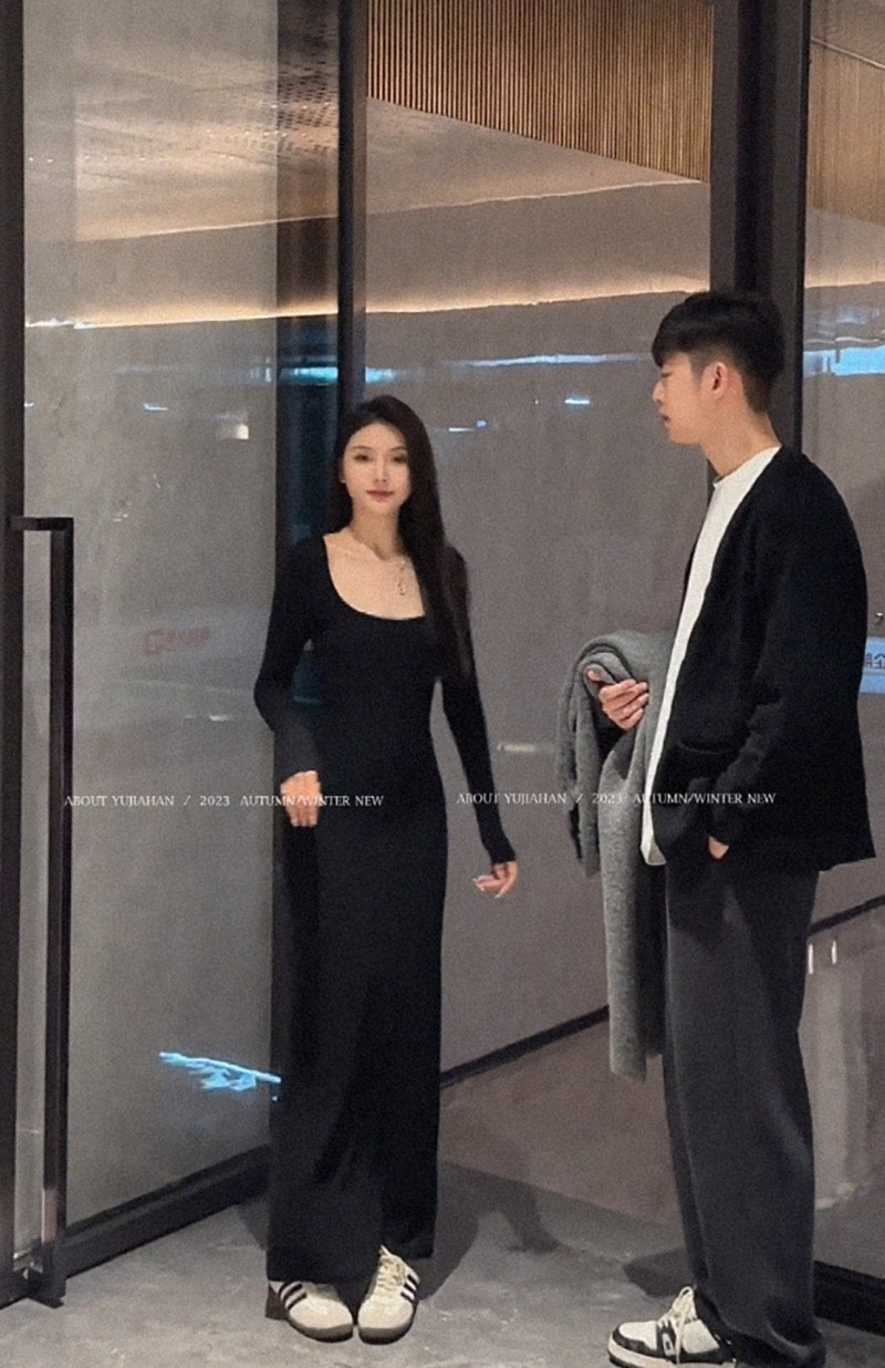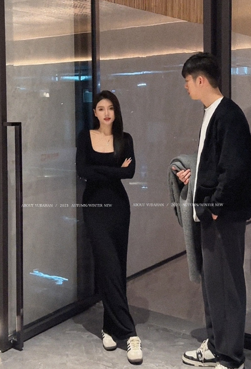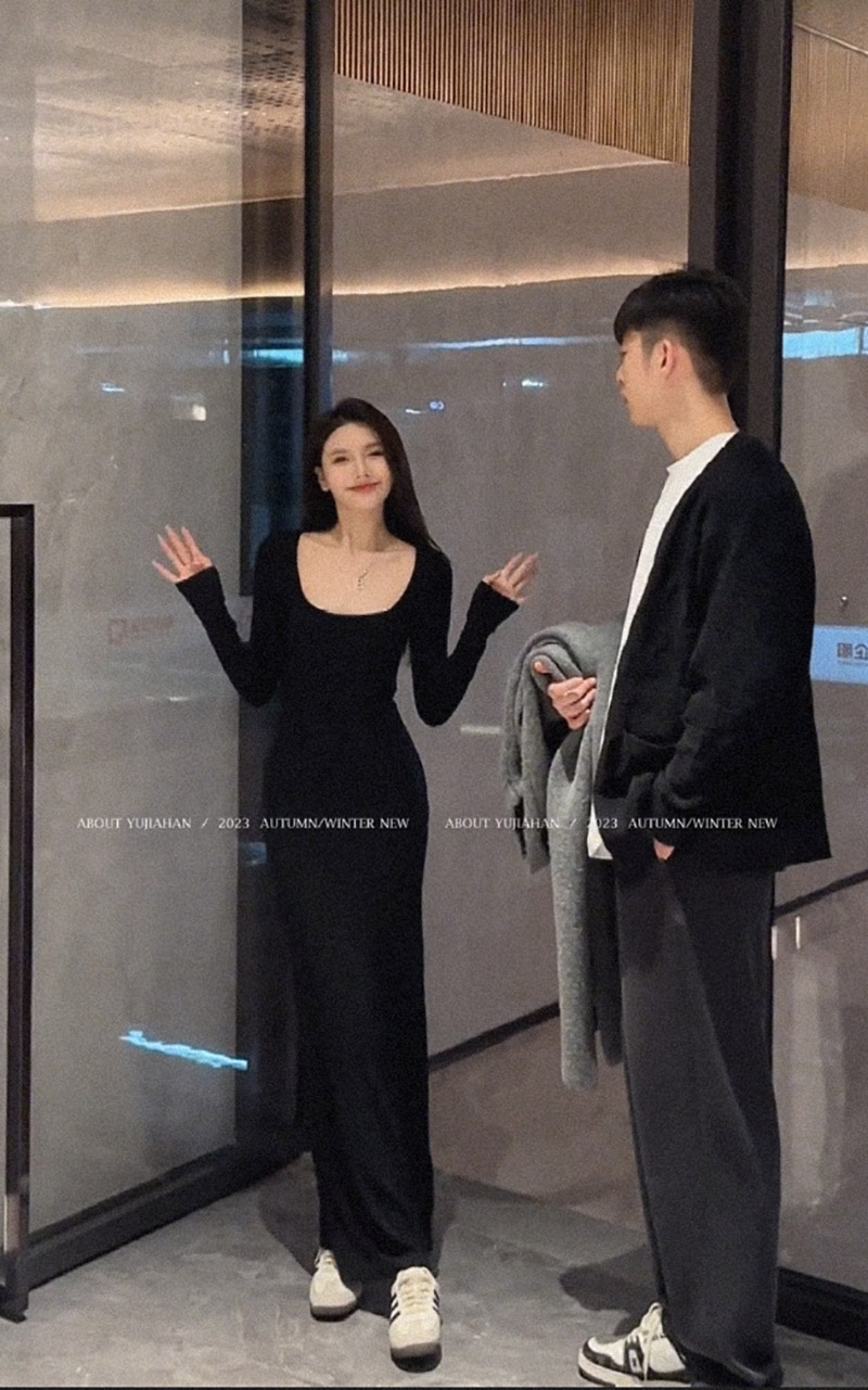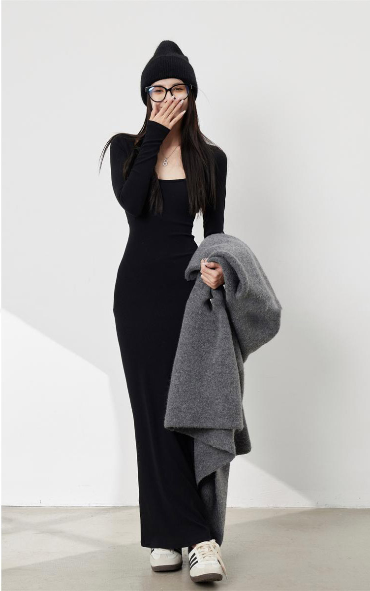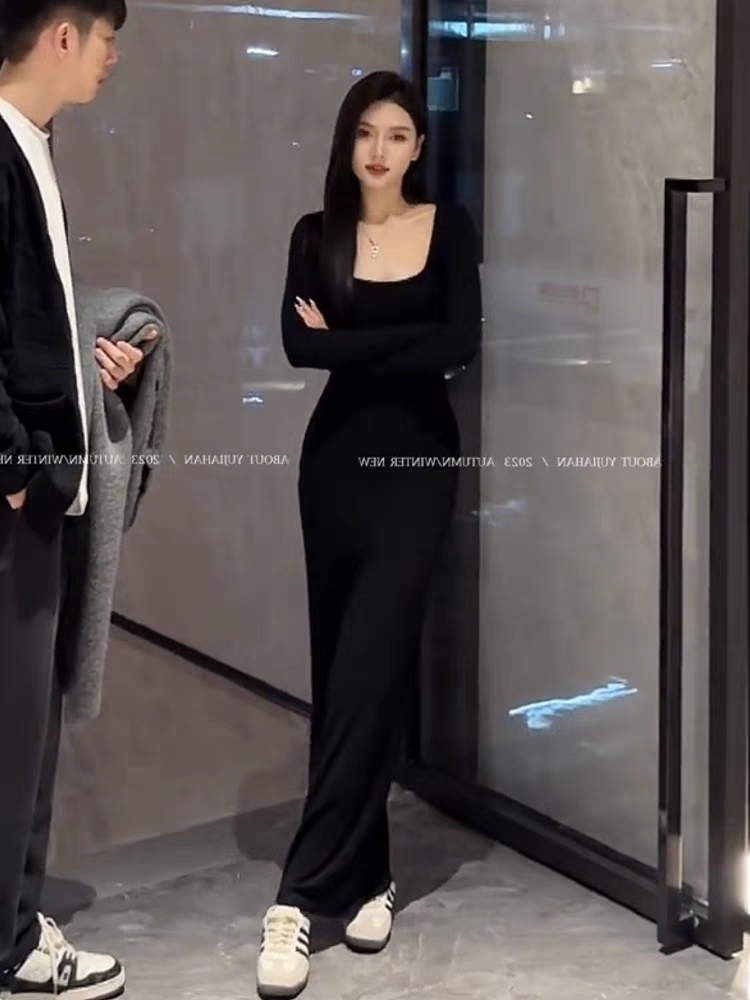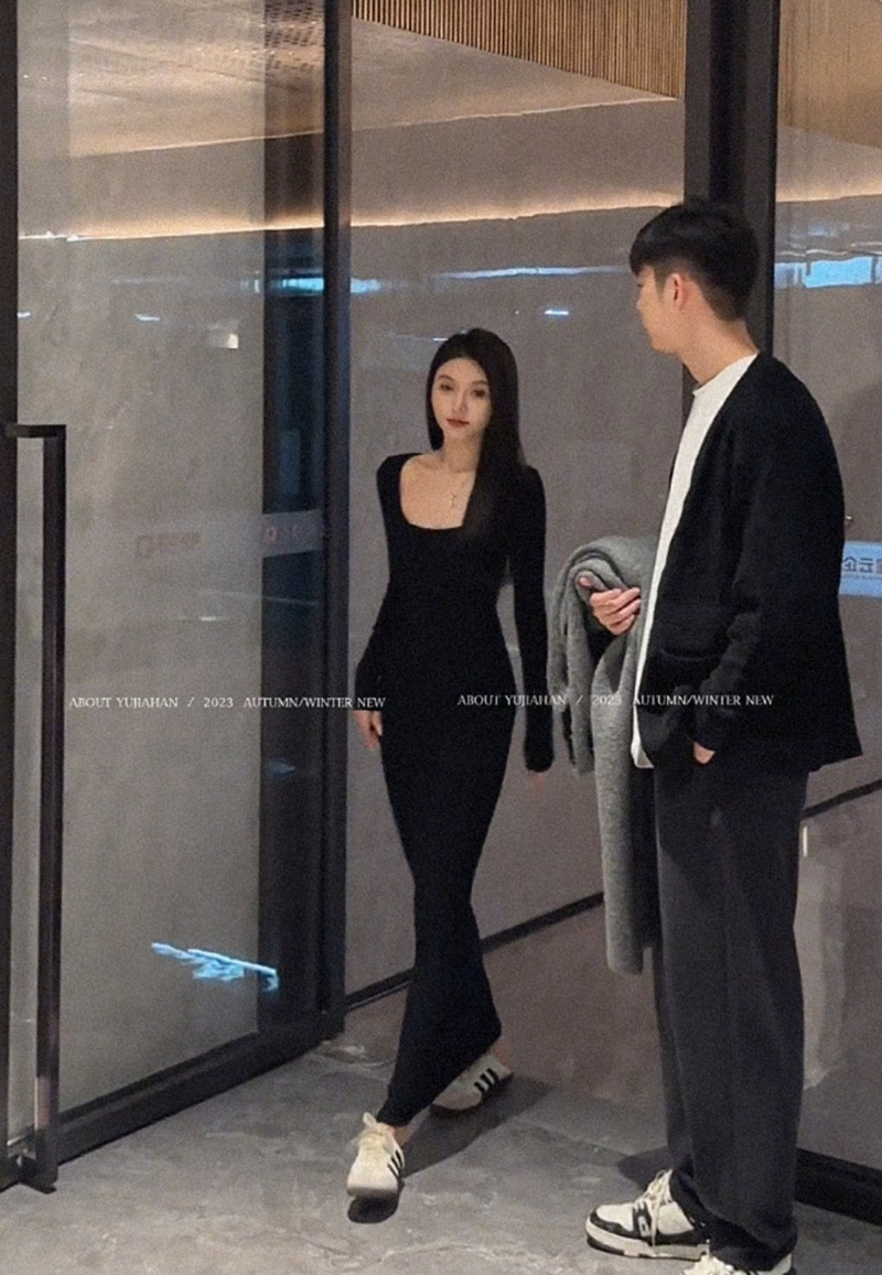 【棉磨毛高品質】黑色法式方領長袖修身打底連衣裙高級感長裙子
